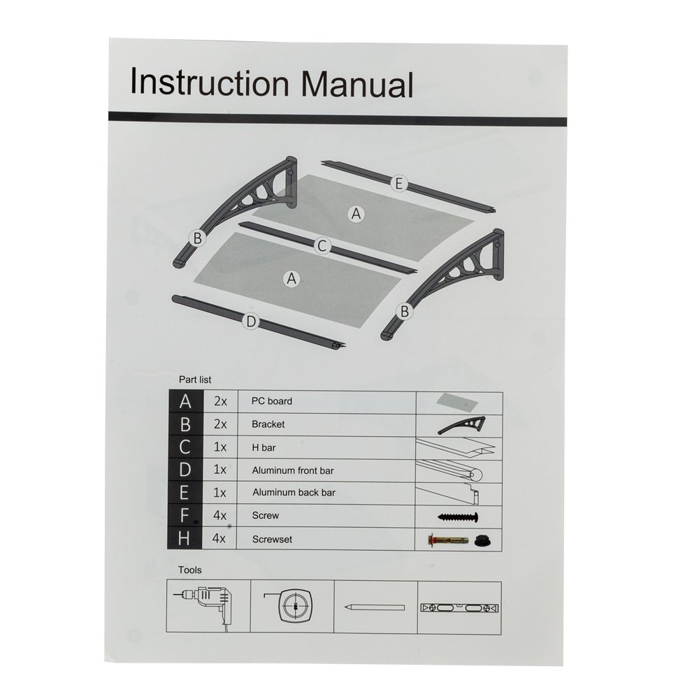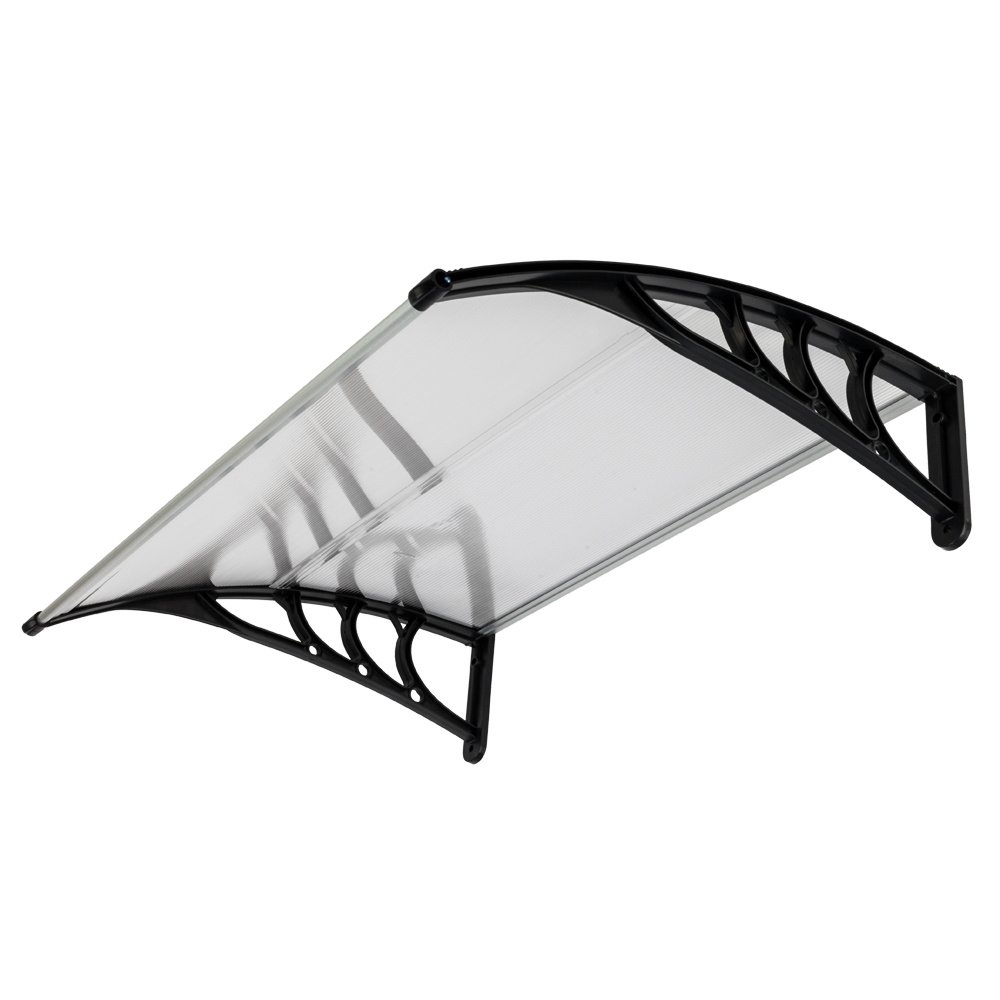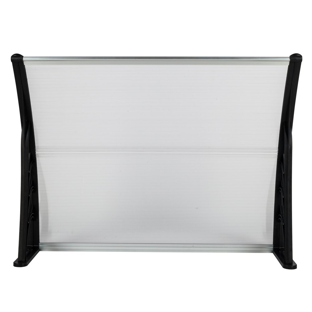 Introductions:Build a mini shelter for resisting rain or scorching sun at the gate or window! You may feel it wonderful by using our 100 x 80 Household Application Door & Window Rain Cover Eaves Canopy! This is a superb design integrating high-class ABS and polycarbonate materials, durable and wear-resistant to use. Aluminum bracket could strongly sustain this canopy. It bulges to shape a small shield. Quite easy to install and remove! It also acts a decoration for your house! Don't miss such a good chance!Features:1. Refine workmanship by using premium materials2. Guaranteed durability and quality, unused3. Solid structure, good strength and easy operation4. It is washable and quick dry5. Shape a small shield for resisting rain or scorching sun coming into your house6. Perfect for house decorationSpecifications:1. Brackets Material: ABS2. Hollow Sheet Material: 5.0mm Polycarbonate3. Fixing Bars Material: Aluminum4. Color: Black Bracket5. Dimensions: (39.37 x 31.5 x 9.06)" / (100 x 80 x 23)cm (L x W x H)6. Weight: 6.82 lbs /3.1kg7. Suitable for: Domestic Eaves CanopyPackage Includes:1 x Eaves Canopy