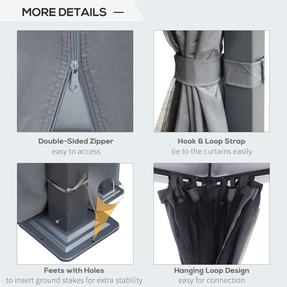 This metal gazebo features a polyester top and sidewall curtains for protection against sun, wind, light rain and prying eyes, and also mesh curtains to allow a view without annoying insects.