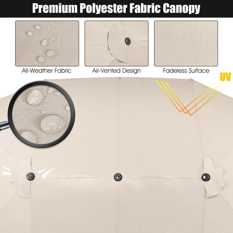 ● Double-Sided Canopy with Large Shade:The twin patio umbrella provides you and a set of outdoor furniture with sufficient coverage space, bringing a shady feel to a sultry afternoon. Besides, there are three air-vented holes on the top to promote the circulation for breeze creation.
