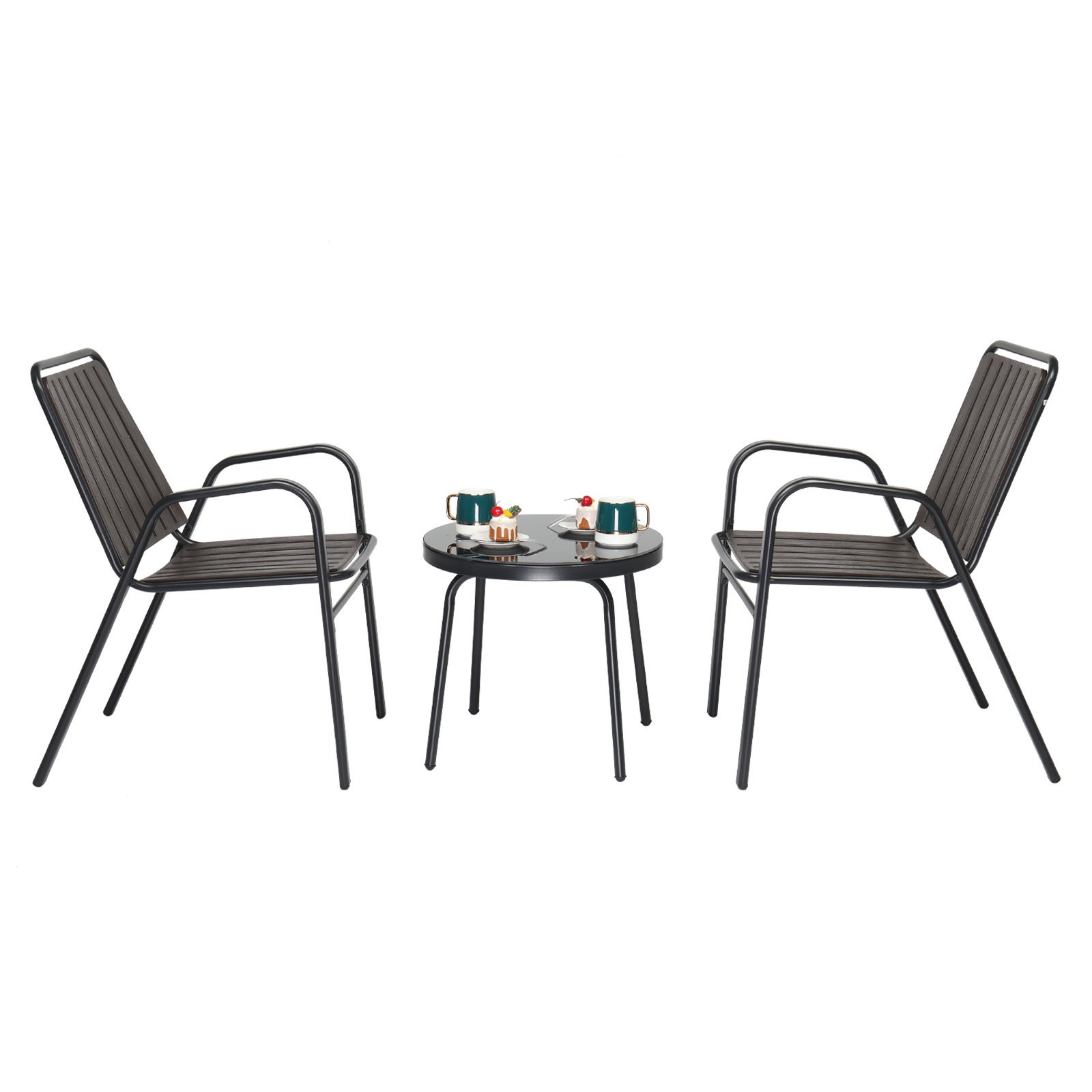 Introductions:Transform your outdoor space into a captivating oasis with our 3-Piece Bistro Table Set. Immerse yourself in the allure and sophistication of this stunning patio furniture ensemble. Crafted with meticulous attention to detail, this bistro set exudes timeless elegance and adds a touch of luxury to any outdoor setting. The sleek design and intricate detailing make it a true showstopper, while the stackable chairs offer a practical solution for effortless storage and versatility. Whether you're hosting intimate gatherings or simply enjoying some quiet time, this bistro set creates an inviting ambiance that will leave your guests in awe.Features:1. Heavy-Duty Construction: Crafted with a robust steel frame, this bistro set is built to to withstand various outdoor elements, ensuring long-lasting performance and minimal maintenance. The chair features high weight capacity up to 330 lbs to provide a secure and stable seating experience.2. Stackable Chairs: Easily stack and store the chairs when not in use, saving precious space on your patio or in your storage area.3. Ultimate Comfort: Sit back and relax in comfort with slightly curved seat and well-placed armrests that provide optimal support.4. Thoughtful Design: Rubber foot pads on the chairs and table legs prevent scratching and provide stability. Tempered glass tabletop is easy to wipe clean, perfect for enjoying meals, drinks, or casual conversations.5. Easy Assembly:Comes with high-quality hardware and a detailed instruction manual for quick, hassle-free installation.Specifications:1. Material: Steel, PP Plastic, Tempered Glass2. Color: Black Frame, Brown PP Plastic Board, Black Tempered Glass3. Chair Dimensions: - Overall Dimensions: (20.3 x 24.8 x 33.1) in / (51.5 x 63 x 84) cm - Seat Dimensions: (16.5 x 17.1 x 16.9) in / (42 x 43.5 x 43) cm - Backrest Dimensions: (16.9 x 16.9) in / (43 x 43) cm - Armrest Dimensions: (7.9 x 1.6) in / (20 x 4) cm - Armrest Height from Ground: 24.6 in / 62.5 cm4. Table Dimensions: (19.7 x 19.7 x 18.1) in / (50 x 50 x 46) cm5. Weight Capacity: - Chairs: 330 lbs / 150 kg - Table: 111 lbs / 50 kg6. Net Weight: 37.5 lbs / 17 kgPackage Includes:2 x Outdoor Dining Chairs1 x Table1 x Set of Hardware1 x Instruction Manual