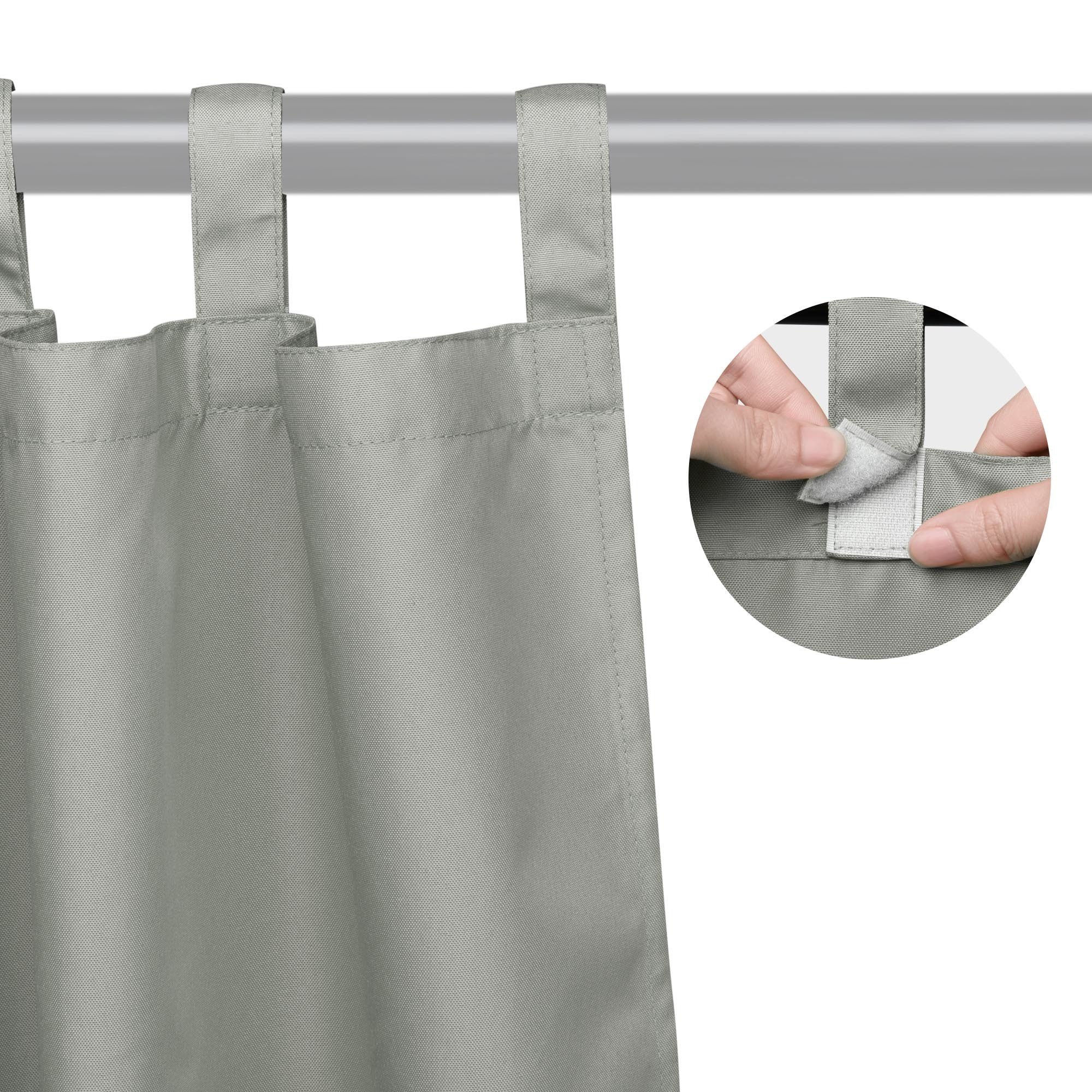 - Hook & Loop Fastener for Easy Installing - 4 pcs 54"x84" Outdoor Curtain Panel, tab top with hook & loop fastener, much easier for attaching to the rod, 4" long tab top perfectly fit curtain rod with diameter up to 2"- UV 30+ Protection & Fade Resistance - Effectively blocks 96.6% of harmful UV ray, enjoy the outdoor view and fresh air without worrying burning sunlight; Color fastness up to European Standard level 4 keeps original color under sun exposure for a long-lasting beauty- Durable Fabric - 160g polyester fabric with PA coating features wrinkle and wear resistance; Water resistance also for protecting you from drizzling- Convenient to Maintain - Machine-washable for easy cleaning; Simply put it into washing machine for cleanout, spending no time on exhausting maintaining- Wide Application - Compatible with pergola to create an elegant and vintage outdoor decoration, protects your privacy and reduce the temperature by shading on sunny days; Great for spending your leisure time and enjoying the fresh air at courtyard, patio, garden, lanai, porch, or any other outdoor area