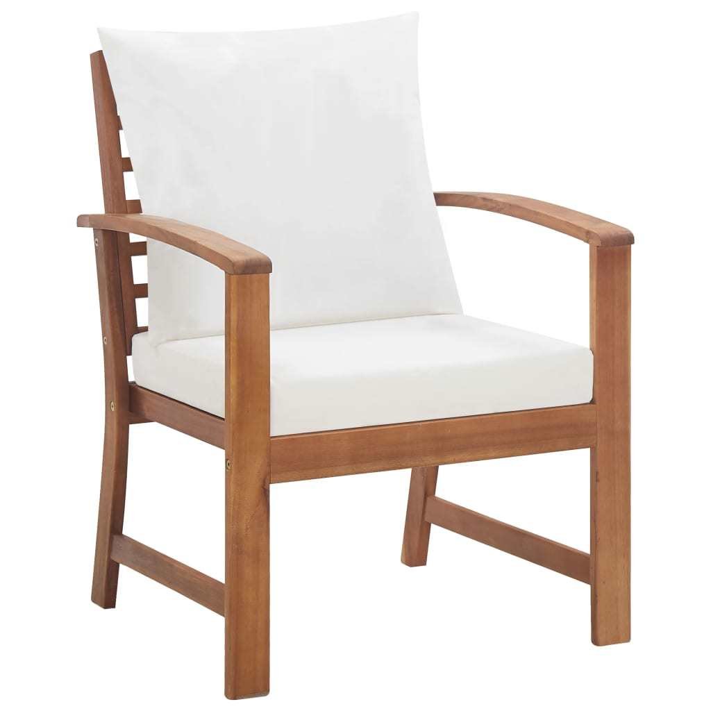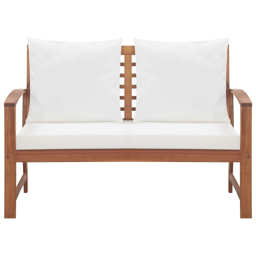 Delivery includes 1 table, 1 bench, 2 chairs, 4 seat cushions and 4 back cushions. The garden furniture set needs assembly.Cushion Color: Cream whiteMaterial: Solid acacia wood with an oil finishCushion cover material: 100% polyesterTable dimensions: 39.4" x 19.7" x 13" (L x W x H)Bench dimensions: 47.2" x 24" x 31.9" (W x D x H)Chair dimensions: 23.8" x 24" x 31.9" (W x D x H)Seat width of bench: 43.1"Seat width of chair: 19.9"Seat depth: 17.9"Seat height from the ground: 12.6"Armrest height from the ground: 23.4"Seat cushion thickness: 3.1"Back cushion thickness: 5.9"Delivery contains:1 x Table1 x Bench2 x Chair4 x Seat cushion4 x Back cushion