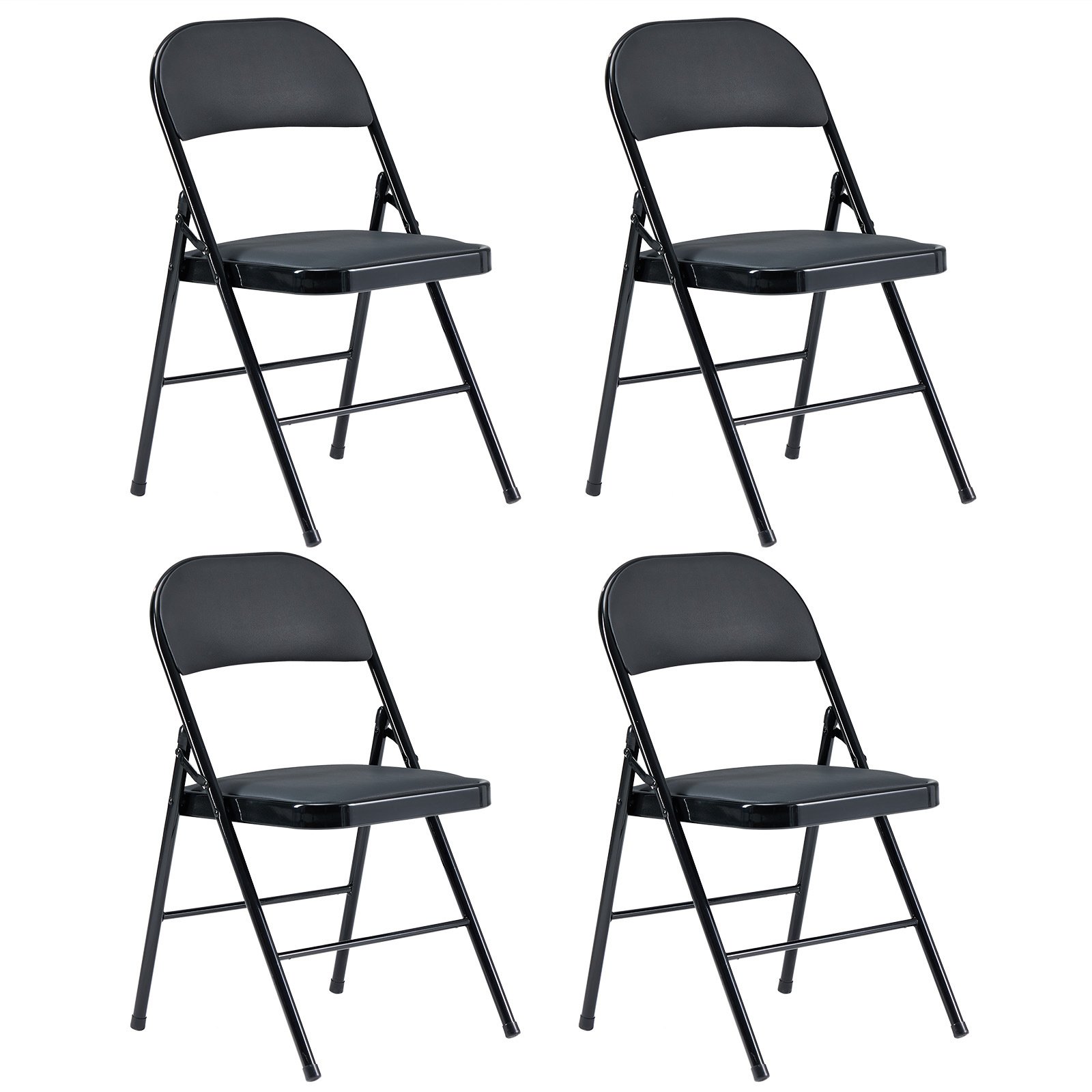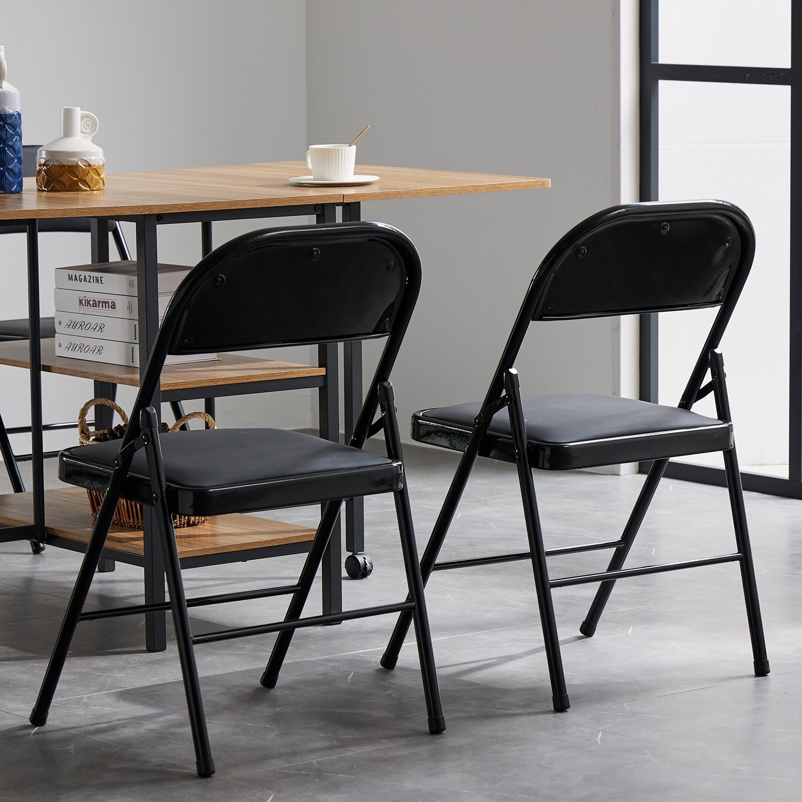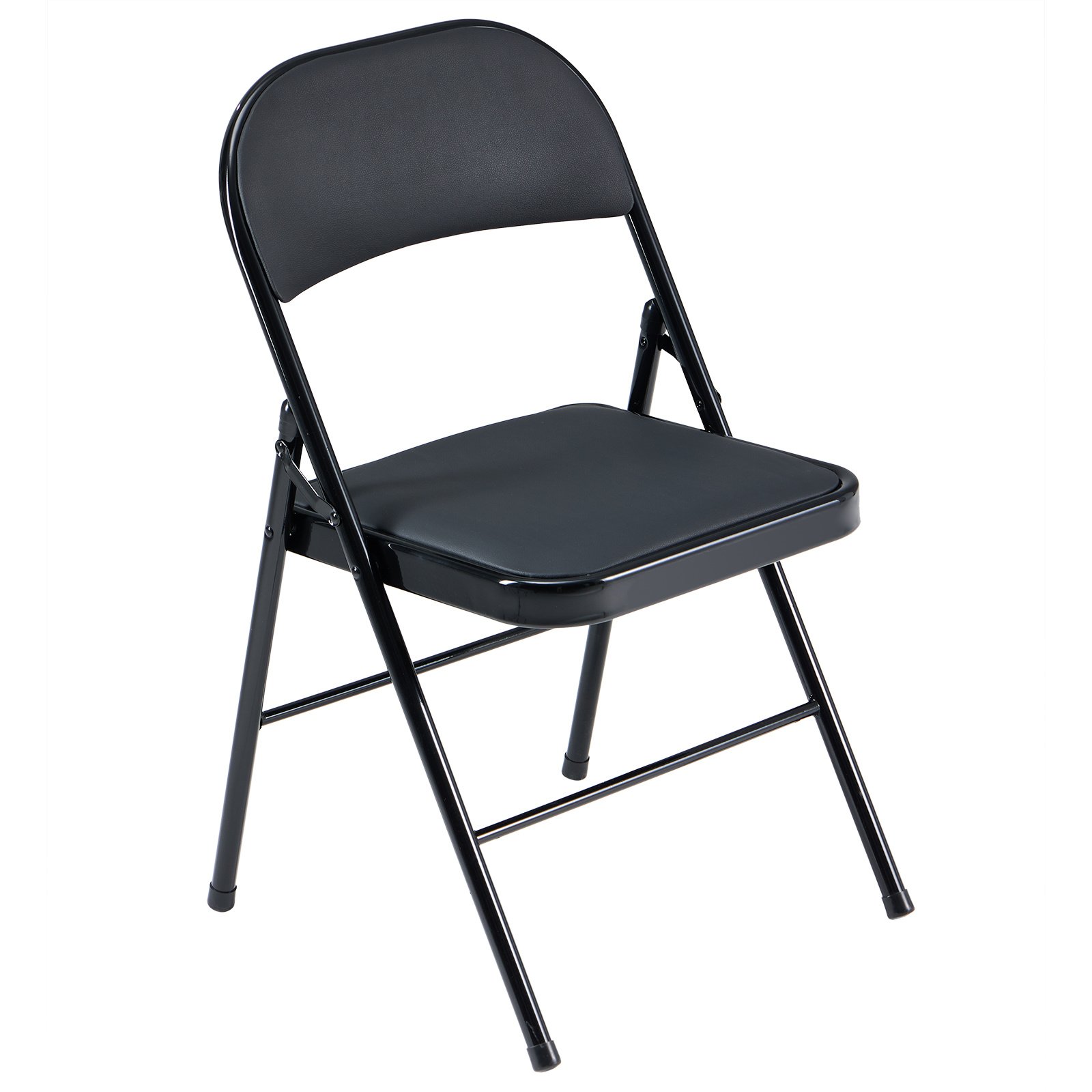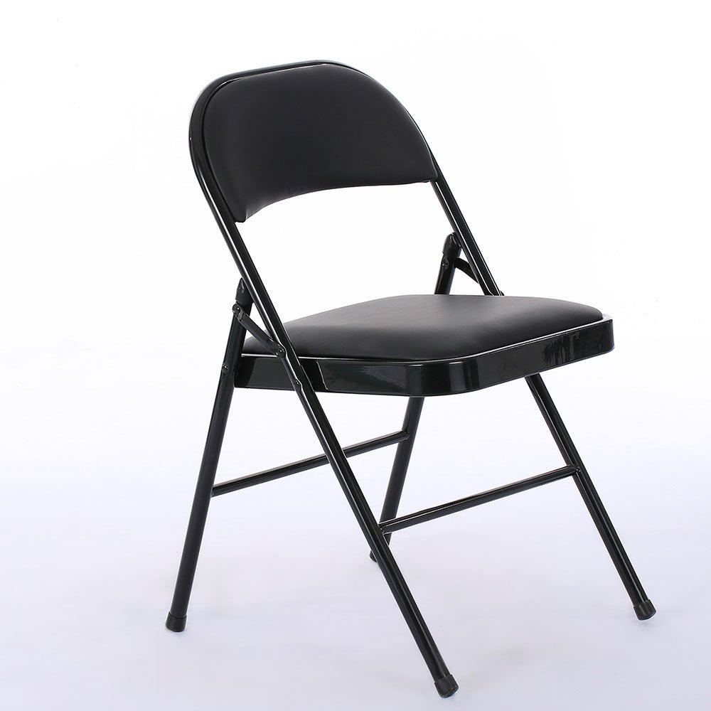 Introductions:This simple style chair combined steel and PVC is suitable for dining room, living room, reception room, exhibition and other places. Sponge filled cushions and backrest give you a more comfortable experience. Sturdy steel frame, two cross - supporting structure can improve the stability of the chair, which makes the chair durable. Steel folding chairs are essential for entertaining guests at large games, parties or events. And they are the best choice when you need additional seats. After use, folding chairs are folded and compact for easy folding and storage. The chairs have smooth surfaces, which is easy to clean. The plastic tube sleeves on chair legs can effectively protect your floor and prevent scratching.Features:1. Sturdy and durable steel frame with weight capacity of 150KG2. Comfortable and soft PVC cushion and backrest, filled with sponge3. Chairs are easy to carry, foldable and compact, convenient for transportation and storage4. Plastic tube sleeves can protect your floor and prevent it from scratching5. If you have any questions or worries about your order, please keep in touch with us and we will provide you with timely and satisfactory solutionsSpecifications:1. Color: Black2. Dimensions: (15.75 x 17.72 x 30.71)'/ (40 x 45 x 78)cm (L x W x H)3. Seat Dimensions: (15.75 x 15.75)" / (40 x 40)cm (L x W)4. Backrest Dimensions: (17.32 x 7.09)" / (44 x 18)cm (L x W)5. Material: Iron Tube & PVC6. Weight Capacity: 330lbs / 150kg7. Each Chair Weight: 8.38lbs / 3.8kgPackage Includes:4 x Foldable Chairs
