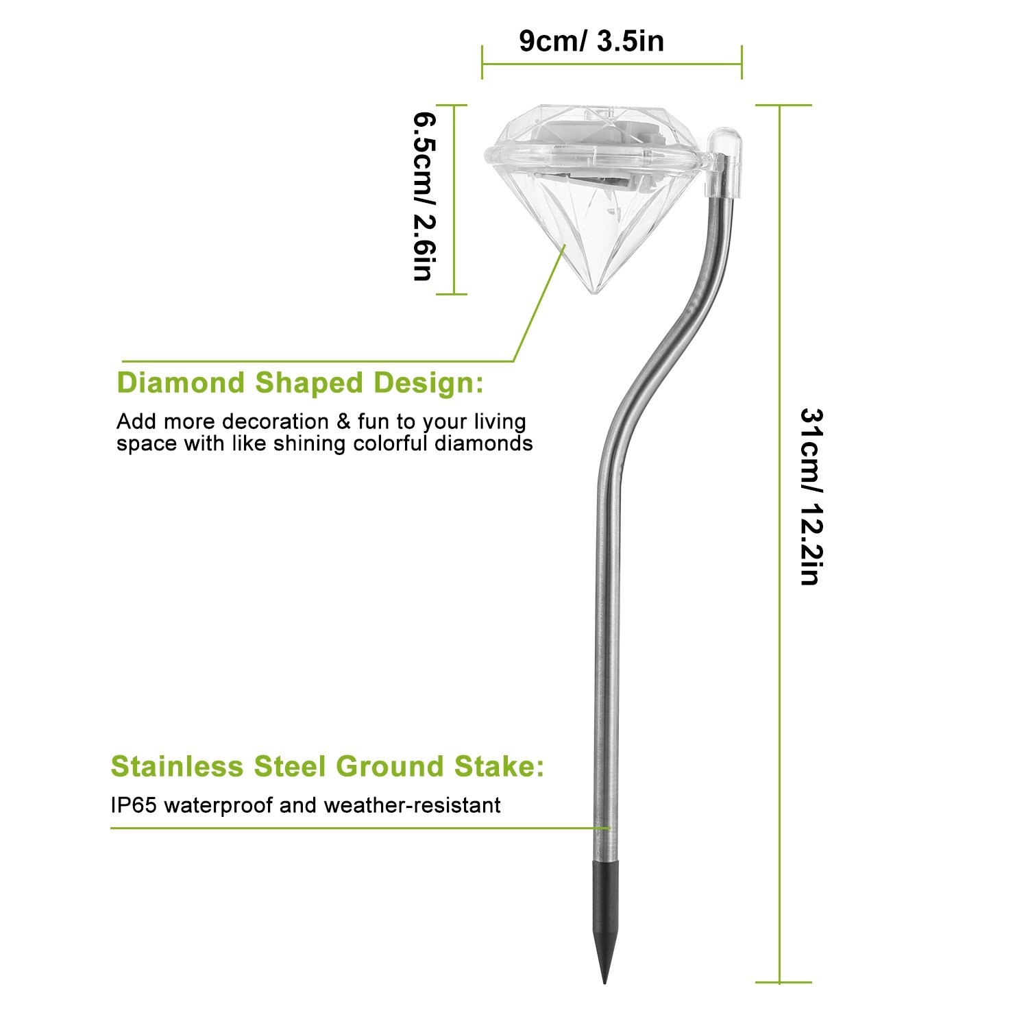 **IP65 WATERPROOF & WEATHER-RESISTANT*:The diamond solar garden lights are designed with high-quality stainless steel poles,premium ABS plastic,which feature IP65 waterproof and work great in heatproof,weather-resistant and are able to survive heat,rain,cold and frost.