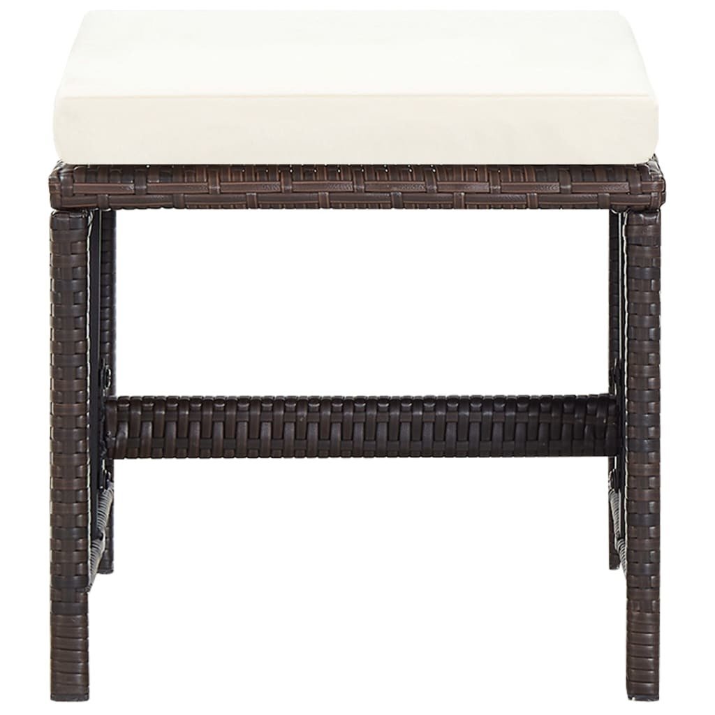 Rattan color: BrownCushion color: Cream whiteMaterial: Steel frame + PE rattan + glass tabletopCushion material: Polyester cover with foam fillingTable dimensions: 48.4" x 23.6" x 29" (L x W x H)Chair dimensions: 20.5" x 22" x 33.5" (W x D x H)Seat depth: 15.7"Seat width: 18.3"Seat height from the ground: 17.3"Armrest height from the ground: 26.4"Stool dimensions: 16" x 16" x 13.8" (W x D x H)Cushion thickness: 2"Cushion covers are removableDelivery includes:1 x Table2 x Chair2 x Stool6 x CushionWARNING Cushion and pad are only for outdoor use. Do not take them inside of dwelling