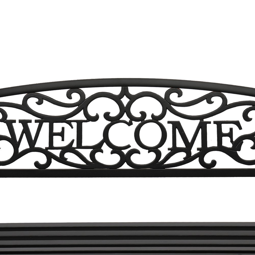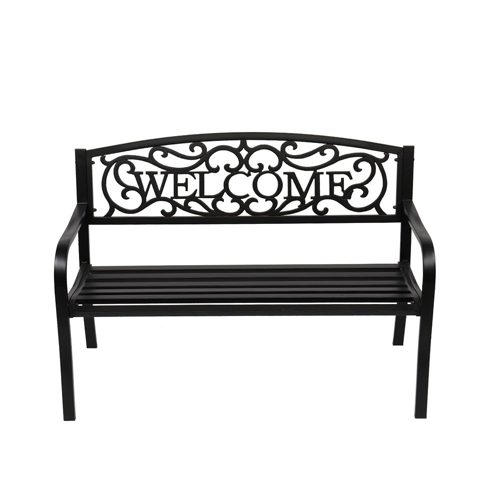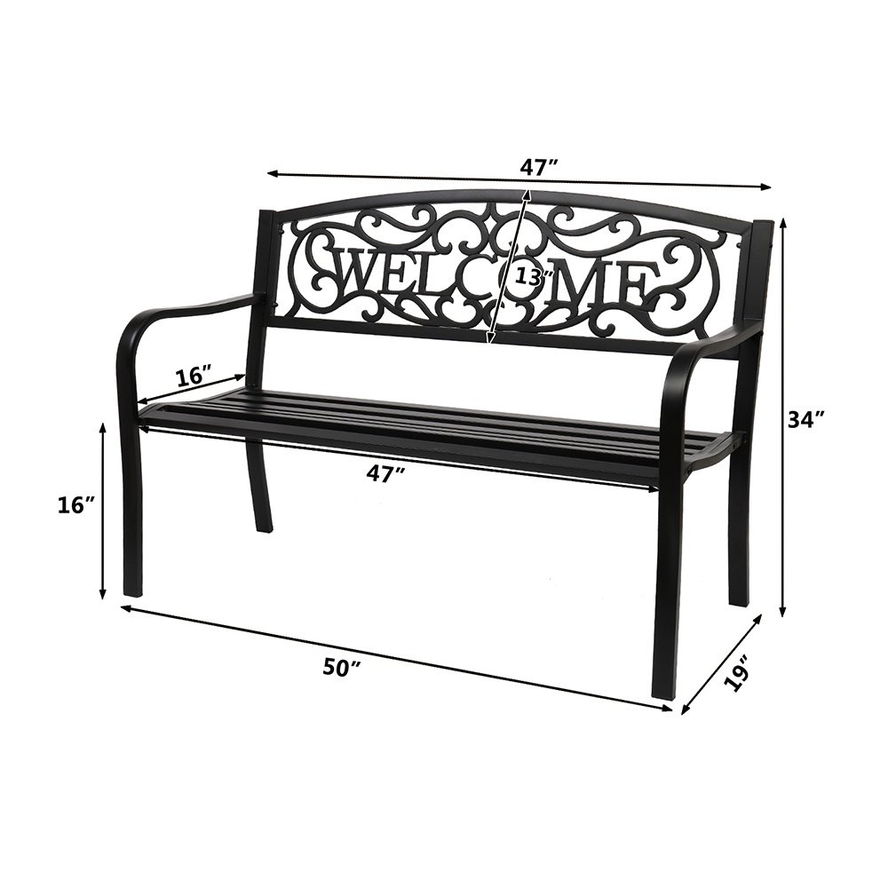 Introductions:Here is our 50" Outdoor Welcome Backrest Cast Iron&PVC Bench. Lounge comfortably or read a good book on this beautifully designed bench. It will fit perfectly on your backyard, porch, and path, or near your entrance and driveway. Antique style adds a touch of elegance to any outdoor area. Curved armrests with a sloped slatted seat offer optimal comfort. Powder-coat iron construction provides years of durability as well as easy maintenance. What are you still hesitating about? Order now!Features:1. Powder-coat iron construction for years of durability2. Curved armrests with a sloped slatted seat offer optimal comfort3. All finished edges to ensure safety, no raw cuts or drips to catch on clothing4. Fit perfectly with any outdoor decor5. Easy to assemble, easy to clean with a wet or dry clothSpecifications:1. Material: Iron(Frame)& Pvc(Backrest)2. Color: Black3. Load Bearing: 750lbs / 337.5kg4. Design: Backrest Pattern "Welcome"5. Dimensions: (50 x 24.02 x 33.07)" / (127 x 61 x 84)cm(L x W x H)6. Weight: 29.54lbs / 13.4kgPackage Includes:1 x 50" Outdoor Welcome Backrest Cast Iron&Pvc Bench