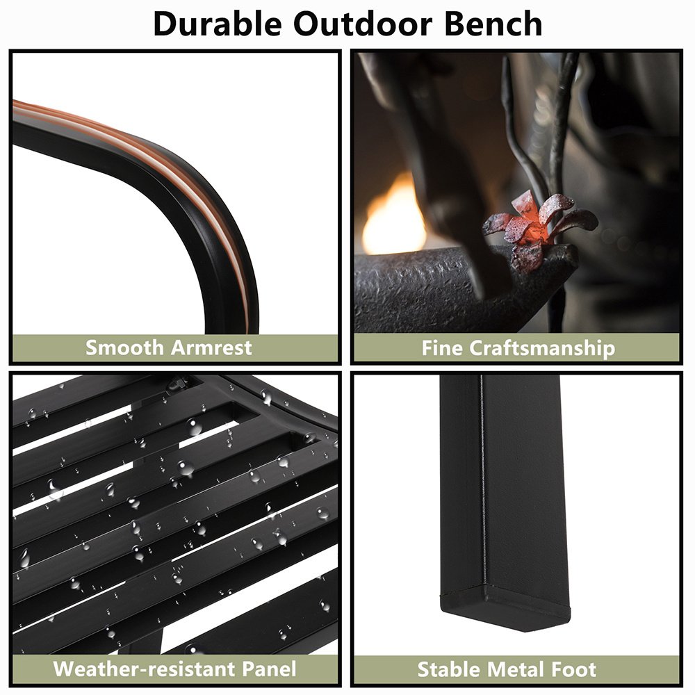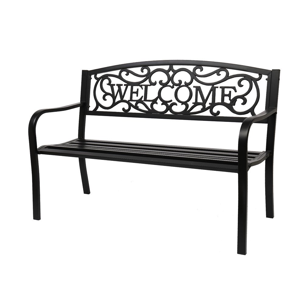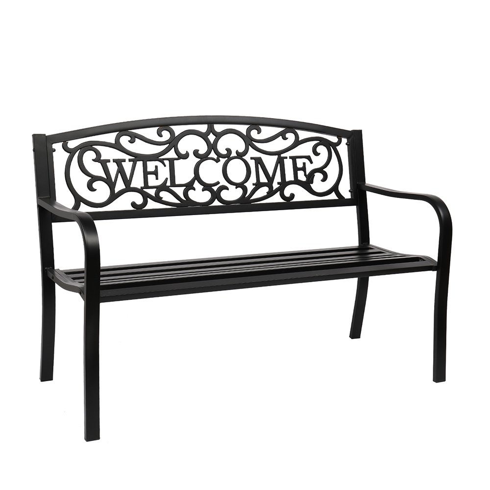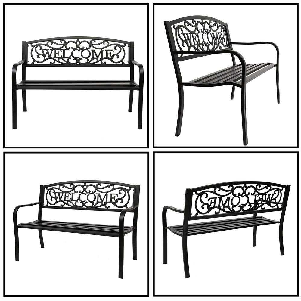 Introductions:Here is our 50" Outdoor Welcome Backrest Cast Iron&PVC Bench. Lounge comfortably or read a good book on this beautifully designed bench. It will fit perfectly on your backyard, porch, and path, or near your entrance and driveway. Antique style adds a touch of elegance to any outdoor area. Curved armrests with a sloped slatted seat offer optimal comfort. Powder-coat iron construction provides years of durability as well as easy maintenance. What are you still hesitating about? Order now!Features:1. Powder-coat iron construction for years of durability2. Curved armrests with a sloped slatted seat offer optimal comfort3. All finished edges to ensure safety, no raw cuts or drips to catch on clothing4. Fit perfectly with any outdoor decor5. Easy to assemble, easy to clean with a wet or dry clothSpecifications:1. Material: Iron(Frame)& Pvc(Backrest)2. Color: Black3. Load Bearing: 750lbs / 337.5kg4. Design: Backrest Pattern "Welcome"5. Dimensions: (50 x 24.02 x 33.07)" / (127 x 61 x 84)cm(L x W x H)6. Weight: 29.54lbs / 13.4kgPackage Includes:1 x 50" Outdoor Welcome Backrest Cast Iron&Pvc Bench