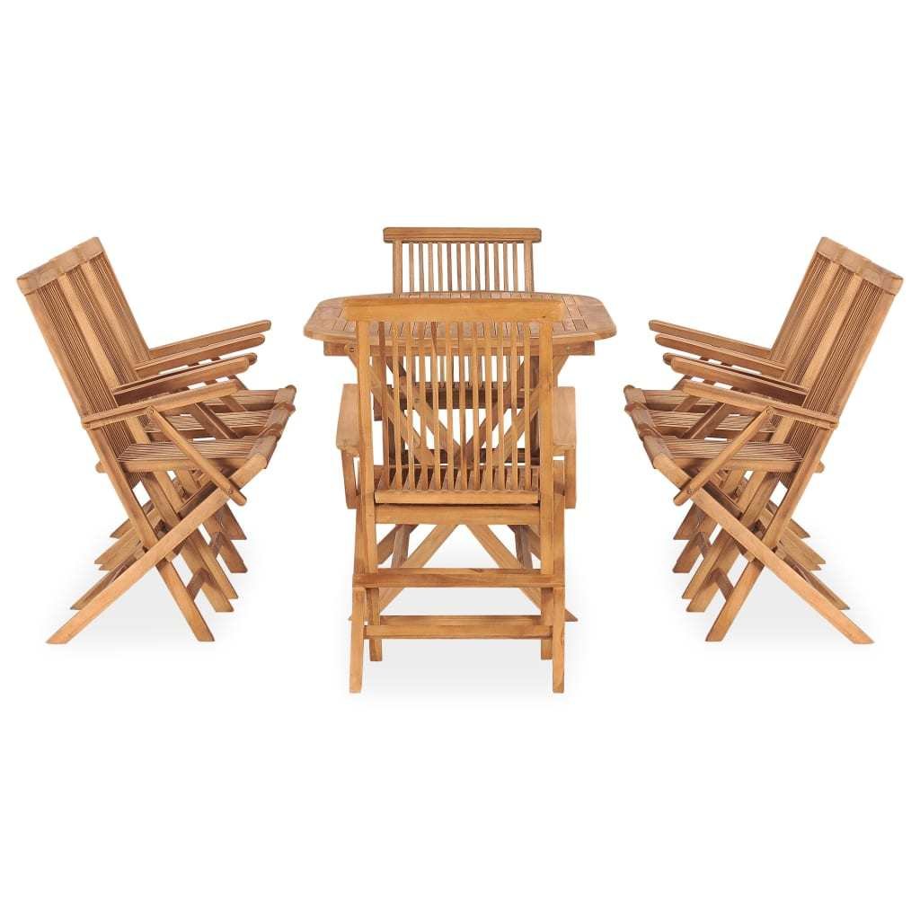 This piece of teak furniture, constructed from extremely durable teak hardwood, is seasoned, kiln-dried and fine sanded to give a very smooth appearance. Teak wood is known for its exceptional strength and weather resistance, making it far more suitable for patio furniture than any other kind of wood. Teak wood is the perfect choice if you want to purchase a long-lasting piece of patio furniture. The dinner table and chairs can be folded to save space when not in use.Table:Material: Fine sanded teak hardwood (untreated)Dimensions (unfolded): 63" x 31.5" x 29.5" (L x W x H)Dimensions (folded): 63" x 7.1" x 41.3" (L x W x H)Assembly required: YesChair:Material: Fine sanded teak hardwood with waterbase finishChair dimensions (unfolded): 21.7" x 23.6" x 35" (W x D x H)Chair dimensions (folded): 21.7" x 3.5" x 42.9" (W x D x H)Seat width: 19.7"Seat depth: 16.5"Seat height from the ground: 17.7"Armrest height from the ground: 26"Assembly required: NoDelivery contains:1 x Folding table8 x Folding chair
