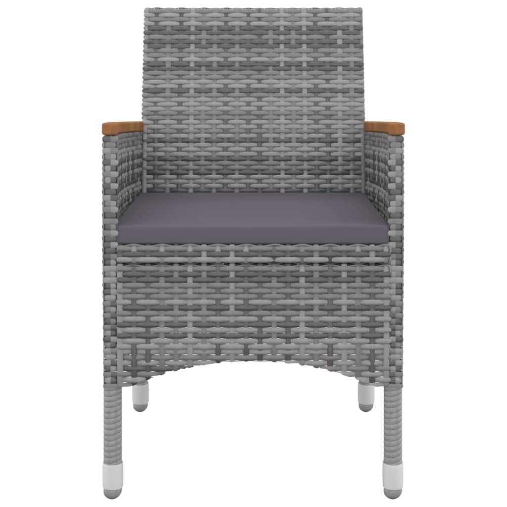 Note: In order to extend the life of your outdoor furniture, we recommend you to protect it with a waterproof cover.Poly rattan color: GrayCushion color: Dark grayTable color: BlackMaterial: PE rattan, steel, glass, solid acacia woodCushion material: Fabric (100% polyester)Table dimensions: 78.7" x 39.4" x 29.1" (L x W x H)Chair dimensions: 24" x 23.6" x 34.6" (W x D x H)Seat size: (16.9"-18.5") x 18.5" (W x D)Seat height from the ground: 16.9"Armrest height from the ground: 24.8"/25.6"Seat cushion thickness: 2"Weather-resistantAssembly required: YesDelivery contains:1 x Table8 x Chair8 x Seat cushion