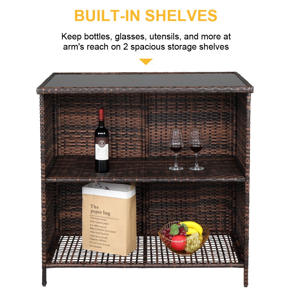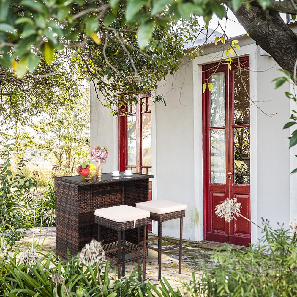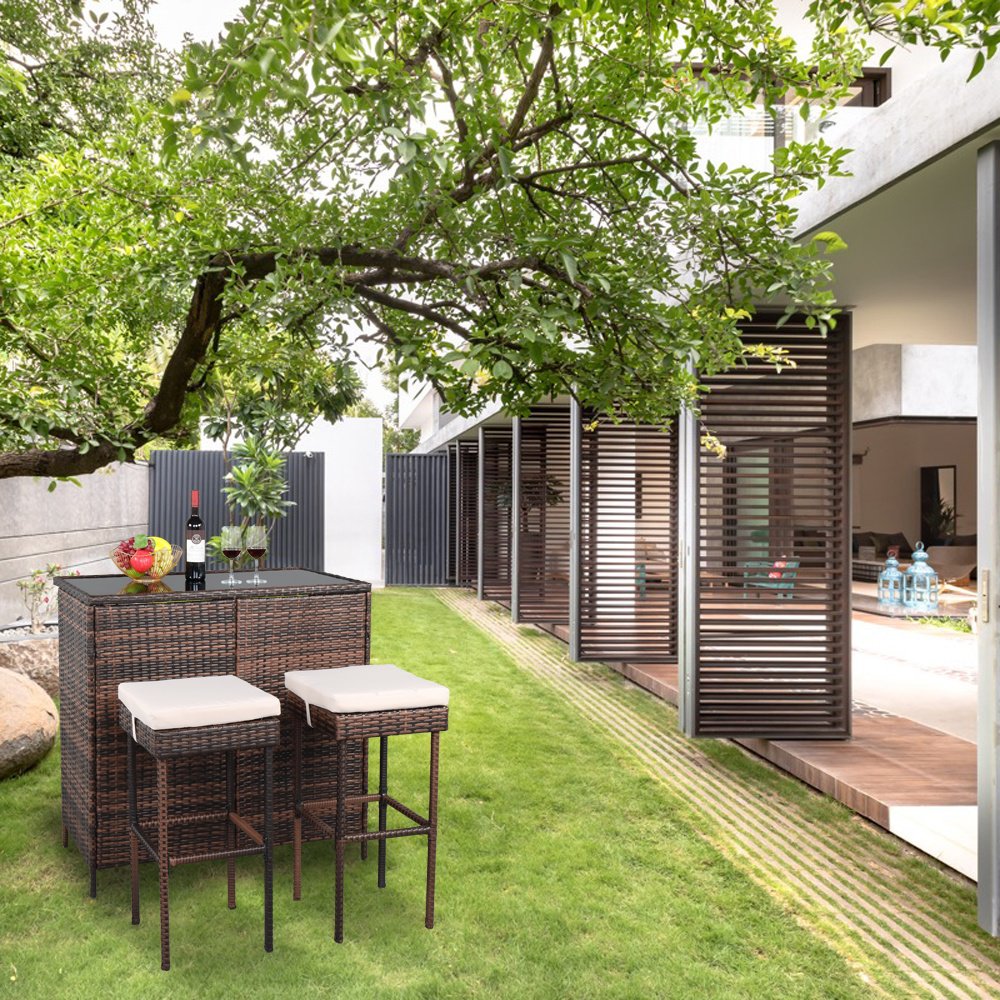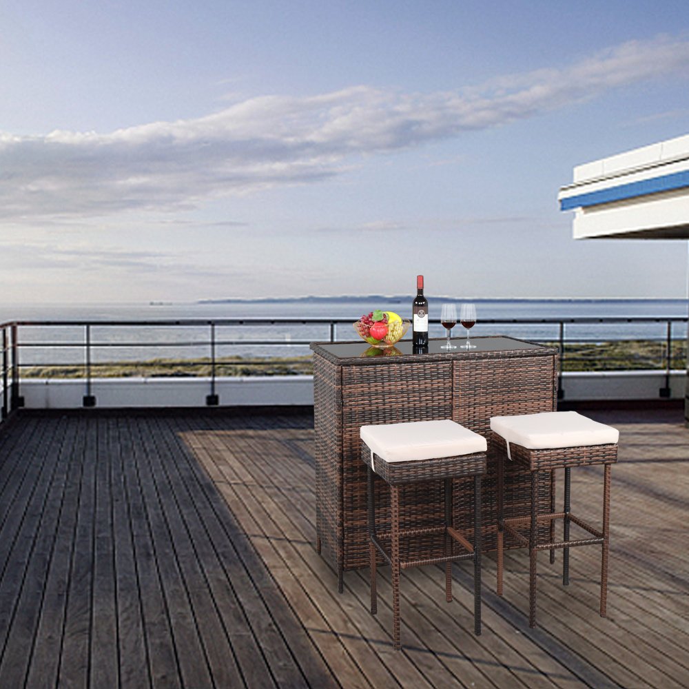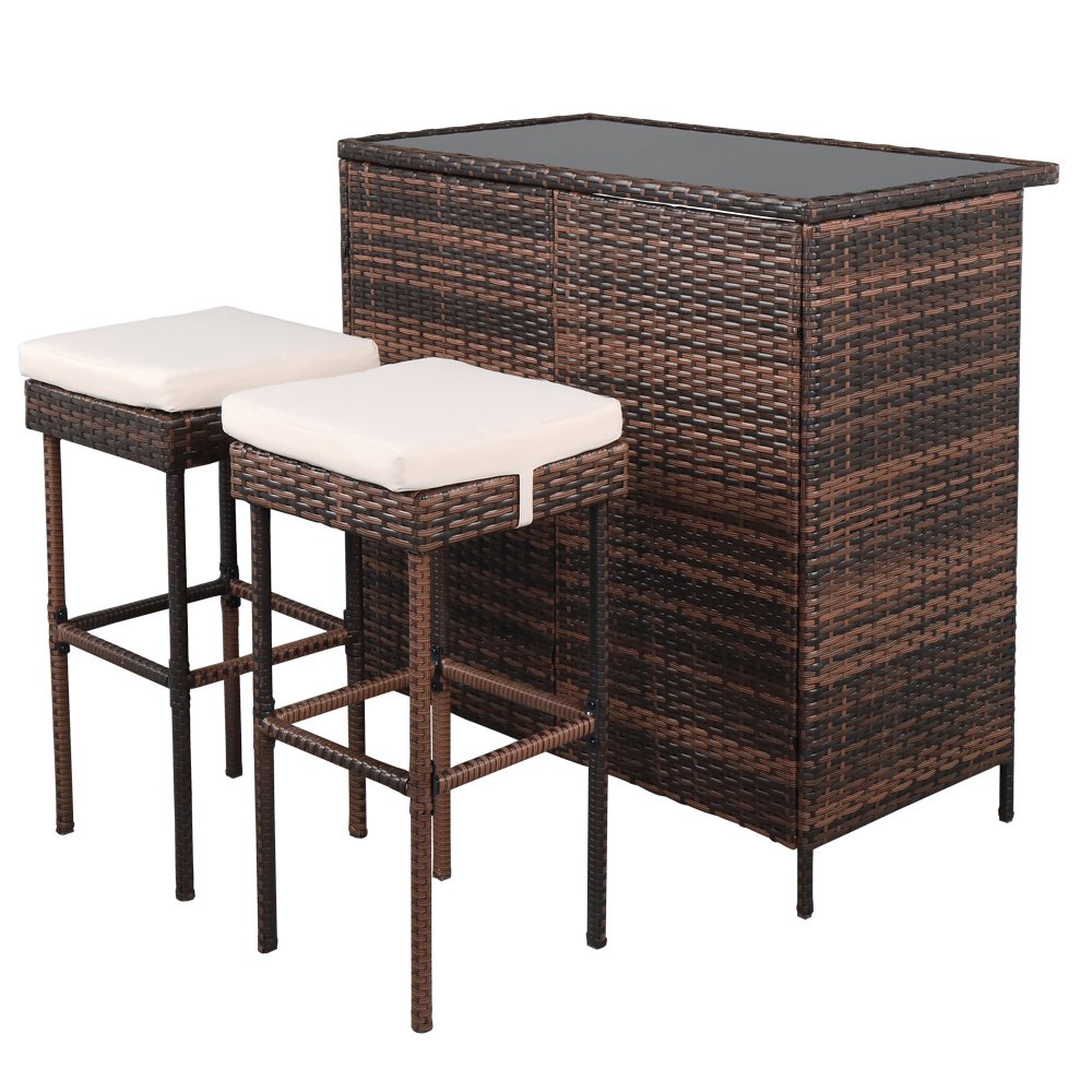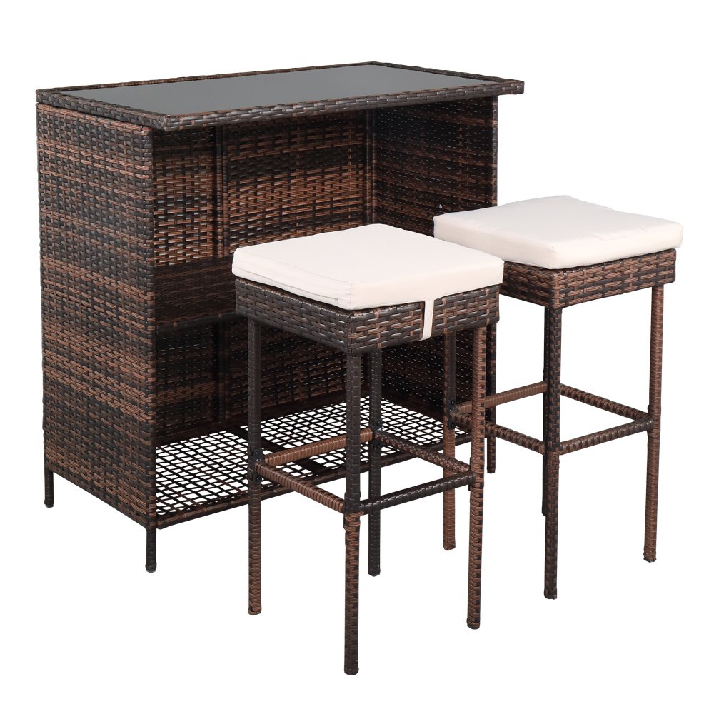 Introductions:Are you looking for a comfortable table and chair set for your family? If so, this Bar Table And Bar Stool Three-Piece Set is highly recommended to you. Unlike normal leather chair, this rattan chair will give you a different using experience. Adopting high quality PE rattan and iron frame, it features stable, sturdy and durable. It includes 2pcs bar chairs, 1pc rattan bar table, which can meet your daily demand. So what are you waiting for? Don't hesitate, it's worth buying!Features:1. Made of high quality PE rattan and iron frame, stable, sturdy and durable2. It has a long service time, durable in use3. This chair set can meet your daily need4. Soft cushion ensures comfortable seating experience5. Concise design and exquisite workmanship6. It can coordinate with any style of decorationSpecifications:1. Material: PE Rattan Iron Sponge Polyester Cloth Tempered Glass2. Color: Brown Gradient Rattan Beige Seat Cushion Black Glass3. Product Specifications:The Table:Overall Size: (40.16 x 23.23 x 39.76)" / (102 x 59 x 101)cm(L x W x H)Bottom Plate: (38.19 x 18.5 x 4.72)" / (97 x 47 x 12)cm(L x W x H)Intermediate Plate: (38.19 x 18.5 x 21.65)" / (97 x 47 x 55)cm(L x W x H)Glass: (38.27 x 21.34 x 0.2)" / (97.2 x 54.2 x 0.5)cm(L x W x H)Bench:Overall Size: (14.96 x 14.96 x 27.56)" / (38 x 38 x 70)cm(L x W x H)Feet Spacing: 34 x 34cmFoot Height: 32.5cmThickness Of Cushion: 5cm4. Product Load-Bearing:Table: 220.46lbs / 100kgStool: 330.69lbs / 150kg5. Weight: 57.32lbs / 26.6kgPackage Includes:1 x Table2 x Stool2 x Matching Seat Cushion1 x Black Tempered Glass1 x Hardware Assembly Parts1 x English Instruction Manual