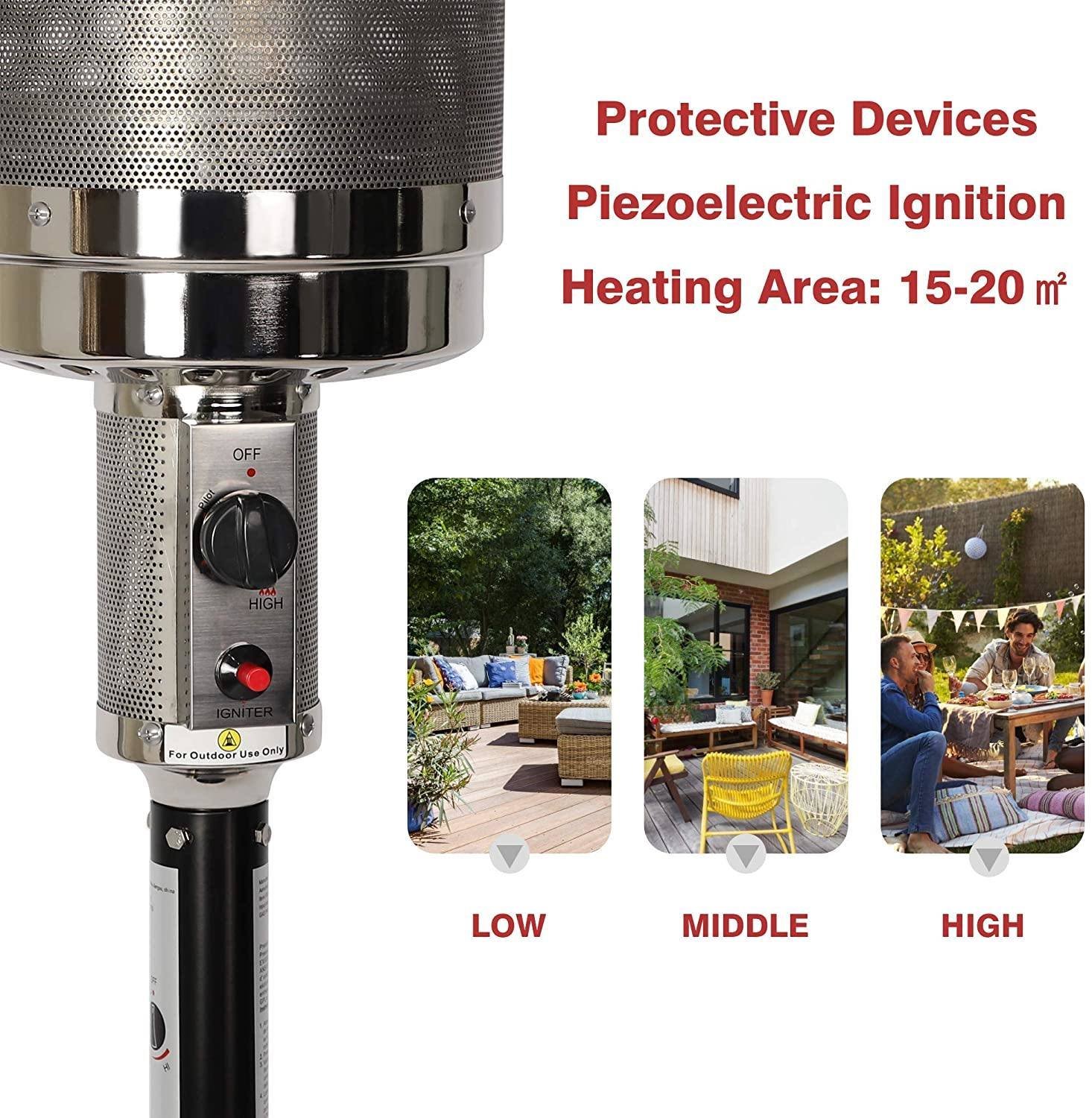 Our Bosonshop Outdoor Propane Heater Adopt the aluminum reflective plates to heat up by heat radiation, quickly and smoothly; It is very suitable for outdoor heating and lighting at night.