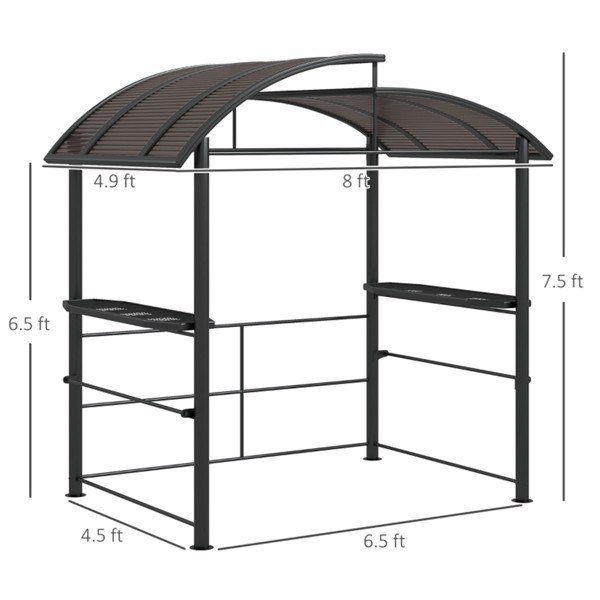 Specification:- Color: Tawny, Dark Gray- Material: Steel, Aluminum, PC Board- Overall Dimension: 94.5" L x 59.1" W x 90.6" H- Eaves Height: 75.6"- Two Side Shelves Dimension: 53.1" L x 13.4" W- Support Pole Spacing: 6.9', 4.5'- Weight Capacity: 11 lbs (Each Shelf)Package Includes:- 1 x BBQ Tent- 4 x Expansion Screw- 4 x Ground Stake- 1 x Manual