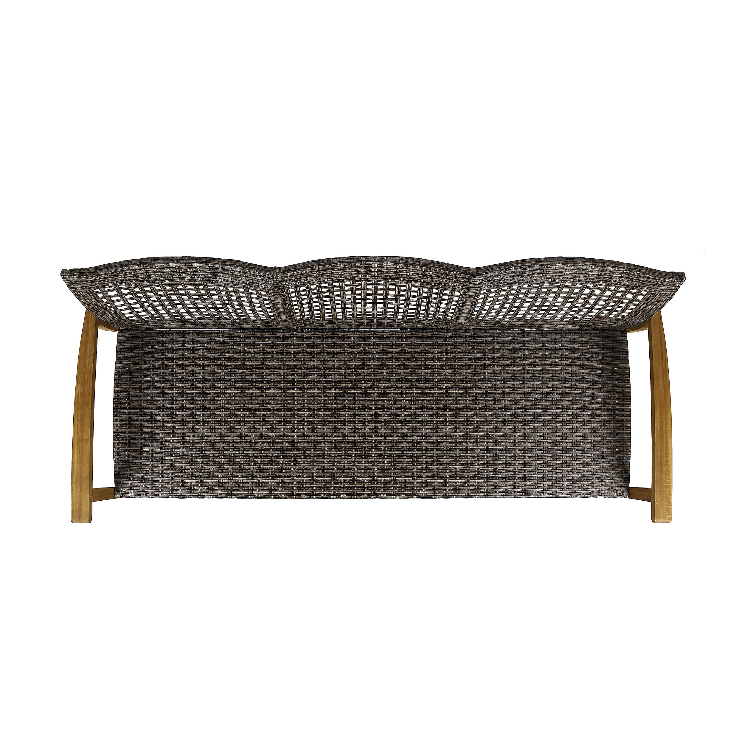 ACACIA WOOD WITH COMPLEMENTING FINISH: This frame consists of an acacia hardwood that accents the wicker seat. This material is washed with a complementing finish and maintains a sturdy foundation for the sofa that can withstand most weather conditions.