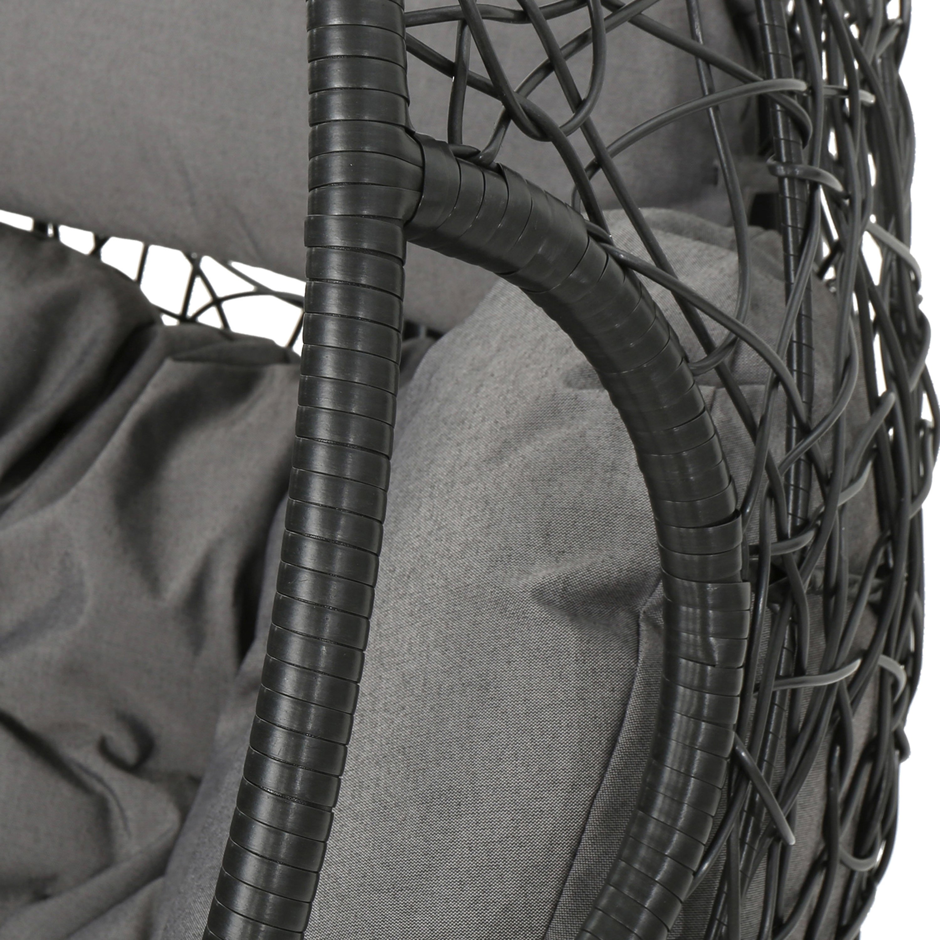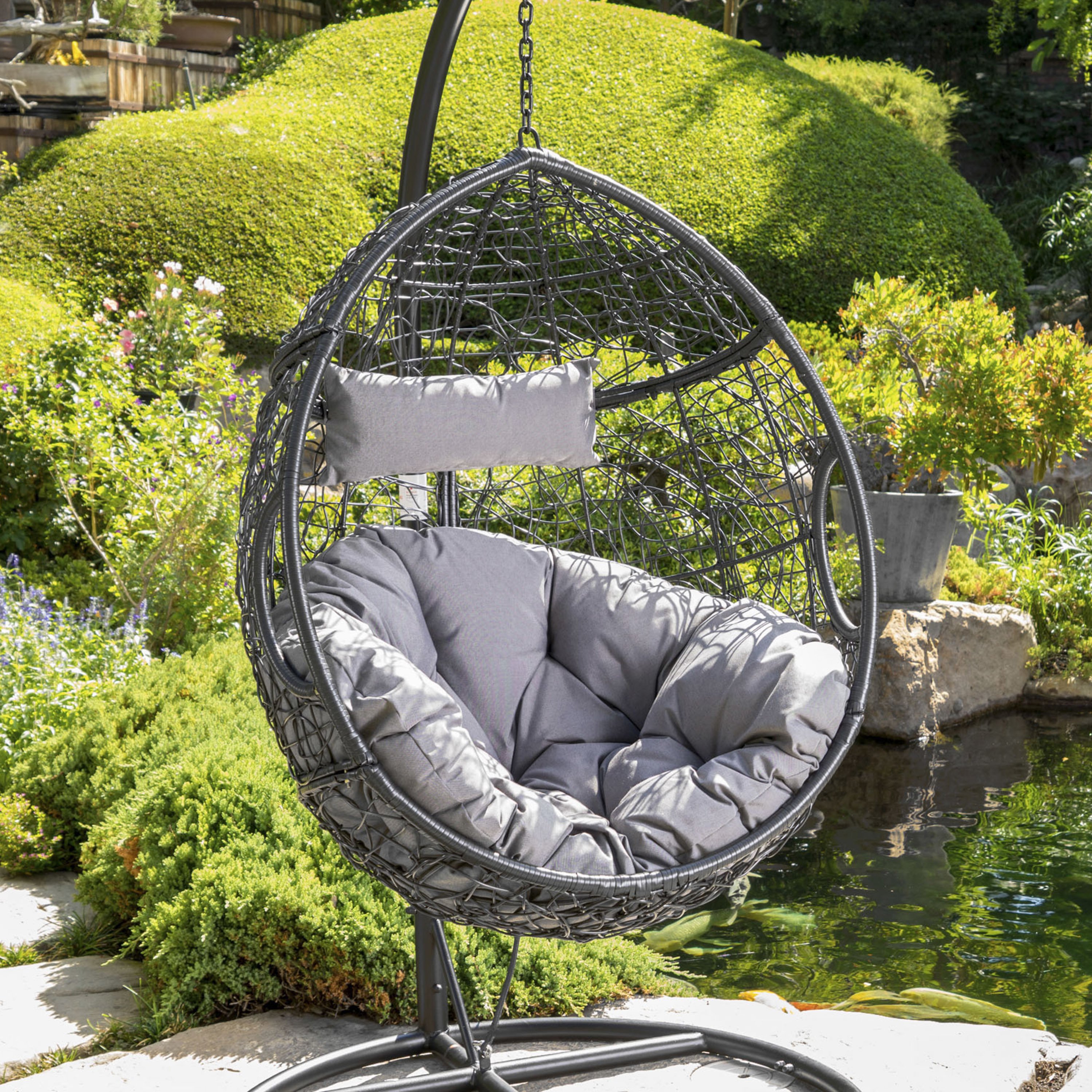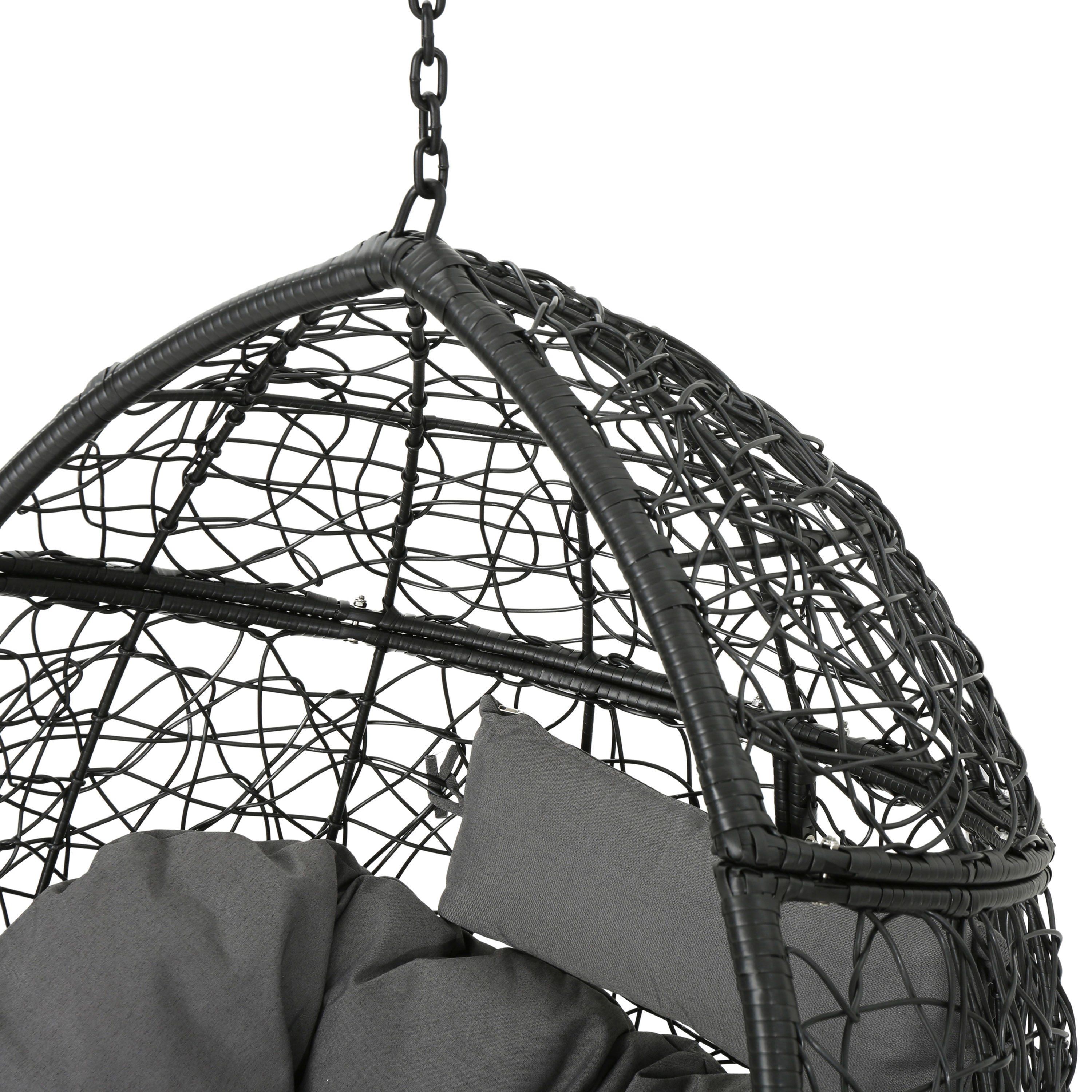 This hammock chair brings boho style and an inviting seat to any corner. It's made from wicker with a dark finish, and it has an egg-shaped silhouette. This hammock chair comes with removable and water-resistant polyester seat cushions in a neutral hue, offering extra padding and support as you sit and swing. It comes with a steel chain, hanging seamlessly from a hammock stand (sold separately), and it's suitable for indoor and outdoor use alike.