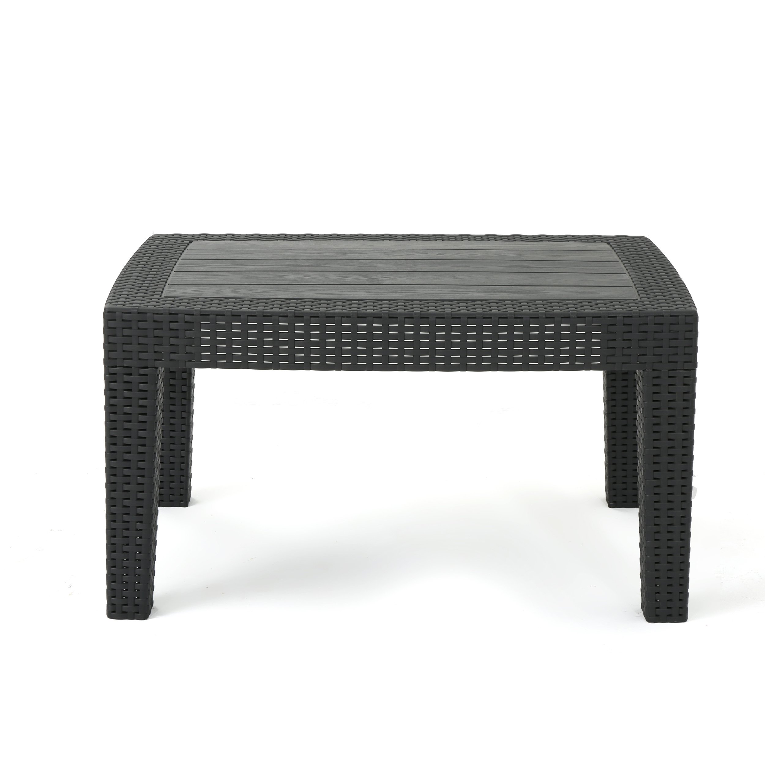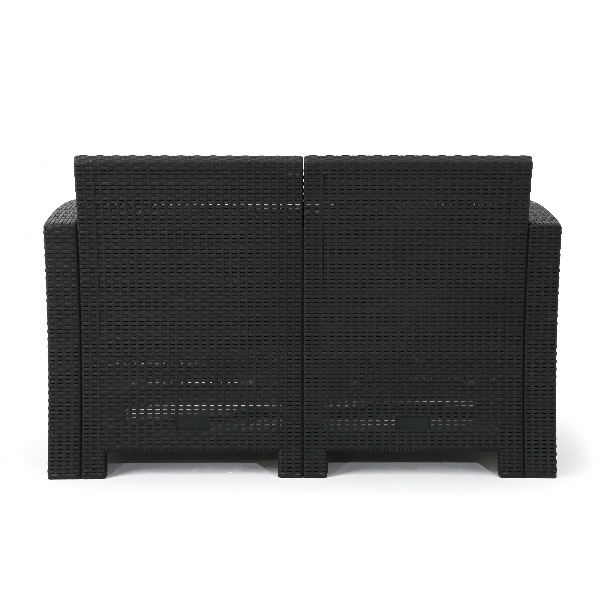 Product DescriptionReplace your mismatched patio furniture with our coordinated and completely stylish outdoor chat set. With seating for four, this collection includes a loveseat, a coffee table, and two club chairs. With wicker-like polypropylene resin construction, this set brings dimension and texture to any outdoor space. Modern minimalism makes a grand and stylish appearance in the form of contemporary silhouettes and artistic angles, while water-resistant cushions make the seating practical and comfortable. Create a conversational outdoor living space with this incredible collection.Product informationSofa Size29.92'' H X 47.2'' W X 25.82'' DTable Size15'' H X 27.55'' L X 19.88'' DChair Size29.92'' H X 26.77'' W X 25.82'' DCushion2''Chair Seat Height – Floor to Seat15'' HSofa Weight32 lb.Sofa Seat Height – Floor to Seat15'' HSeat Frame MaterialPlasticOuter Frame Material DetailsPolypropylene wickerTotal Number of Pieces Included4Table MaterialPlastic; WickerRemovable Cushion CoverNoRemovable CushionsYesSofa Weight Capacity550 lb.Chair Weight Capacity250 lb.Assembly RequiredYes