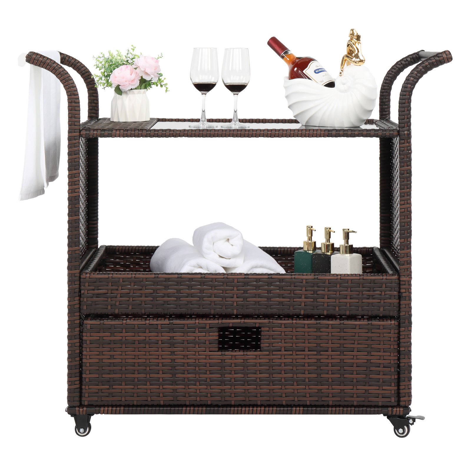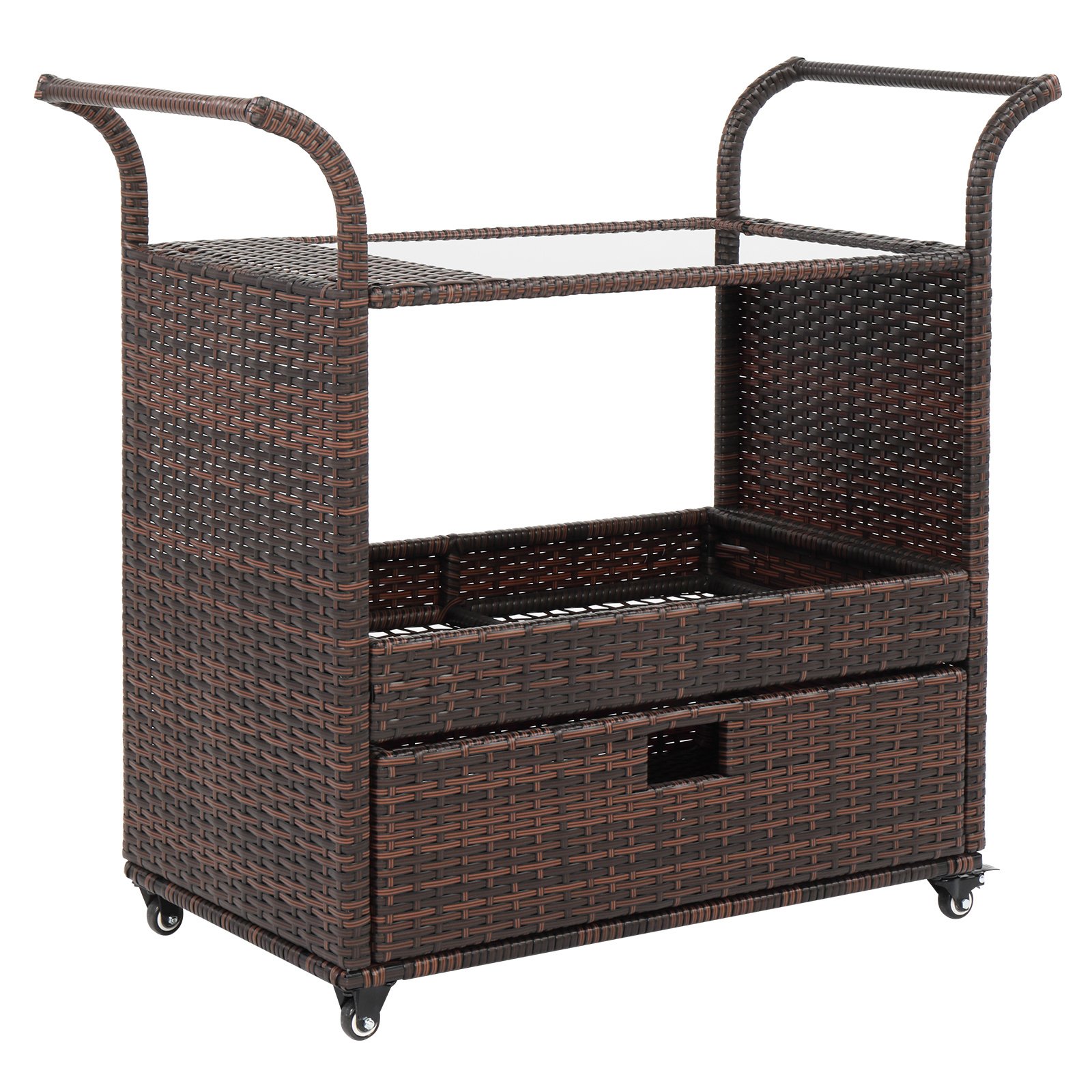 Outdoor Patio Wicker Rattan Serving Bar Cart Sideboard On Wheels Brown Gradient