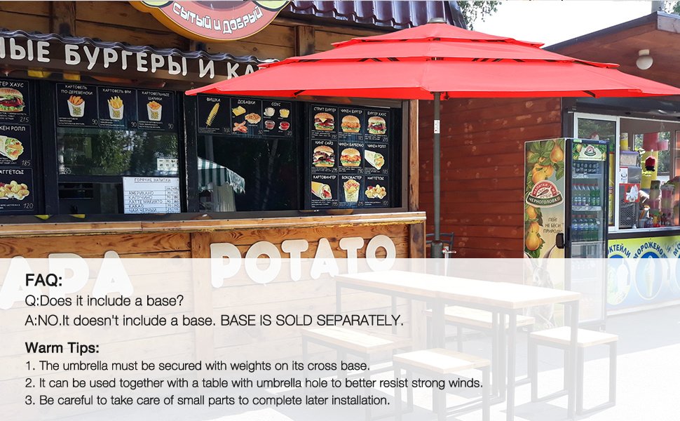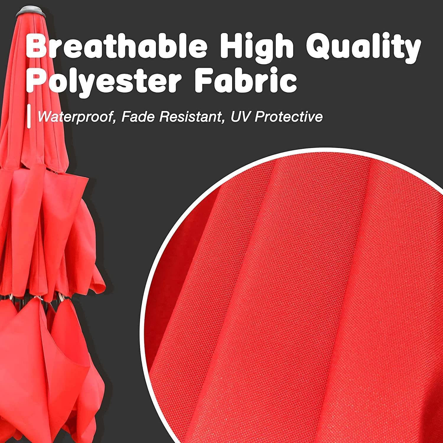 1.The umbrella is a double side patio umbrella. It is very easy to Assemble & Operate. And it has the sable Structure. Moreover, our large patio umbrella is made of high-quality 180g polyester fabric,which is waterproof, fade resistant, UV protective(UV30+) and easy to clean. 3 layers for great ventil