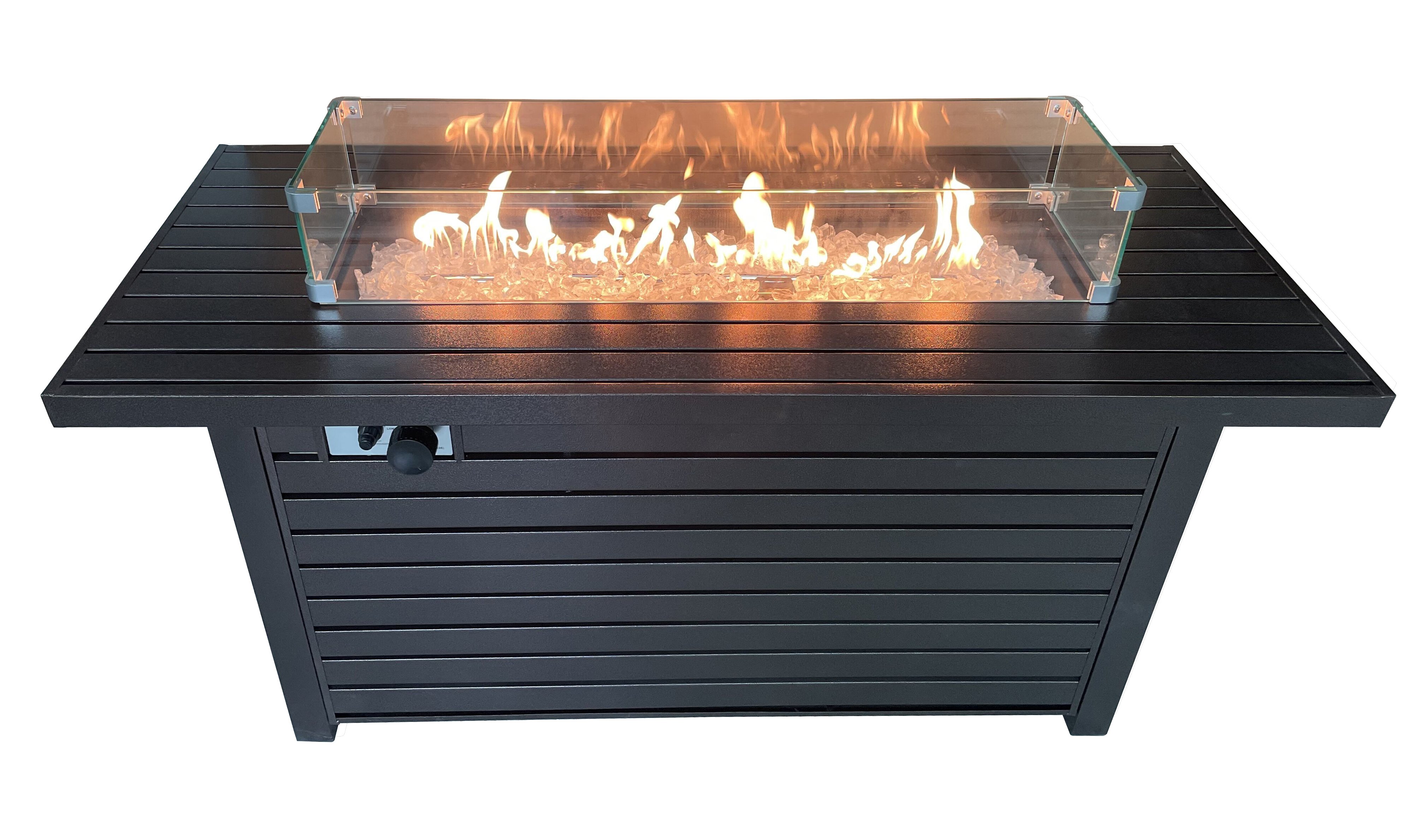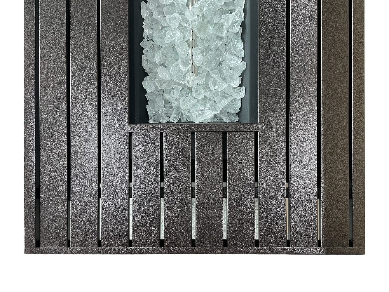 Built around a stainless steel burner buried under beautiful fire glass, this beautiful rectangular slatted firepit creates quite an impressive silhouette. This stately table is built from all steel in a hammered bronze finish that goes well in almost any backyard design plan. Emitting 50,000 BTUs of heat from a concealed propane tank, this unit also doubles as a table with a burner area lid.