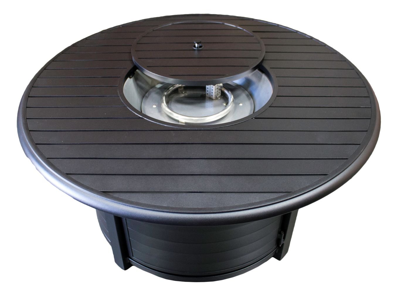Built around a stainless steel burner buried under beautiful fire glass, this 48 inch round slatted firepit creates quite an impressive silhouette. This stately table is built from weatherproof cast aluminum in a black finish that goes well in almost any backyard design plan. Emitting 41,000 BTUs of heat from a concealed propane tank, this unit also doubles as a table with a burner area lid.