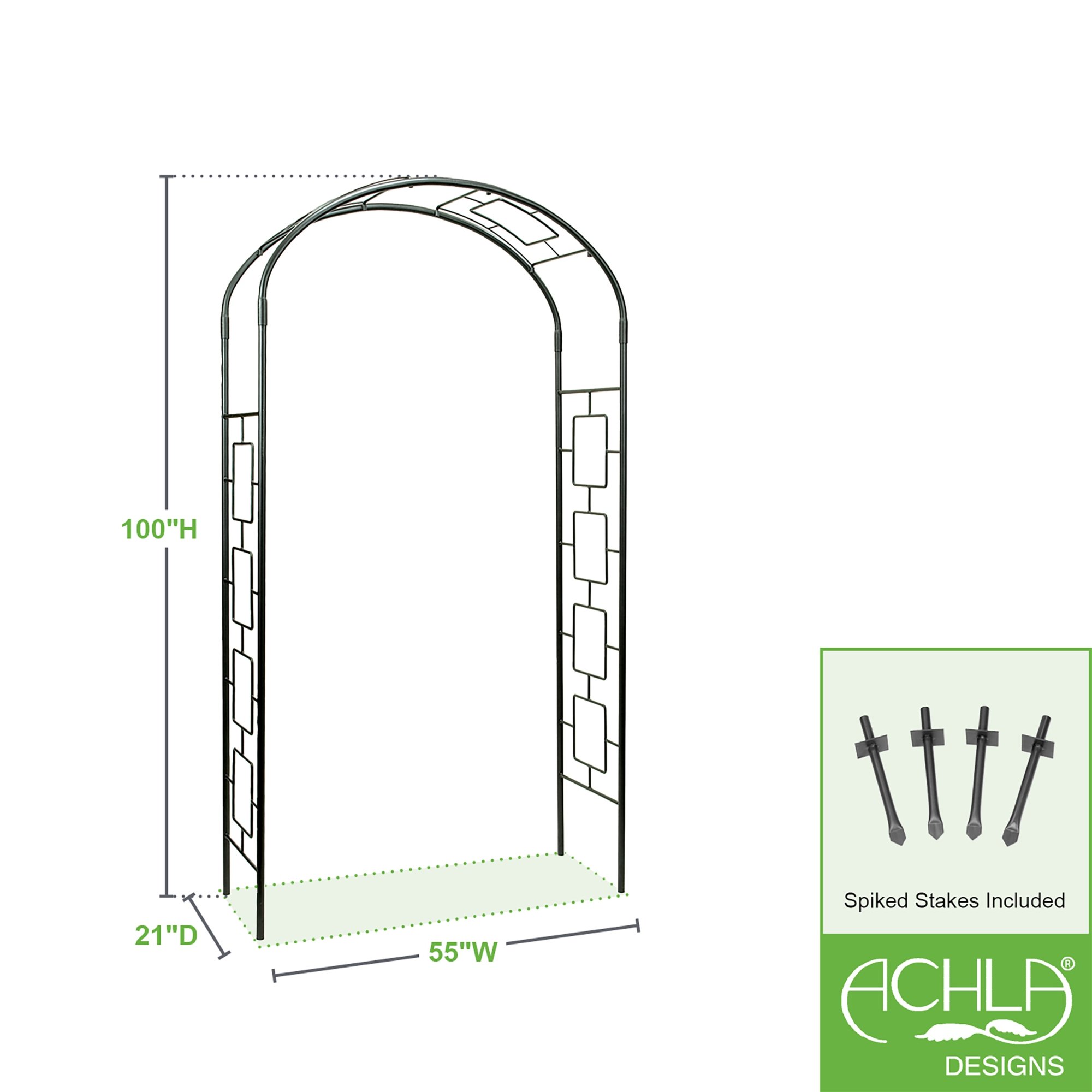 Create an elegant garden entrance with a handcrafted wrought-iron arbor by Achla Designs. We make a wide variety of sizes and decorative styles to fit every garden. The Modern Arbor has a simple arched design with a with a square motif along the top and sides. Use this garden arch in any vegetable or flower garden, yard entryway or garden path. The arbor is 8' 4" tall, 4' 7" wide, with a depth of 21", providing plenty of room for passage beneath. Placed over a walkway or over a bench seat, with the sides of the arbor used to trellis climbing plants, the arbor also makes a wonderful decorative feature for garden parties, weddings and events. All of our garden arbors are designed to ship flat, with easy set-up using slip-in components, so no tools are necessary, with four spiked feet included for installation.