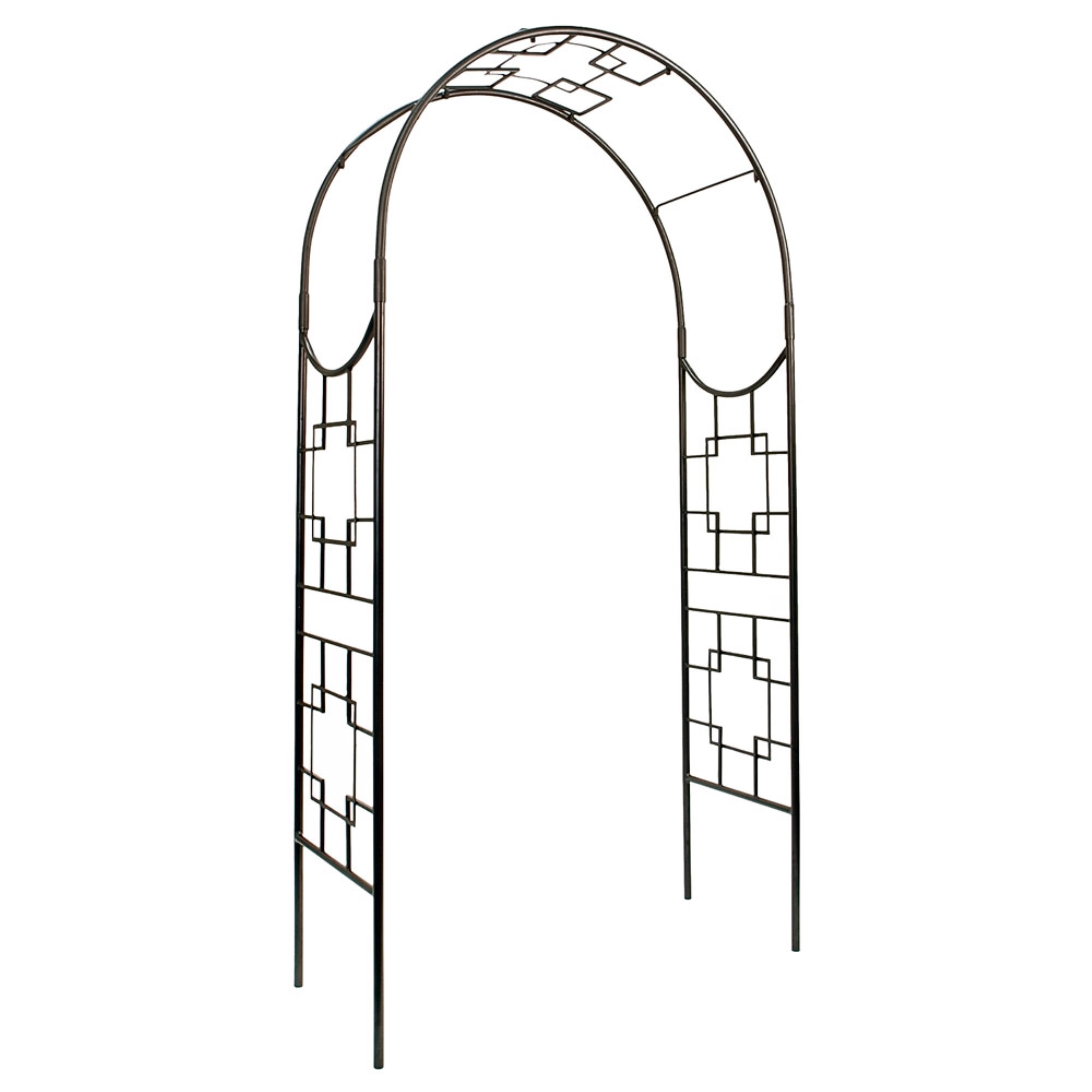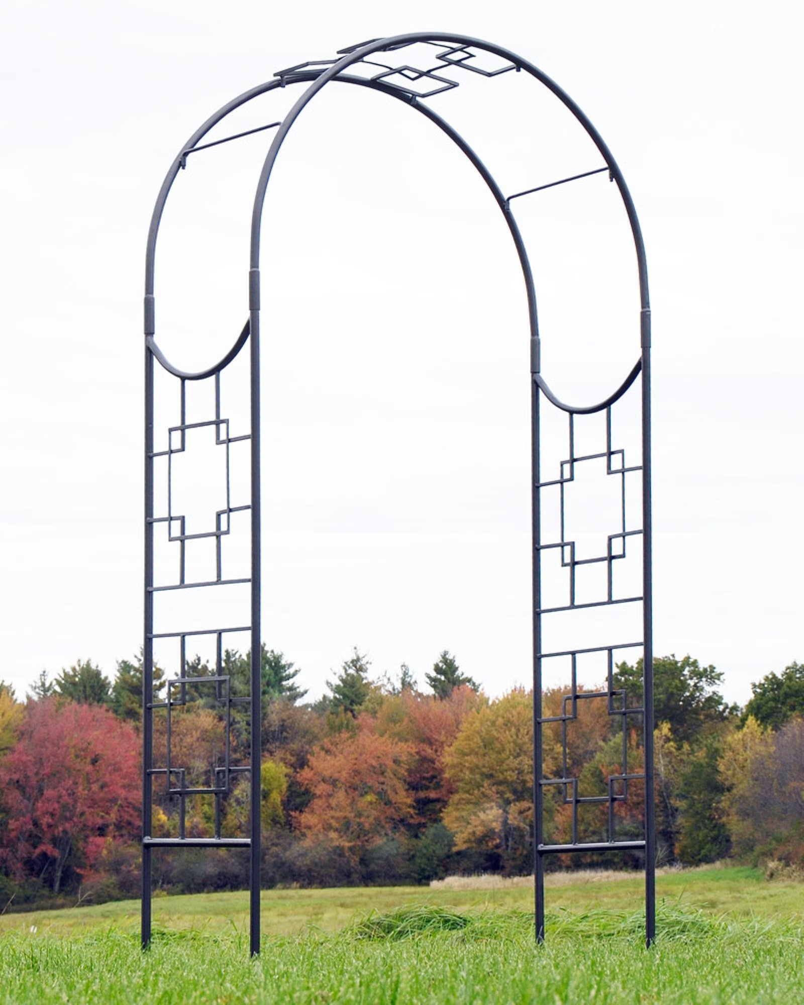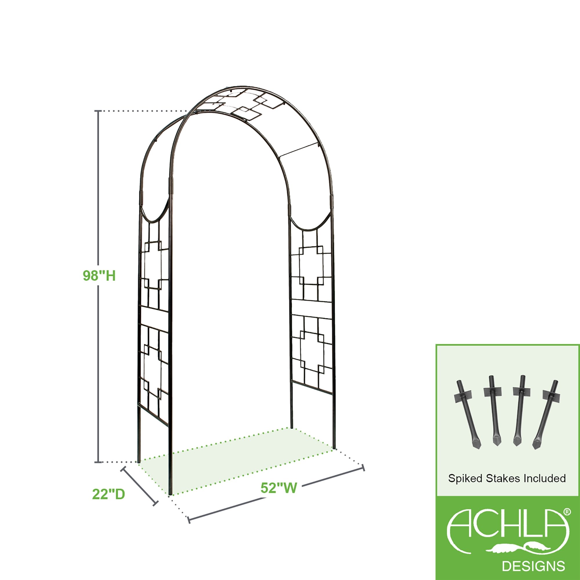 Create an elegant garden entrance with a handcrafted wrought-iron arbor by Achla Designs. Part of our Square-On-Squares collection., the many pieces available in this group can be used to create a unified modern landscape theme. Just over 8' tall , placed at an entrance or over a path, the arch provides plenty of room for passage beneath and a beautiful addition to any garden, planted with perennial vines or annual climbers. Designed to ship flat and be easily erected without tools, four spiked stakes are included for in-ground installation.