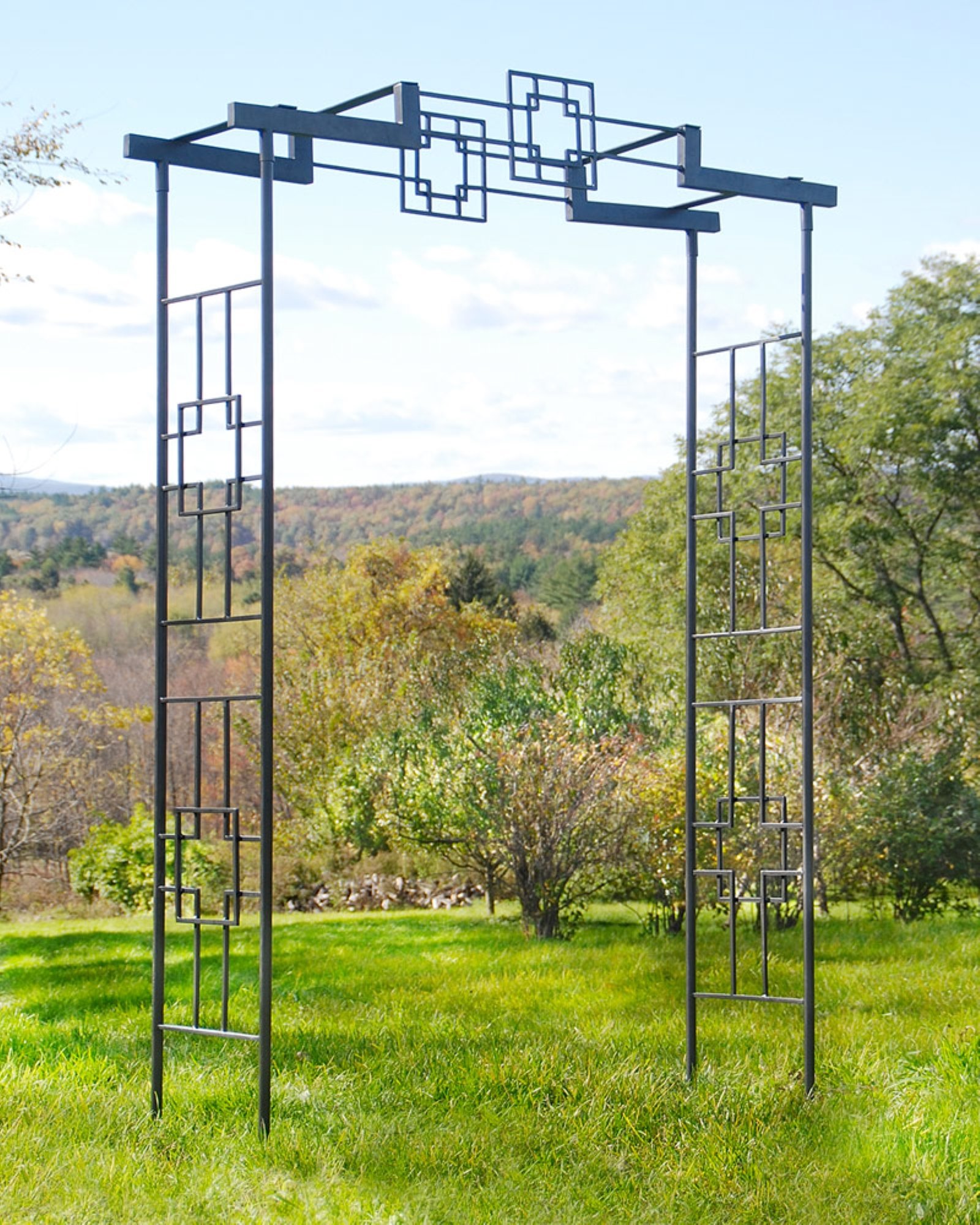 Create an elegant garden entrance with a handcrafted wrought-iron arbor by Achla Designs. Part of our Square-On-Squares collection., the many pieces available in this group can be used to create a unified modern landscape theme. This wider of the two Square-On-Squares Arbors is 95 1/2" tall. Placed at an entrance or over a path, the arch provides plenty of room for passage beneath and a dramatic addition to any garden, planted with perennial vines or annual climbers. Designed to ship flat and be easily erected without tools, four spiked stakes are included for in-ground installation.