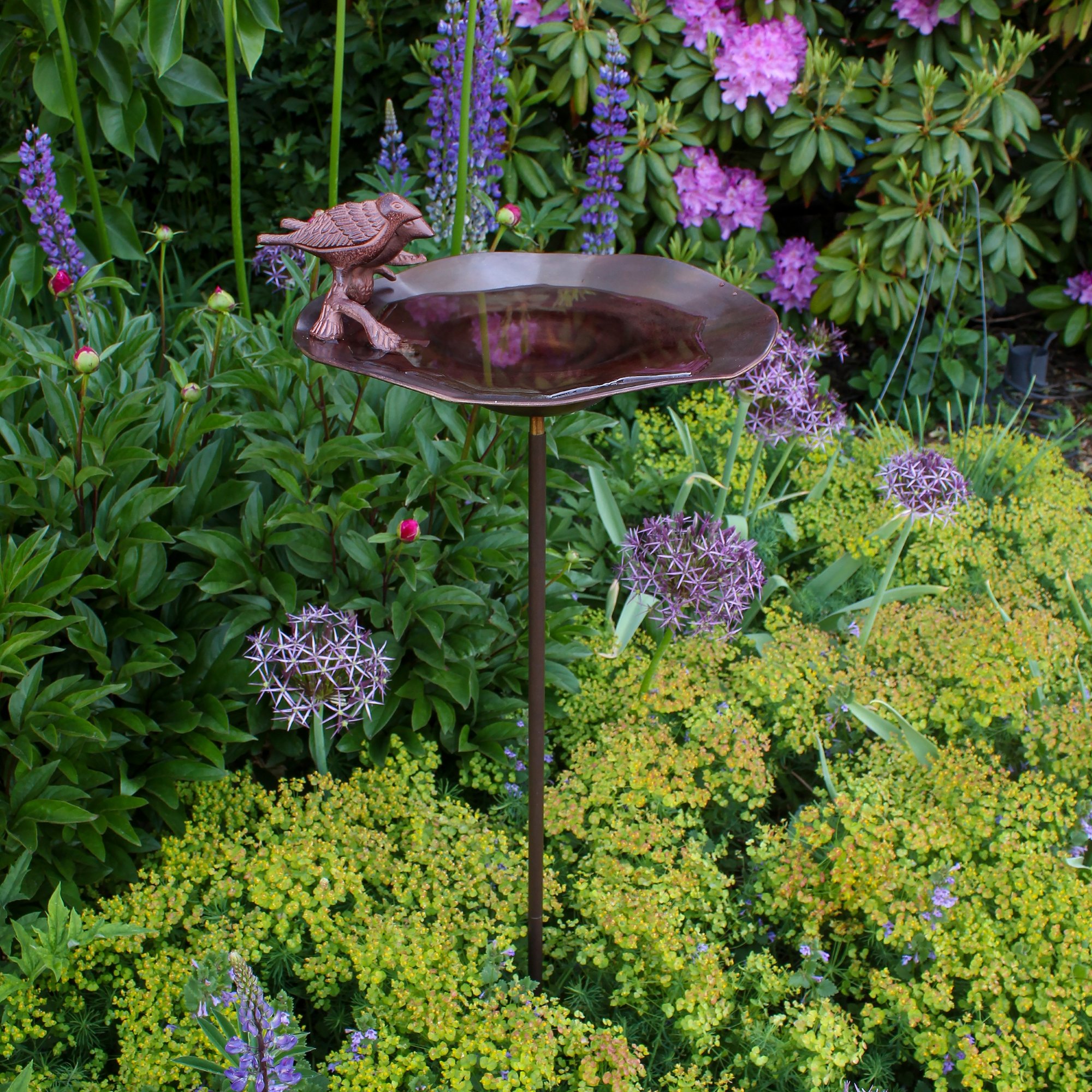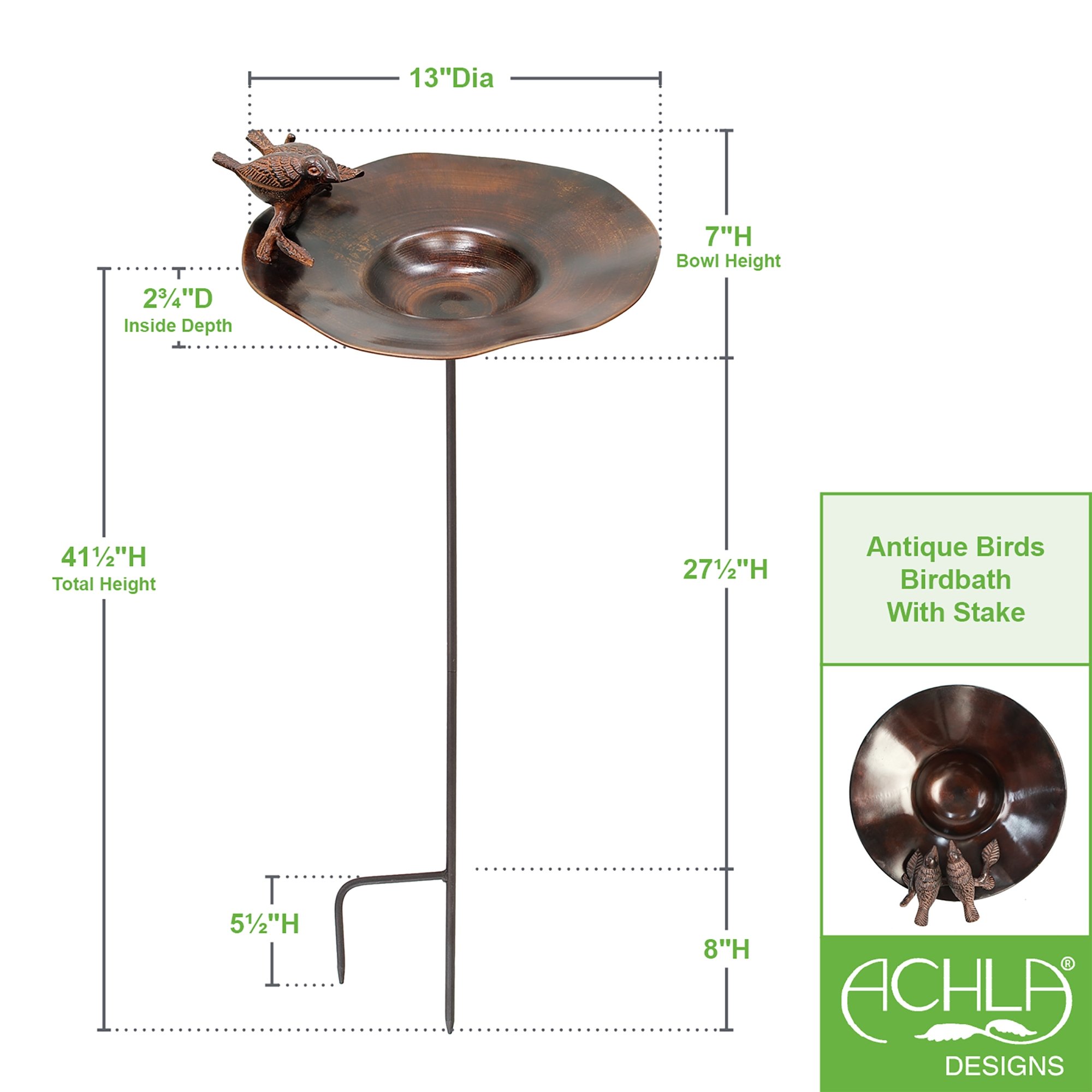 The Antique Birdbath from Achla Designs is a sculptural piece of garden art that also benefits the wildlife in your yard. Birds will love having a safe place to cool off and drink some water, and gardeners will love having this beautiful piece to accent the plantings. A lovely garden accent adds depth, dimension, and a focal point to a perennial bed, water feature or other natural setting. This beautiful brass birdbath has a soft bowl with two cheerful songbirds perched on the wide undulating rim. and a Antique Copper finish.