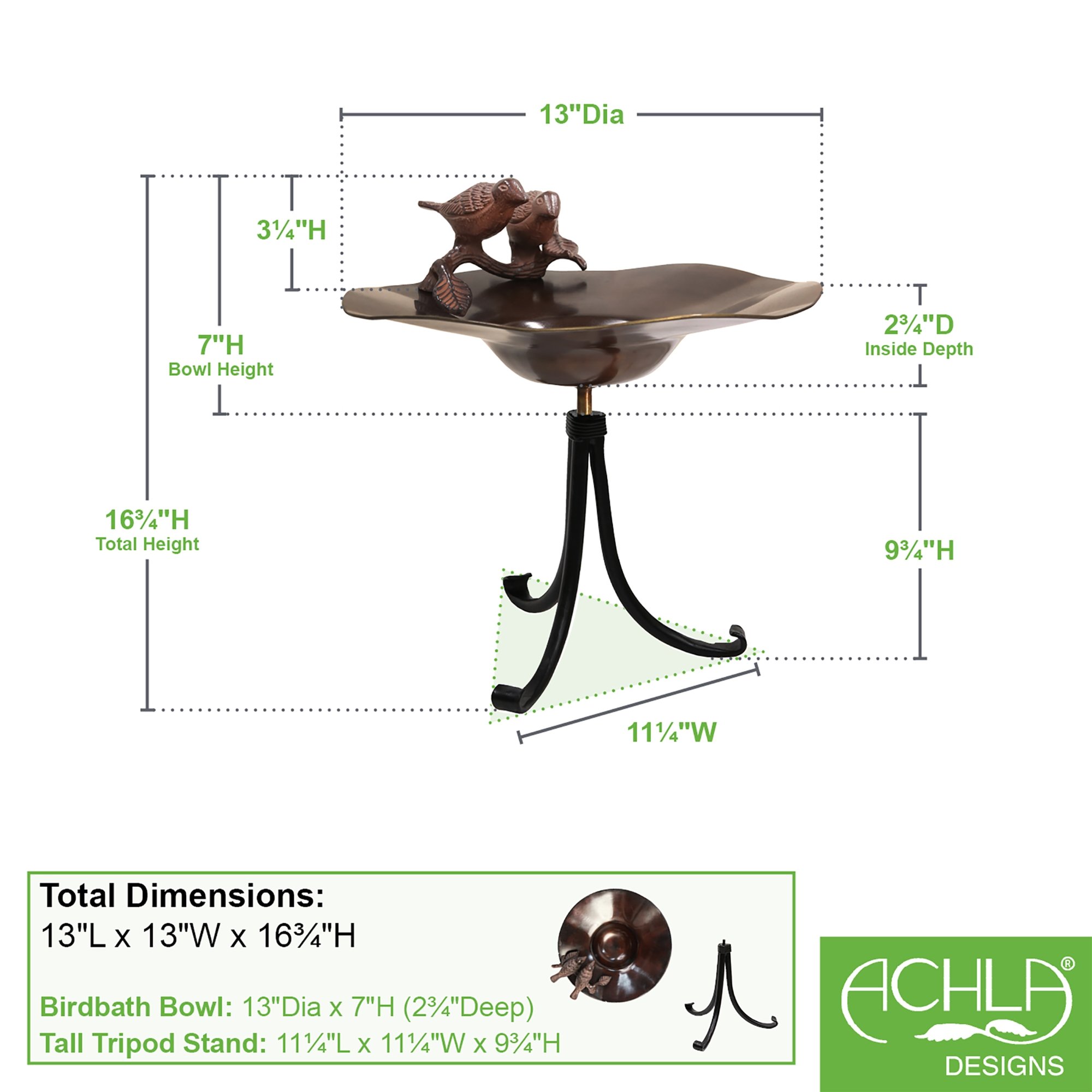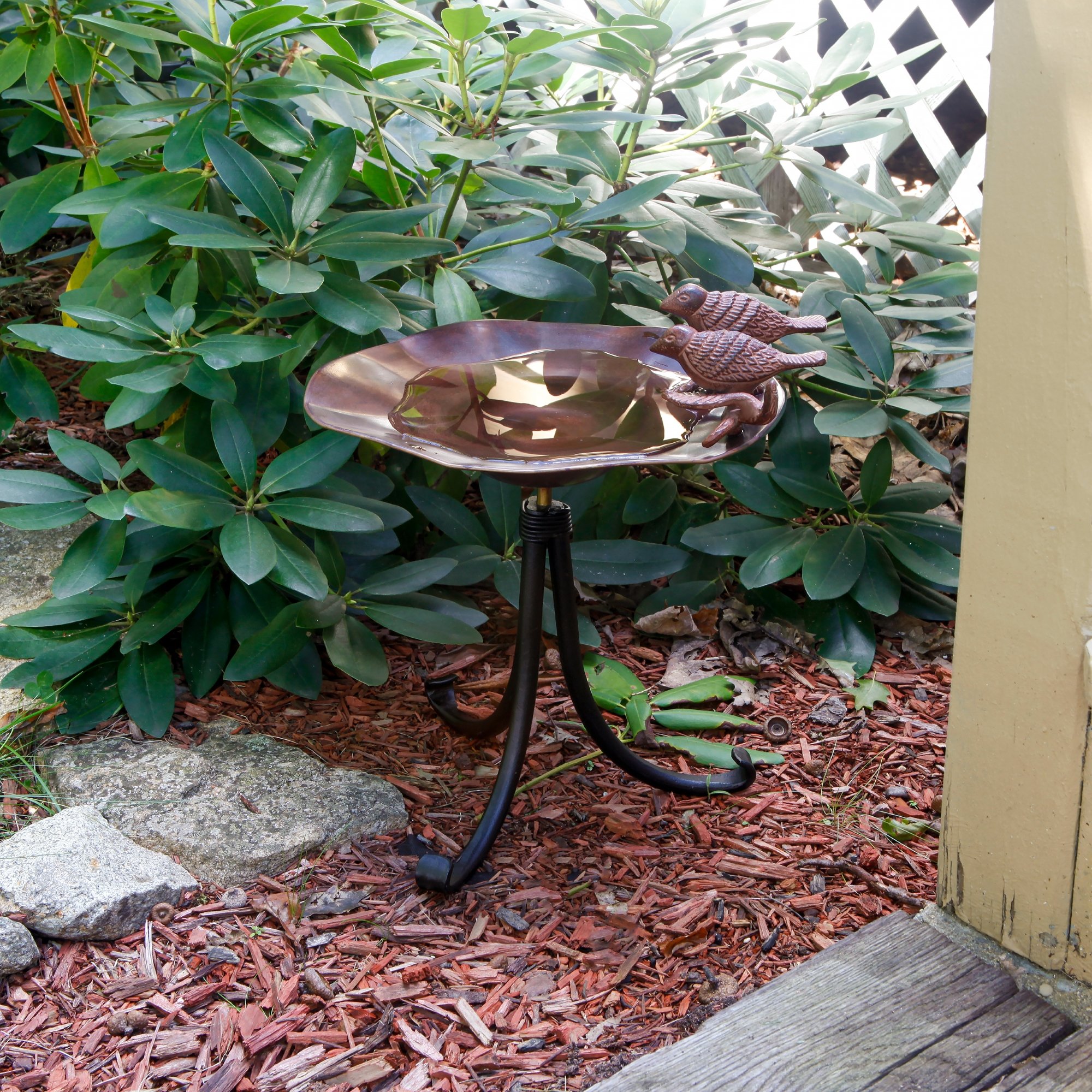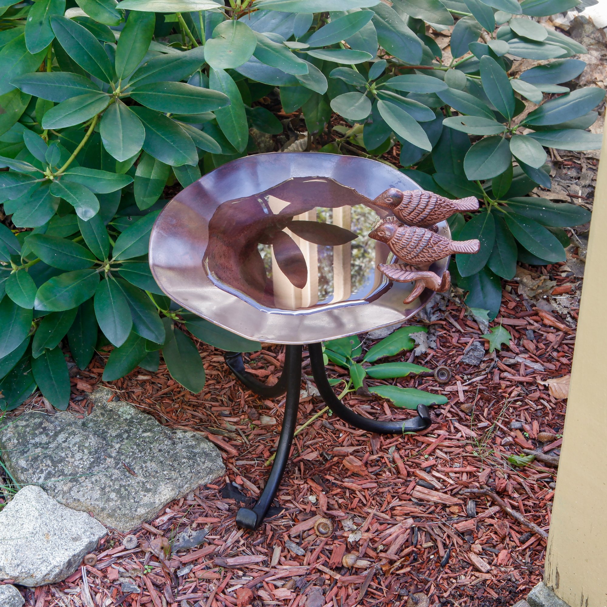 The Antiqued Birdbath with Tripod Stand has a soft undulating coppery bowl featuring a pair of sculpted songbirds birds perched at the edge. The threaded base on the underside of the bowl attaches to a sturdy three-footed wrought iron stand. This birdbath makes a beautiful garden accent piece placed on a deck, tabletop, or pedestal. This is a perfect choice for rock gardens, tabletops, and low border plantings too.