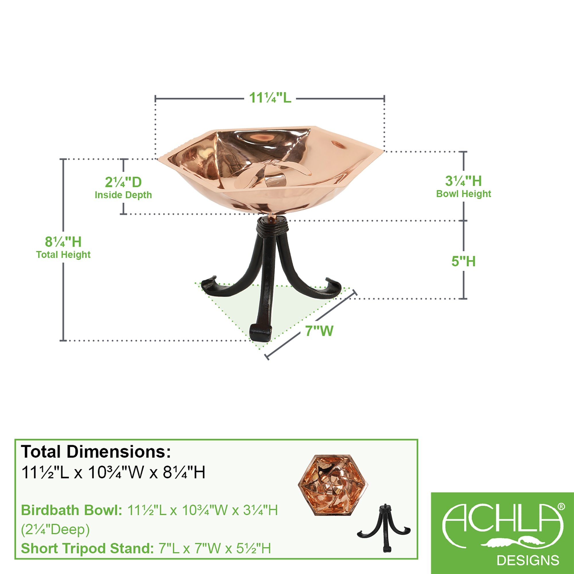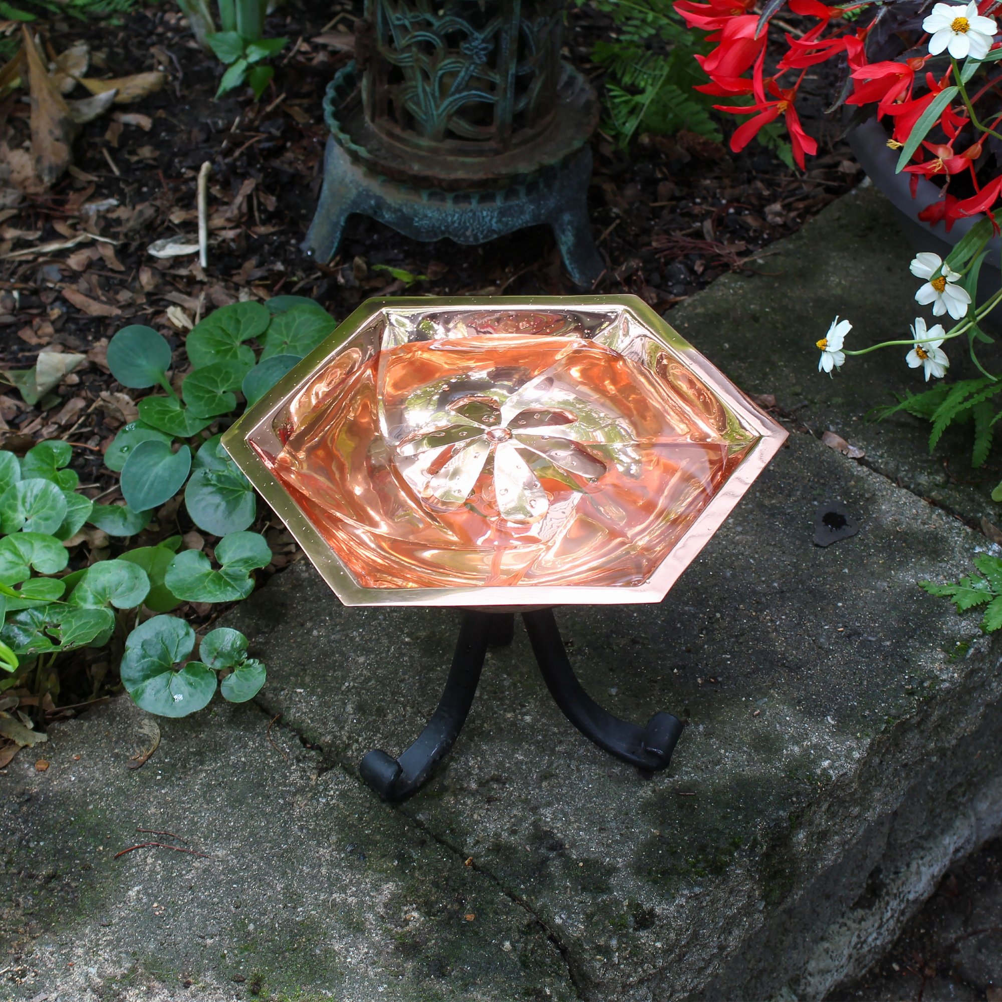 The Bee Fountain & Birdbath with Tripod Stand is a compact birdbath specifically designed with our pollinator friends in mind. The hexagonal copper bowl features a six-petal copper flower at its center. Allowing the petals to dip below the surface of the water provides a landing place for bees and butterflies to sip at the water's edge without falling in. Use it with or without the addition of glass beads or stones. This version with a small three-footed wrought iron Tripod Stand is perfect for close observation of wildlife. Great for placement in rock gardens, on tabletops, and in low border plantings.