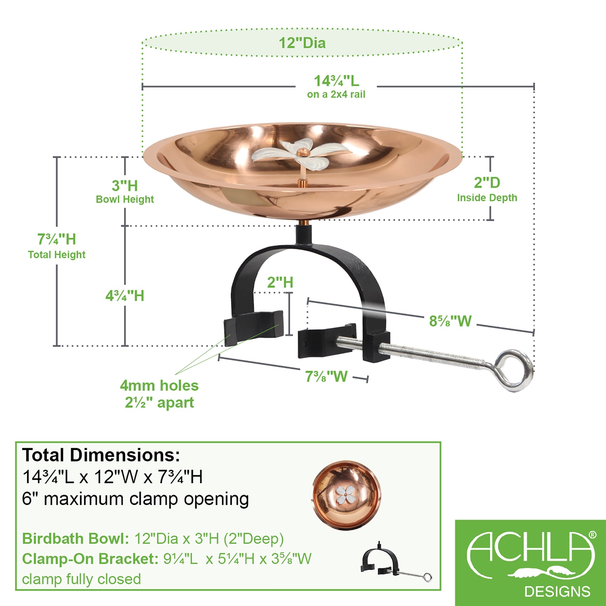 This Over Rail-Mounted Dogwood Birdbath was specifically designed with our pollinator friends in mind. The simple copper bowl has a white dogwood flower that fits into the center. Allowing the petals to dip into the water's surface provides a landing place for bees and butterflies to sip at the edge without falling in. Use it with or without the addition of glass beads or stones. The threaded base on the underside of the bowl attaches it to the center of the bracket. Ideal for porches, balconies or deck rails, the wrought iron bracket has C-type clamp that holds the bracket to a deck or handrail without need for drilling or permanent mounting. Fits over railings up to 5 1/2" wide and designed with ample clearance for a curved top handrail.