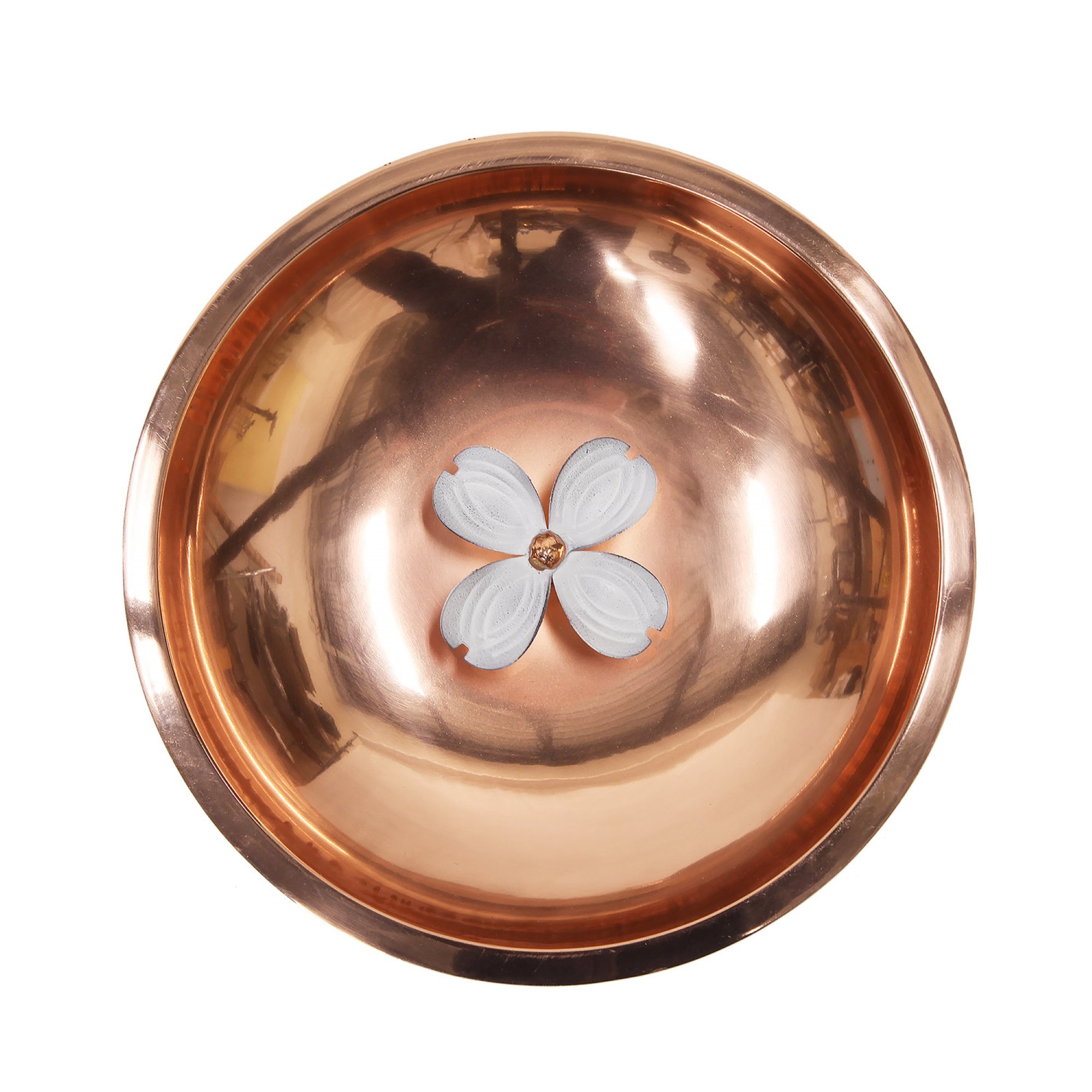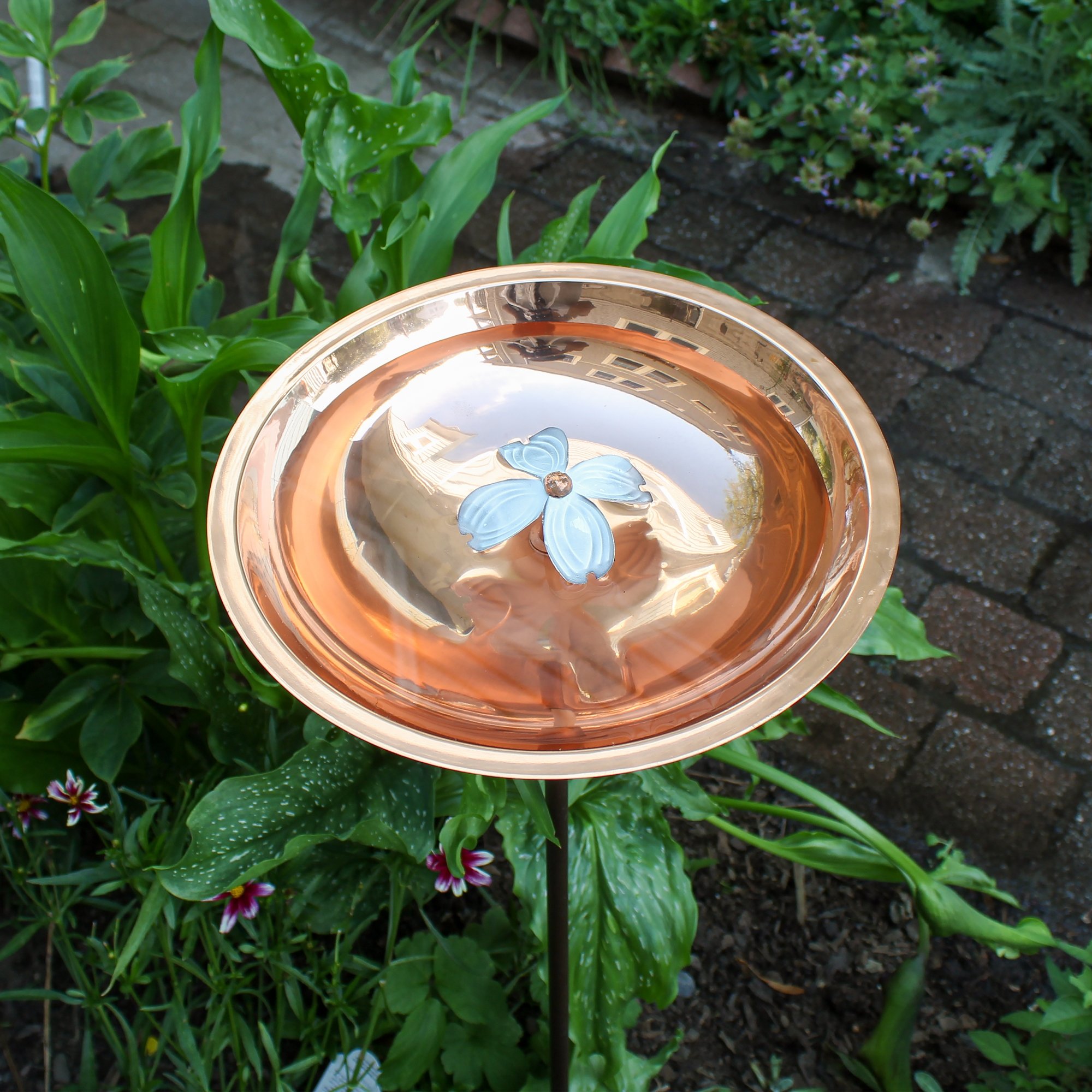 The Dogwood copper birdbath from Achla Designs is a sculptural piece of garden art designed to benefit the wildlife in your yard. Birds will love having a safe place to cool off and drink some water, and gardeners will love having this beautiful piece to accent the plantings. The rising popularity of pollinator gardens inspired us to create a birdbath bowl that would be welcoming to pollinators as well. Honeybees and other beneficial insects require a water source gives them the opportunity to sip at the water's edge. Keeping the petals of the central dogwood flower dipping below the water level allows them to land and drink. The threaded base on the underside of the bowl attaches to the wrought iron stake, for staking directly into garden beds and borders. A lovely garden accent adds depth, dimension, and a focal point to a perennial bed, water feature or other natural setting. Makers of fine quality goods for the home and garden since 1994, we offer a full line of Achla Designs wrought iron landscape structures, plant supports and stands, birdbaths and other decorative garden elements for the patio, porch, deck and yard.