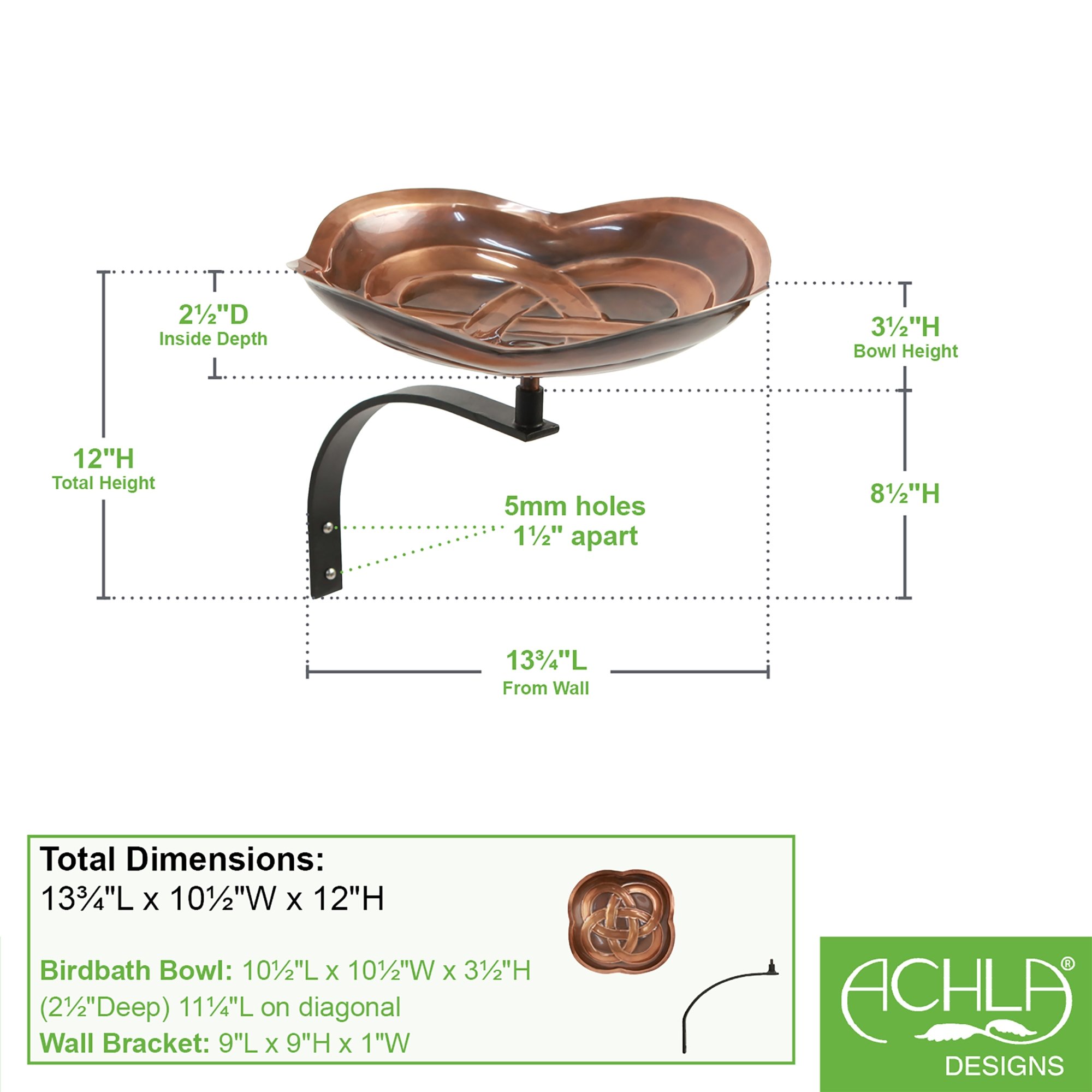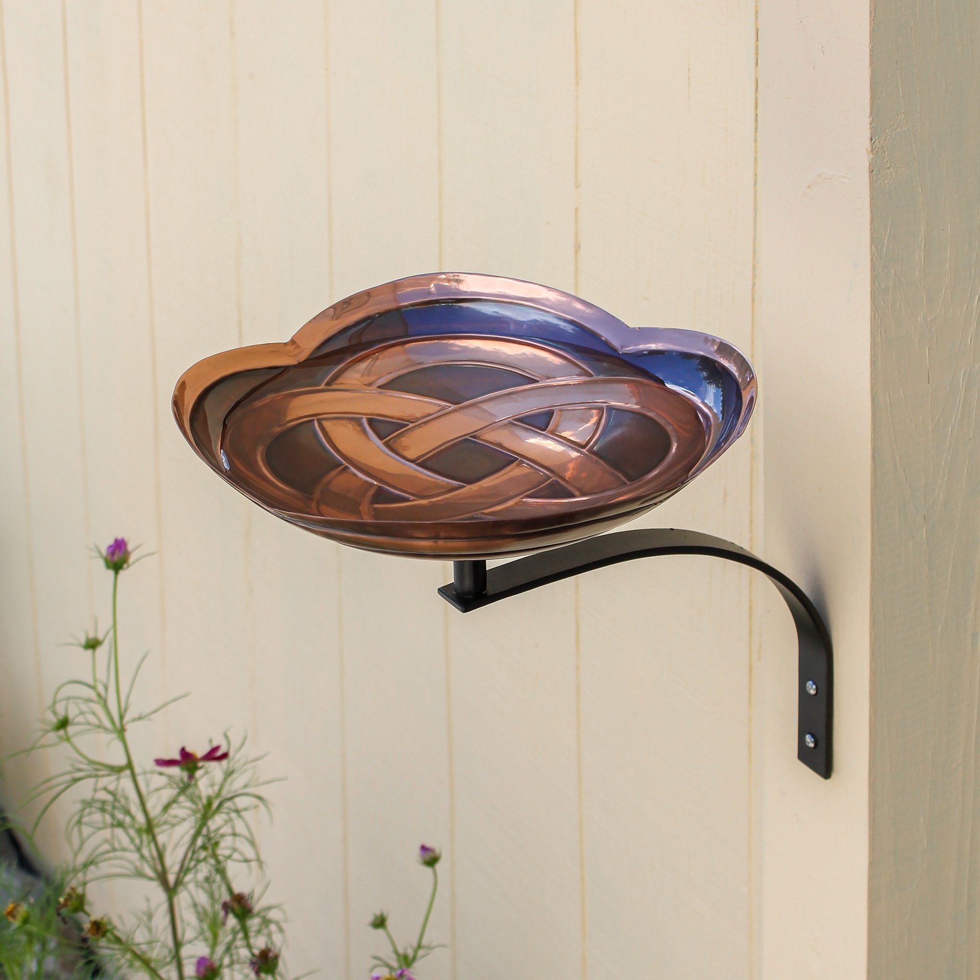 A Celtic love knot design is embossed inside the bowl of The Dara Knot Birdbath with Wall Bracket. Ideal for porches, decks and fence posts, the bowl has a threaded base that attaches to the wrought iron wall bracket. Two mounting holes and hardware are provided. Ideal for your bird-loving or gardening sweetheart, this birdbath makes a perfect copper anniversary gift.