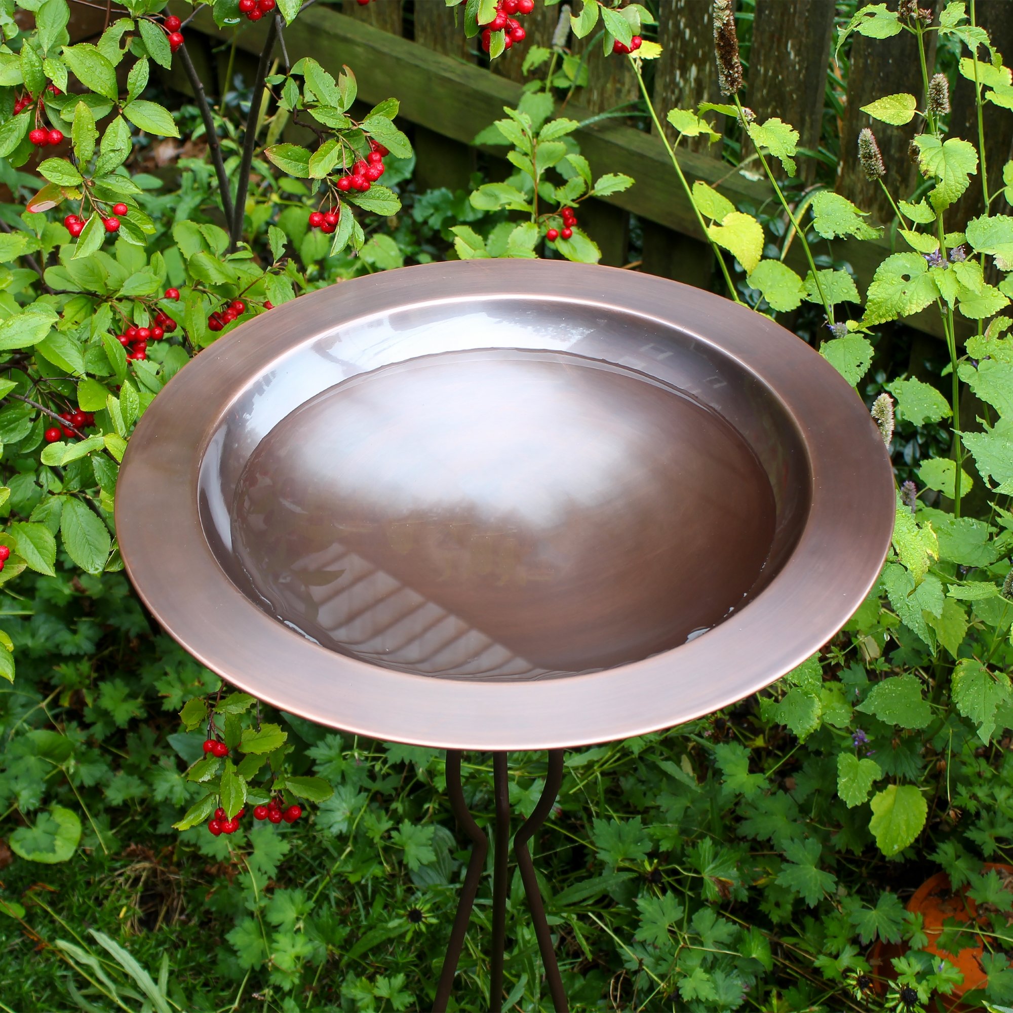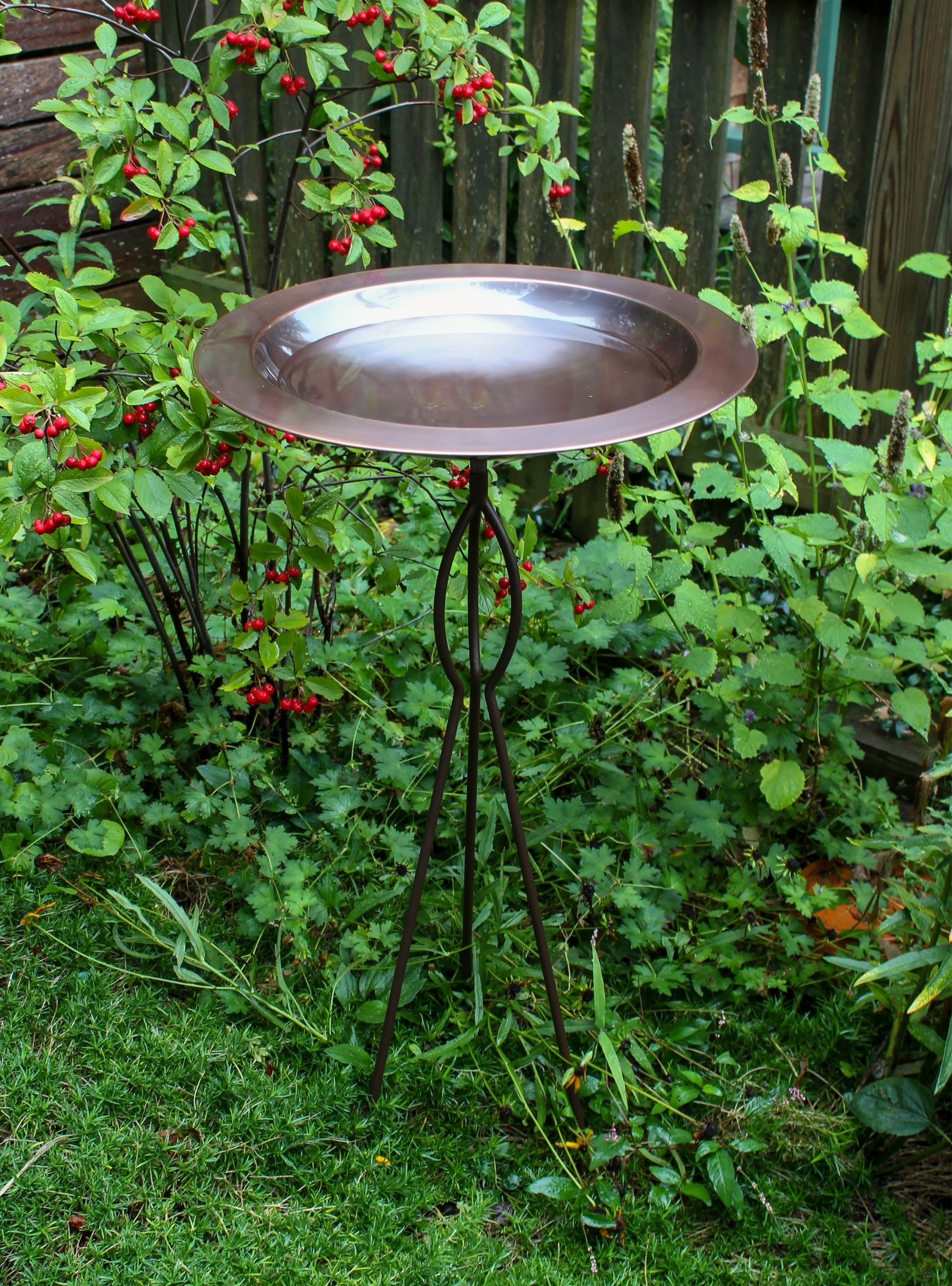 The Classic Copper Birdbath is a simple shallow birdbath bowl with a wide perching rim, made of brass with satin Antique Copper plated finish. The birdbath bowl threads onto the wrought iron Tripod Stake. Featuring a three-pronged design for increased stability, the birdbath can be staked directly into a garden bed, border or lawn. The 18" Classic Copper Birdbath is a lovely garden accent that will provide water in your backyard habitat year-round.