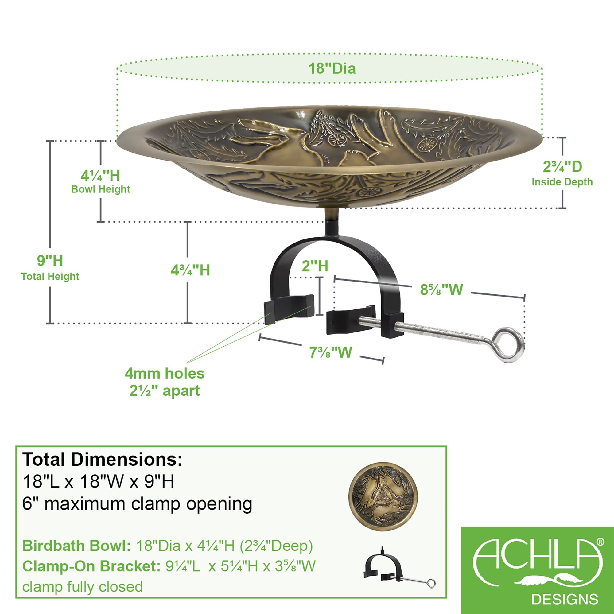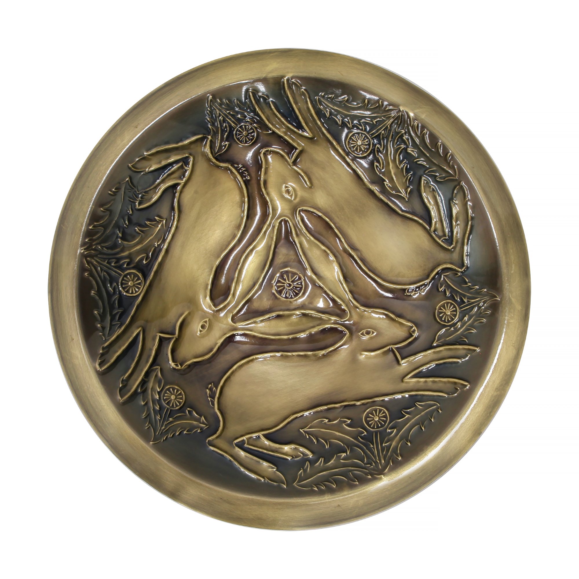The Three hares design is a familiar ancient motif, found in sacred sites in the Middle and Far East, as well as Medieval churches of Devon, England. This curious pattern of rabbits with shared ears remains mysterious and open to interpretation, but will be at home in the garden. With the design done in embossed Brass, a threaded base on the underside of the bowl attaches to a sturdy three-footed wrought iron stand. This birdbath makes a beautiful garden accent piece placed on a deck, tabletop, or pedestal. This is a perfect choice for rock gardens, tabletops, and low border plantings too.