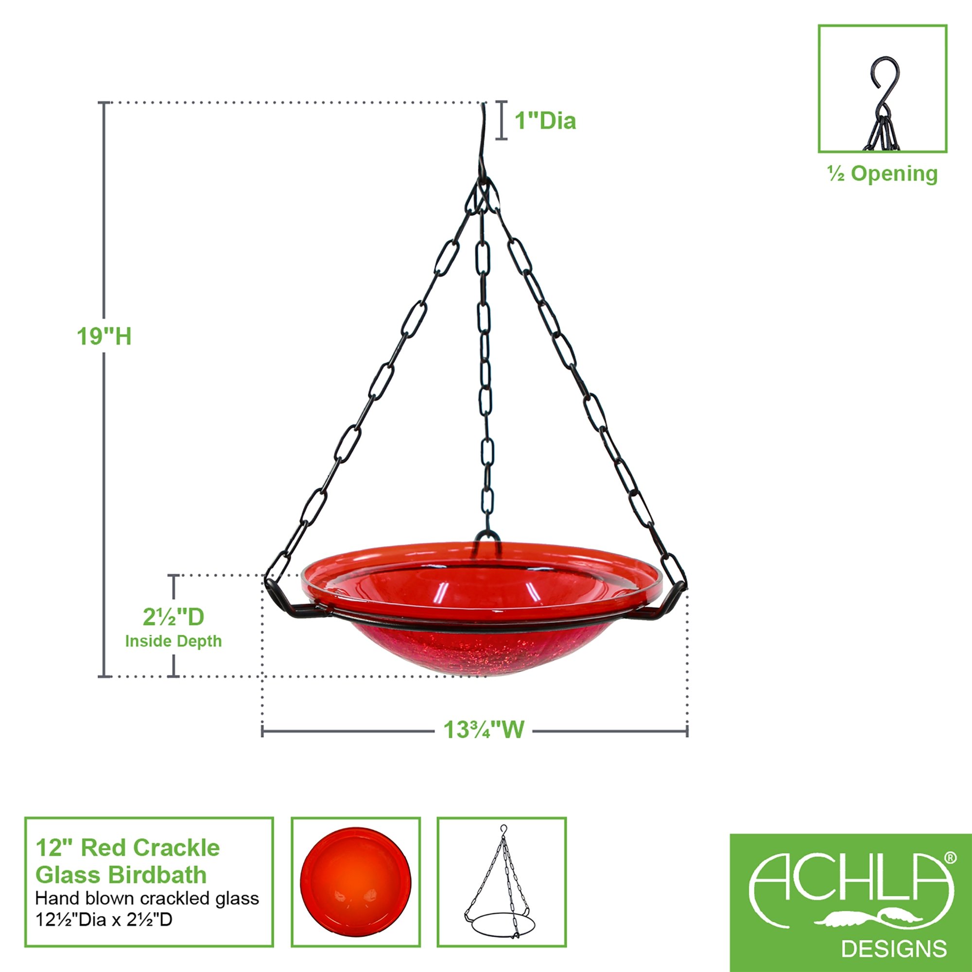 Reflective and brilliant, our Crackled Glass Birdbath Bowls are sparkling gems in the garden. Bowls are made from hand-blown glass in five vibrant colors, measuring 12 ½” diameter x 2 ½”D. Available for purchase alone, or with our wrought iron Birdbath Hanging Ring or Cradle and Garden Stake, these colorful birdbaths create a bright pop anywhere in the garden. Birds will enjoy a safe place to cool off and drink some water, and gardeners will love having this beautiful piece to accent the plantings. These bowls are also designed to fit our wrought iron bases the Short Stand (GBS-22)and Ring Stand (FB-14) for table top or garden. Makers of fine quality goods for the home and garden since 1994, we offer a full line of Achla Designs wrought iron landscape structures, plant supports and stands, birdbaths and other decorative garden elements for the patio, porch, deck and yard.