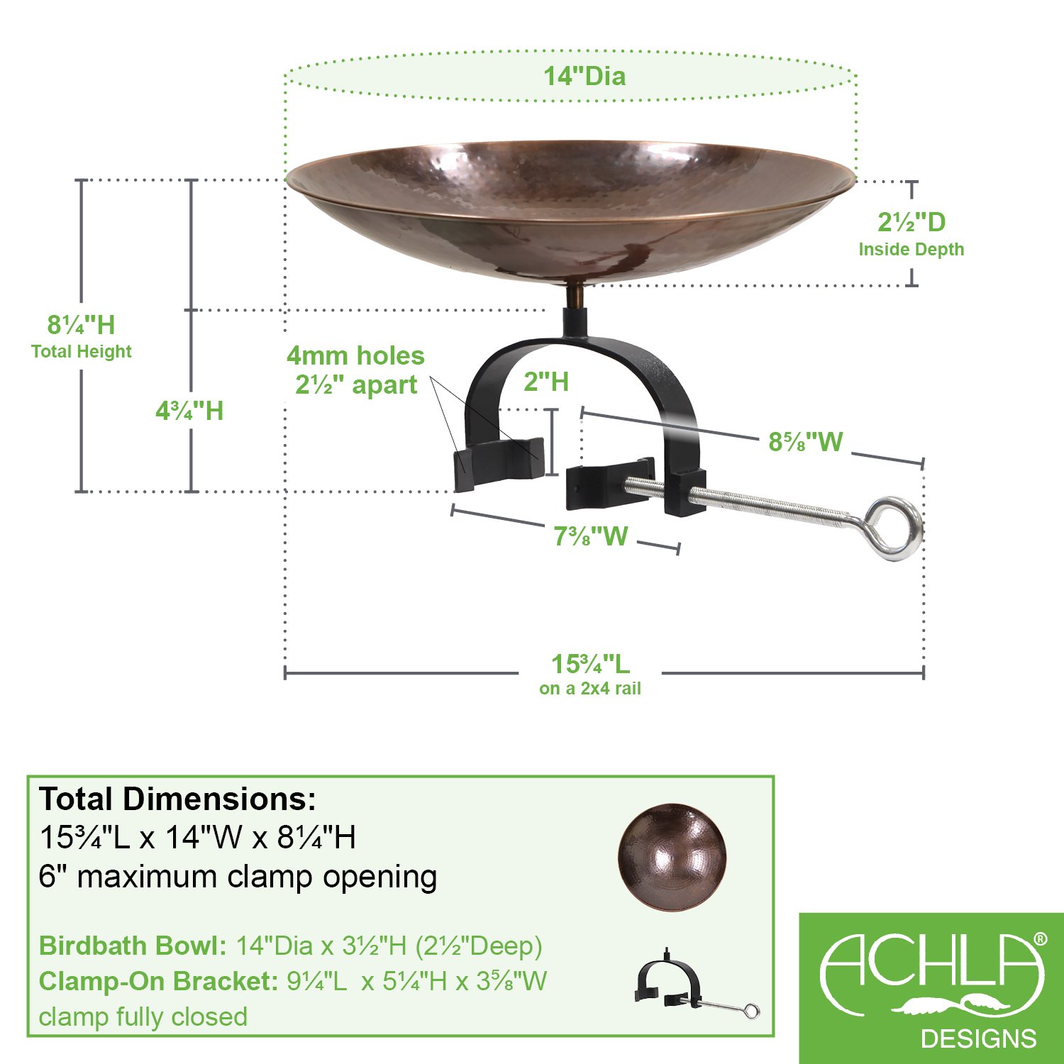 This Over Railing Burnt Copper Birdbath is a simple hammered copper birdbath bowl with a handrail bracket. The shallow bowl has a round hammered or "peened" texture and an antique copper finish that will patina naturally. A threaded base on the underside of the bowl attaches to the center of the wrought iron railing bracket. Ideal for bird-watching on porches, balconies or decks, the wrought iron bracket has C-type clamp that holds the bracket to a deck or handrail without need for drilling or permanent mounting. Fits over railings up to 5 1/2" wide and designed with ample clearance for a curved top handrail.