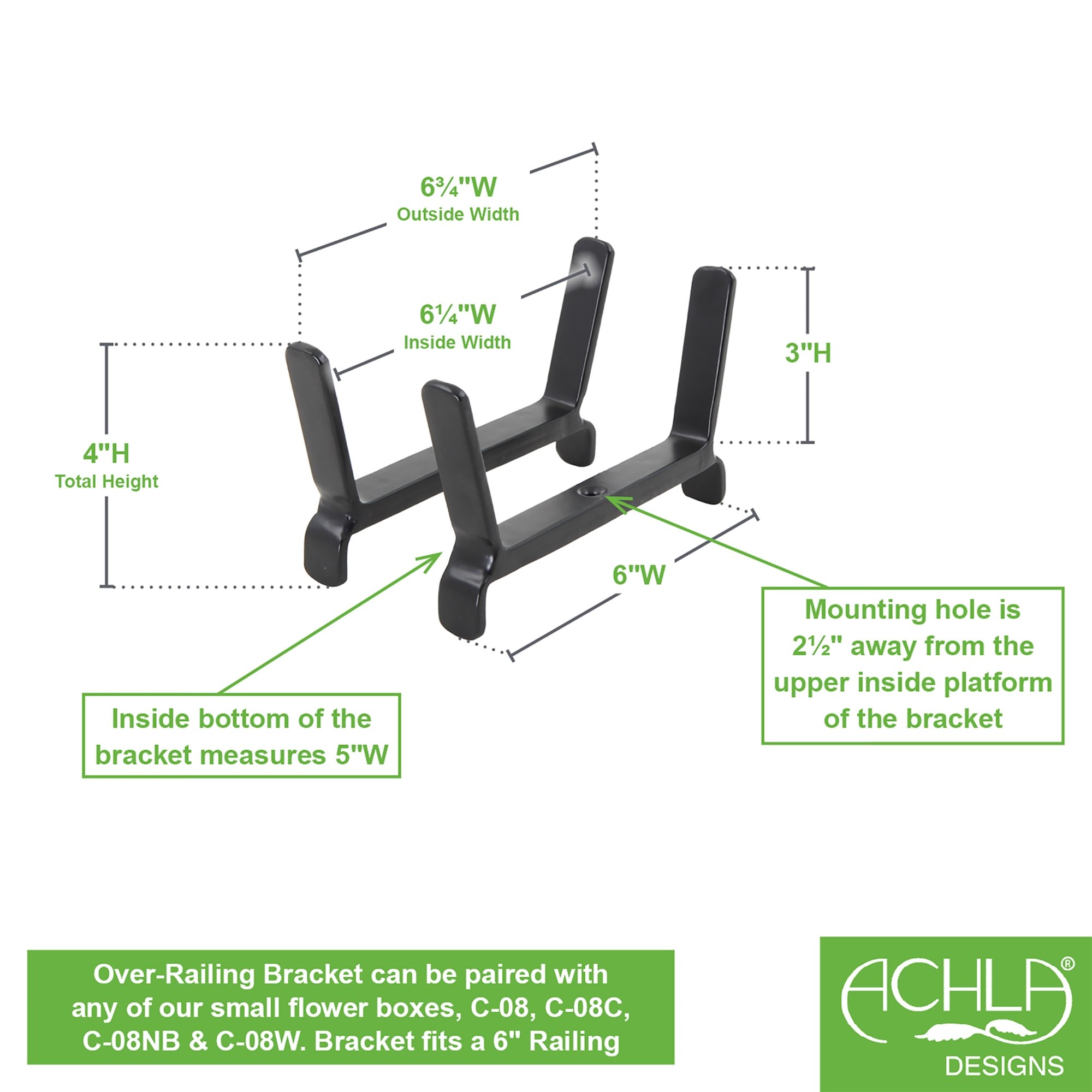 Add curb appeal to a front porch, create a container garden, or decorate with seasonal plantings on a balcony or deck. Our 6-inch Flower Box Brackets for 2 x 6 Railings can be fixed to the top of a railing to securely hold any of our Achla Designs Small Galvanized and Copper Flower Boxes. For simple installation, place the two brackets at the desired width apart and secure with stainless steel screws provided. Also available in 8-inch, to hold Medium and 10-inch, to hold Large Flower Boxes for 2 x 6 inch Railings.