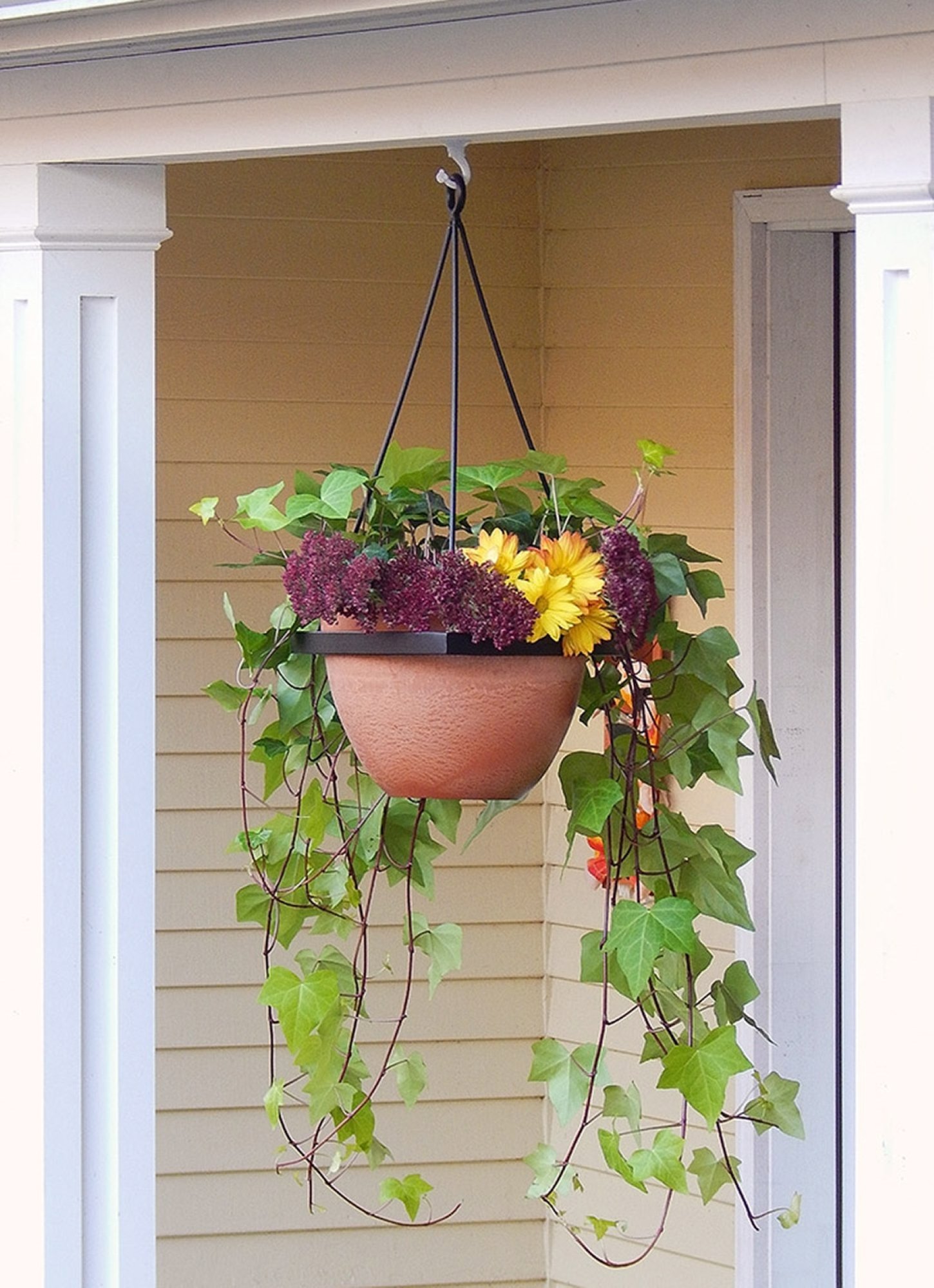 The Lina Planter is a contemporary style plant hanger for the modern home or container garden, with attractive minimalist design that is simple and practical in its ease of use. Slip the ring around the planter from beneath, hook the end of each rod into the corner loop and hang from the o-hook at the top. Wrought iron plant hangers are available in two sizes, with or without polymer-blend planting pots in terra cotta, and a black powder coated finish for maximum weather resistance. Small Lina Planter pot is 8-in diameter, Large Lina Planter pot is 11 ¾-in diameter.