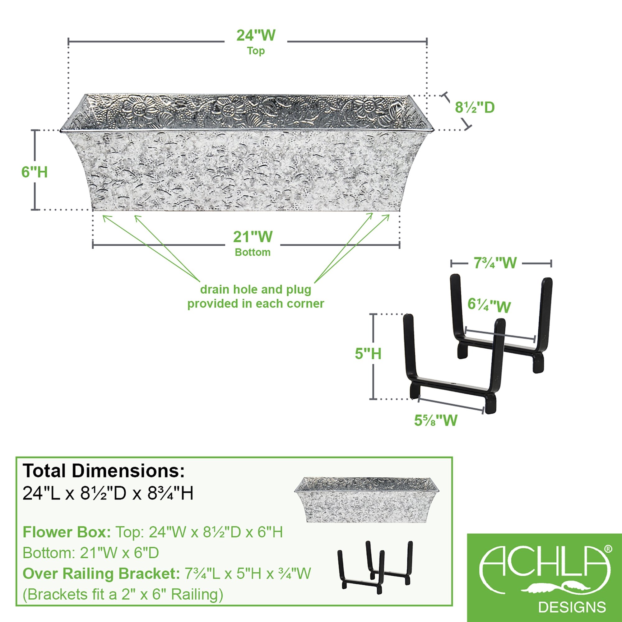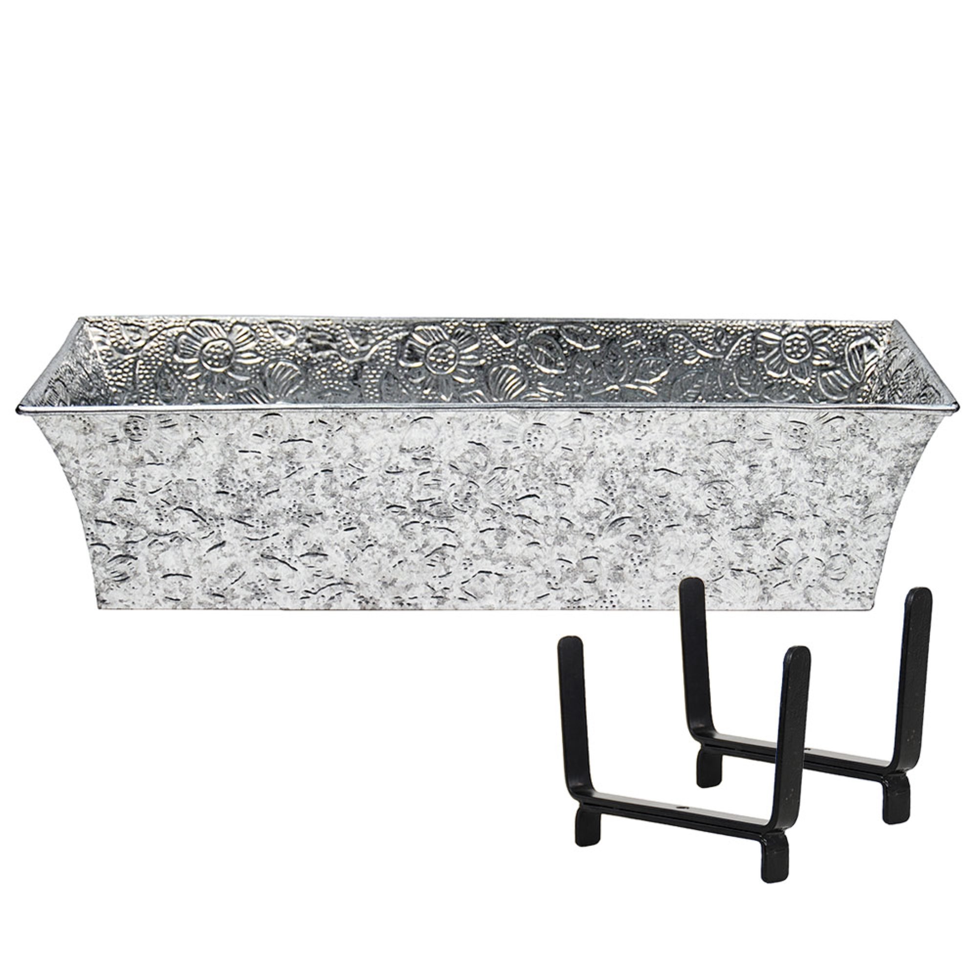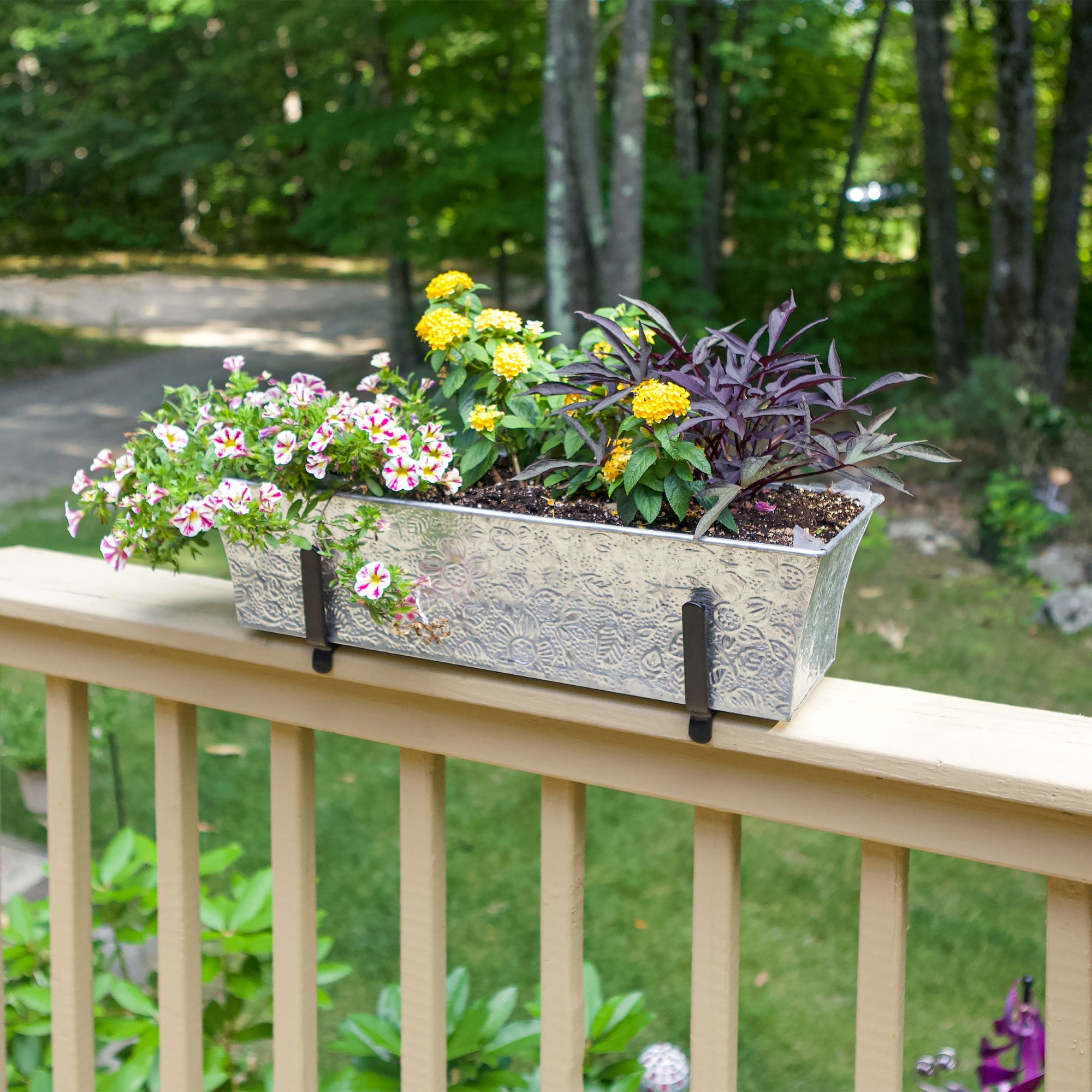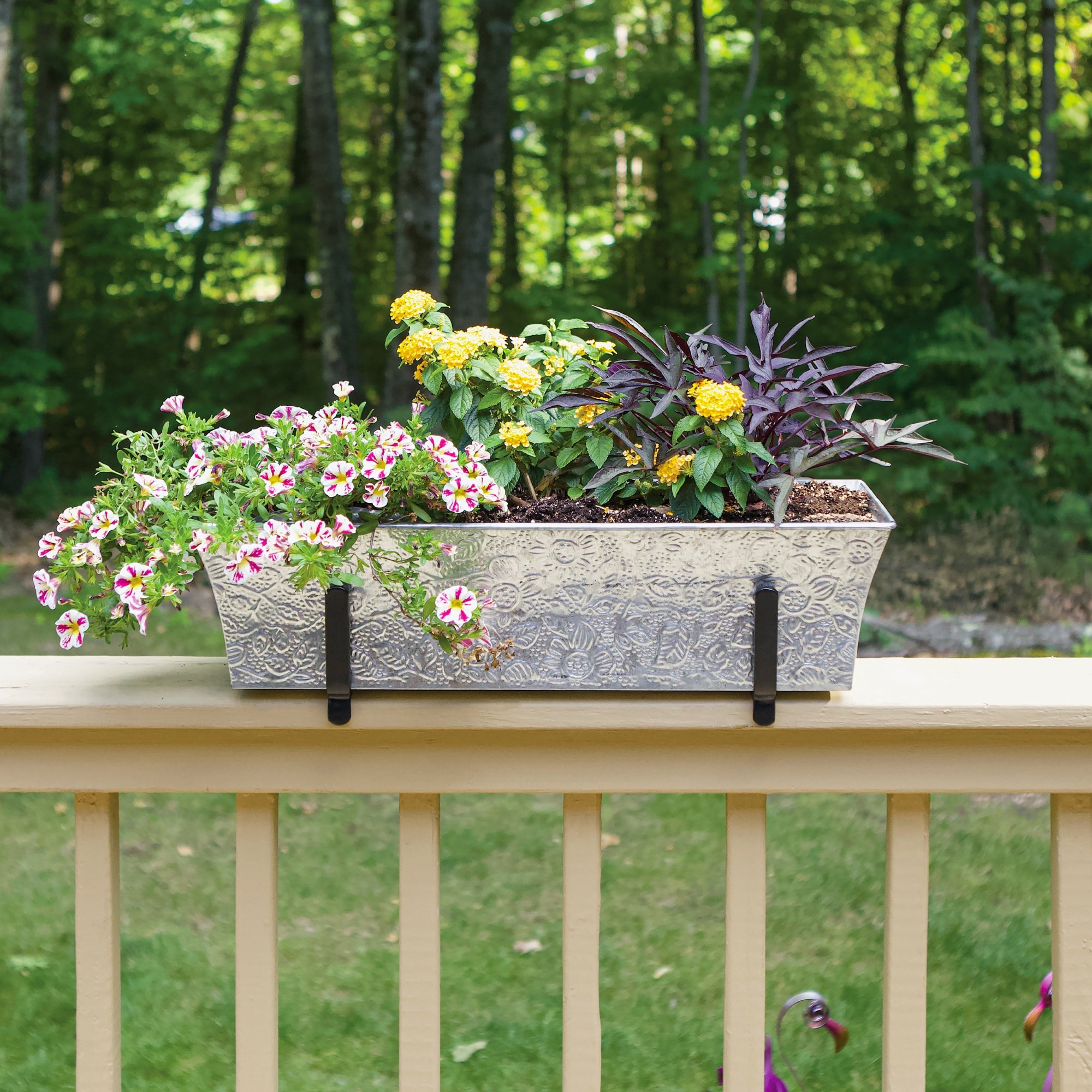 These dressed up Embossed Flower Boxes have a rolled edge, embossed floral pattern decoration and a tapered classic rectangular shape. Made from galvanized steel they have the folksy vintage quality of an antique market find. The included brackets are designed to securely hold flower boxes to the top of a deck or porch railing. Fasten the brackets down to the rail at your preferred distance apart and boxes are captured within the U-shaped holder. In two widths to fit standard 4 and 6 inch railings.