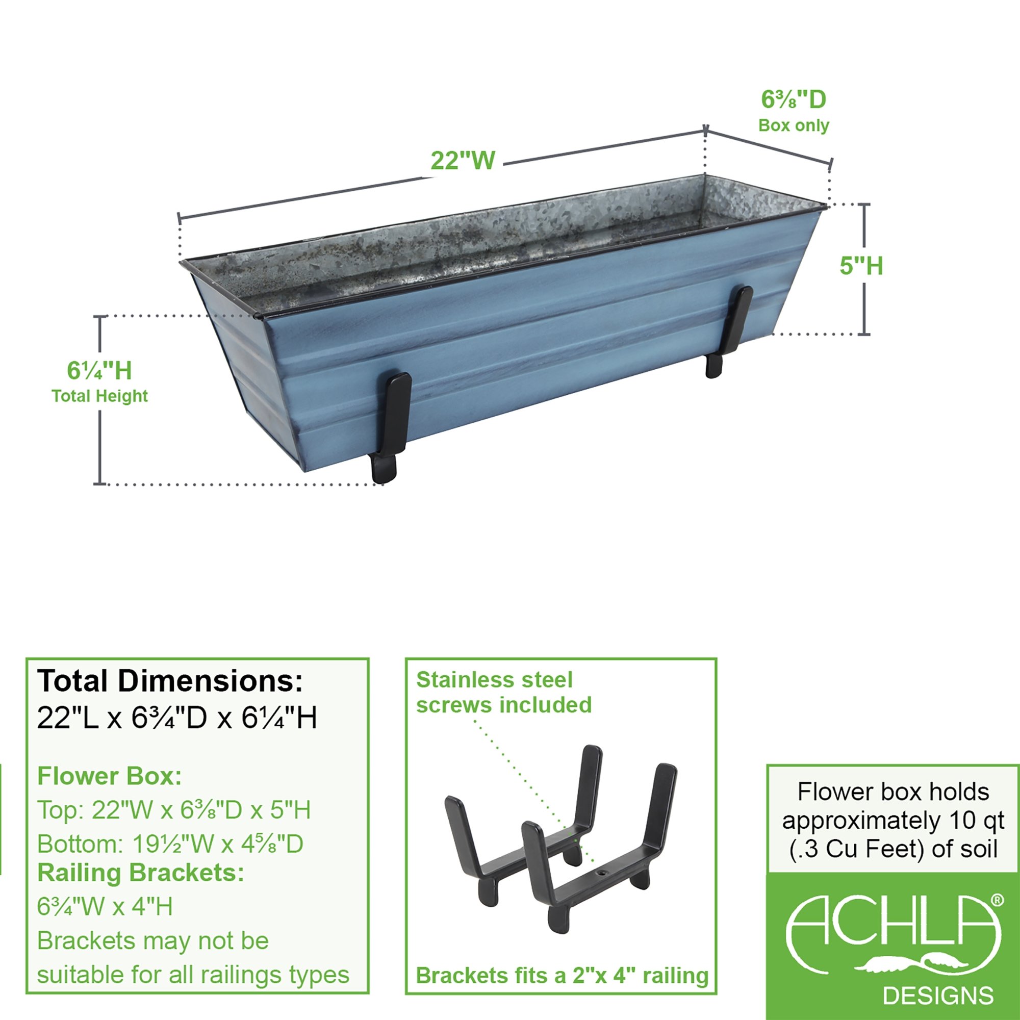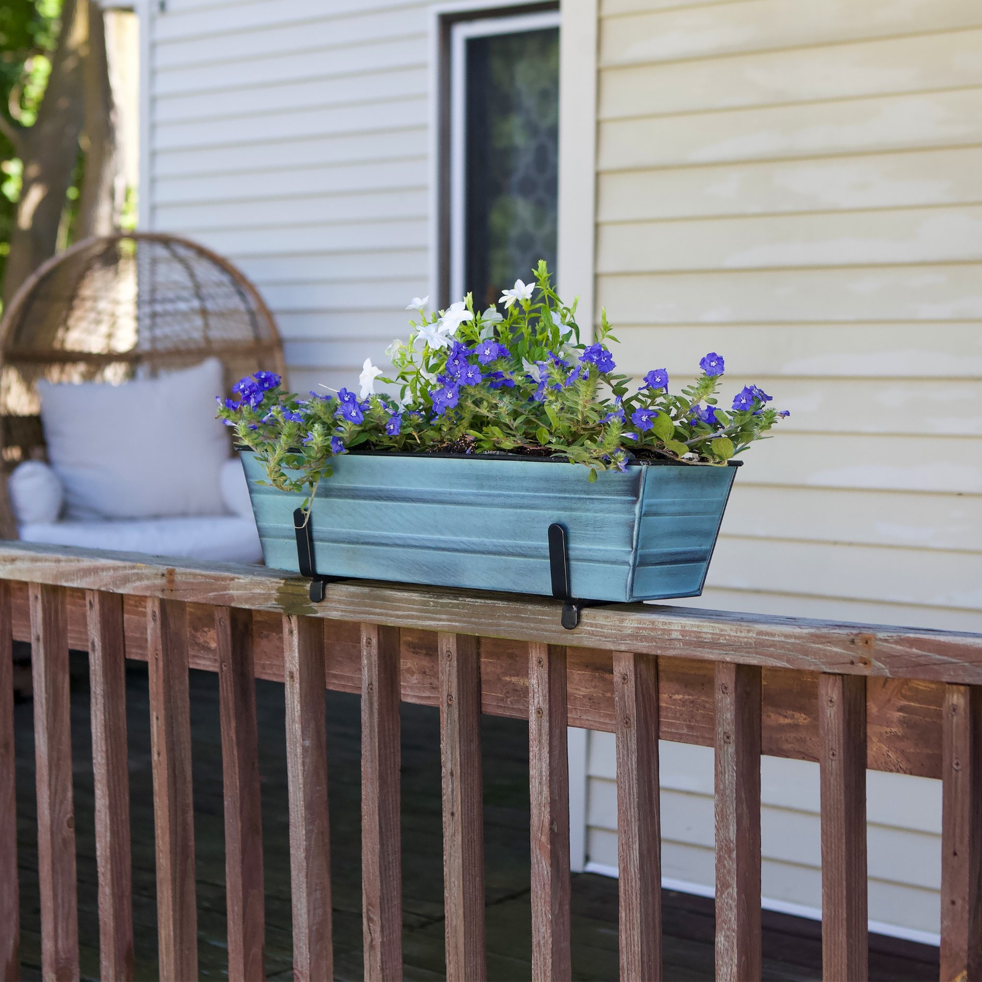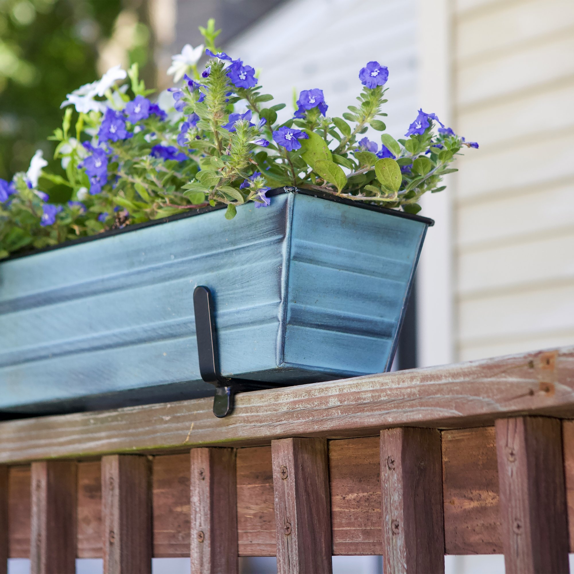 Add curb appeal to a front porch, create a container garden, or decorate with seasonal plantings on a balcony or deck. Our Small Flower Box Kit for 2 x 4 Railings has two top-mounted brackets that simply and securely hold our Small Nantucket Blue Galvanized Flower Box planter. For easy installation, place the two wrought iron brackets at the desired width apart and secure with stainless steel screws provided. Fill the box with your choice of planting and place within the brackets. Kits are also available for 2 x 6 inch railings for Medium and Large Flower Boxes, in all four Flower Box colors.