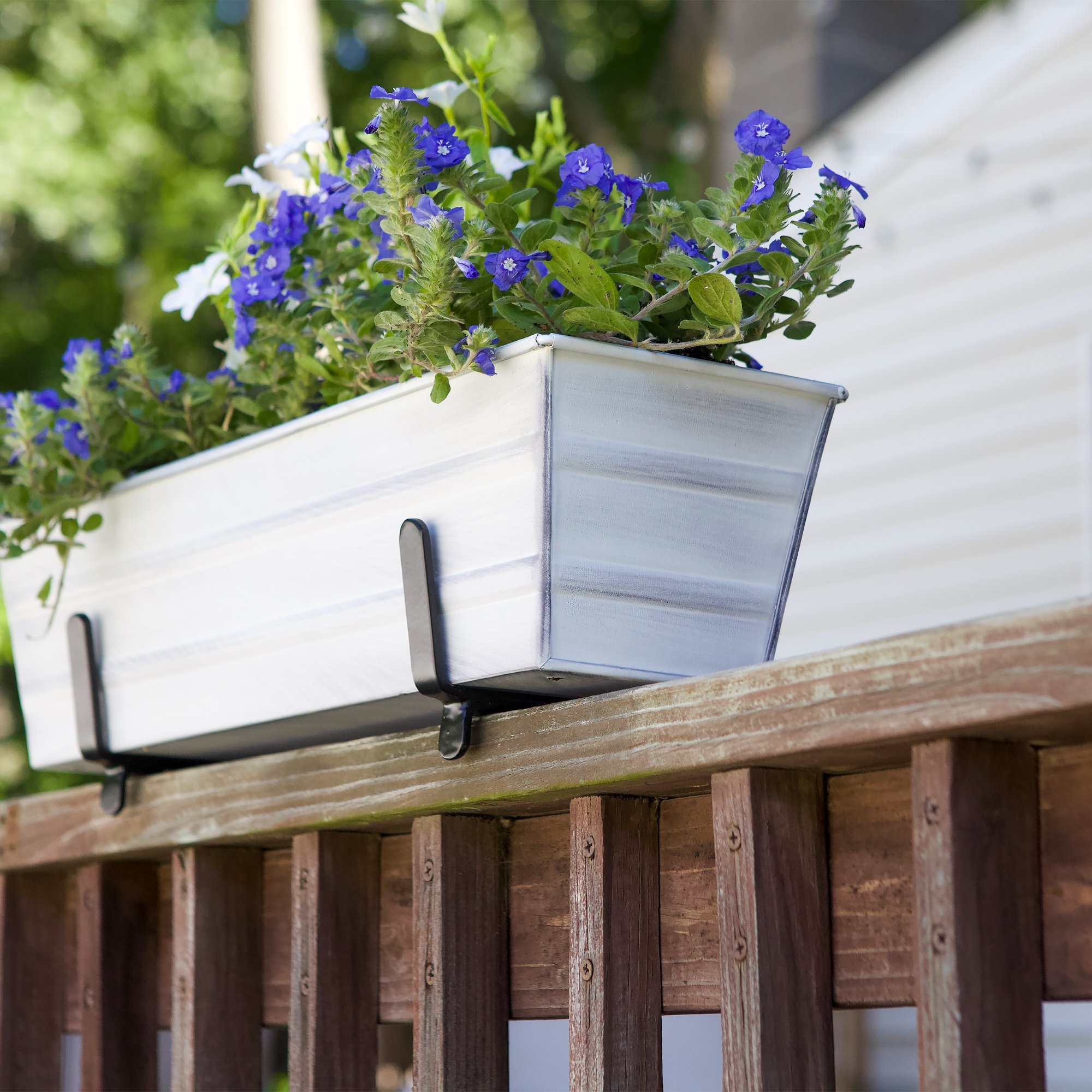 Add curb appeal to a front porch, create a container garden, or decorate with seasonal plantings on a balcony or deck. Our Small Flower Box Kit for 2 x 4 Railings has two top-mounted brackets that simply and securely hold our Small Cape Cod White Galvanized Flower Box planter. For easy installation, place the two wrought iron brackets at the desired width apart and secure with stainless steel screws provided. Fill the box with your choice of planting and place within the brackets. Kits are also available for 2 x 6 inch railings for Medium and Large Flower Boxes, in all four Flower Box colors.