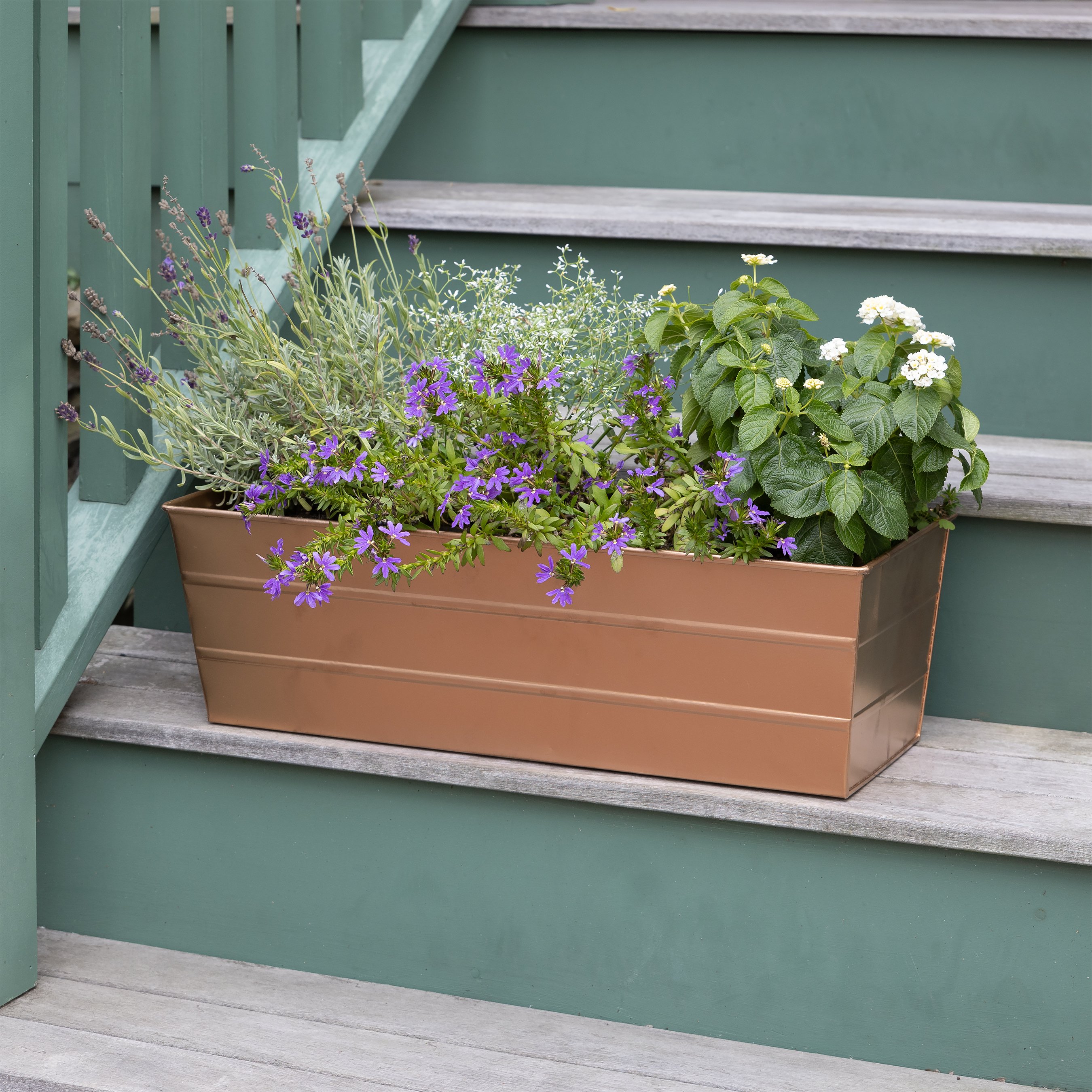 Available in three size options, these rectangular flower boxes have a rolled edge, embossed lines and a simple classic style. Made from Galvanized Steel, in three Patina finish colors, these planting containers will add curb appeal. Use them to create a lush container garden or urban balcony oasis. The Copper Plated Flower Boxes will develop warm natural patina over time that is a perfect complement to green foliage. All sizes and colors are also available in kits with Wall-Mount, Rail-Mount or Clamp-On Brackets.