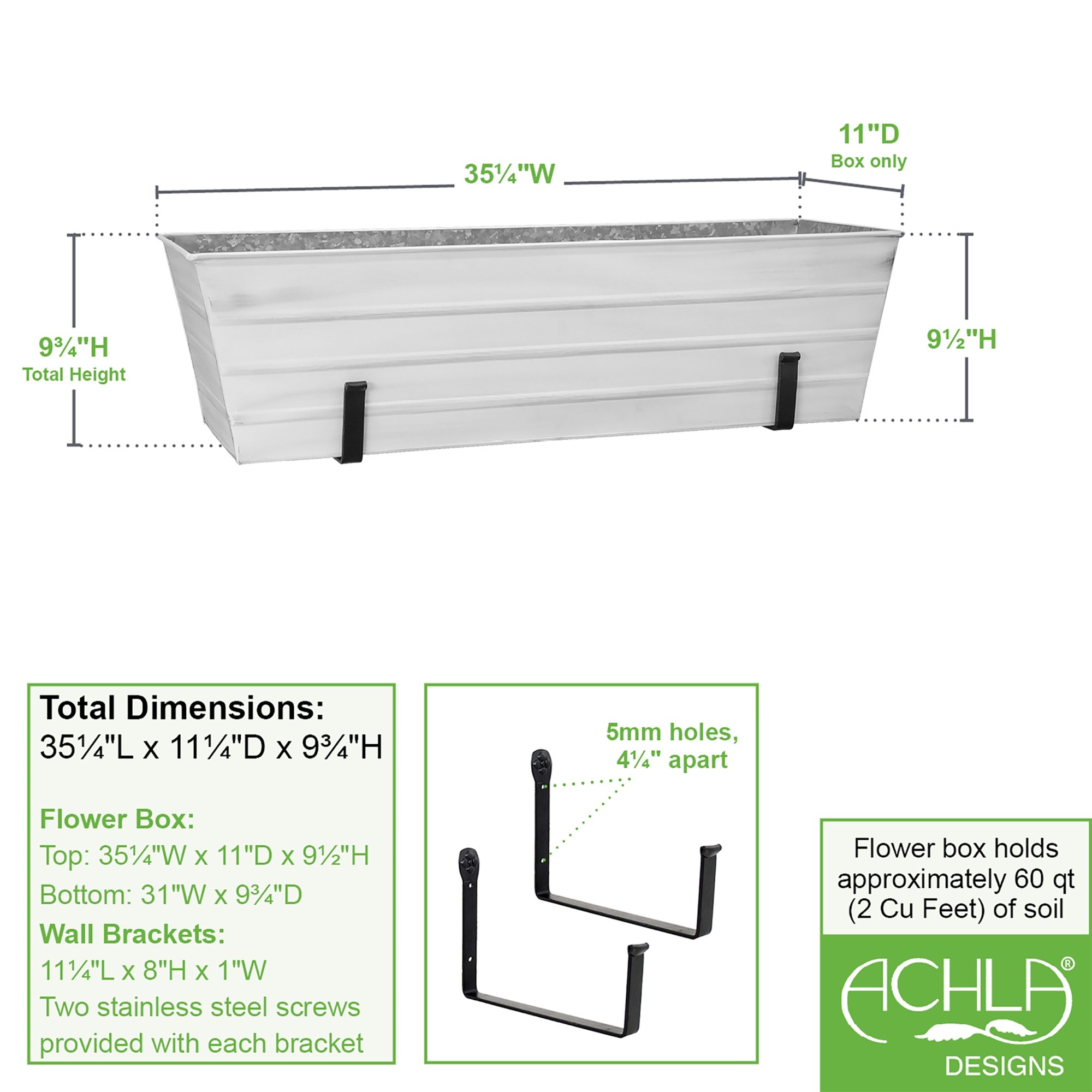 Add curb appeal to a front porch, create a container garden, or decorate with seasonal plantings on a balcony or deck. This Large White Flower Box Kit with Wall Brackets has two wall-mounted brackets that simply and securely hold our Large Cape Cod White Galvanized Flower Box planter. The sturdy brackets are made from wrought iron with a durable Black powder coated Finish. For easy installation, place the two wall brackets at the desired width apart and secure with stainless steel screws provided. Fill the box with favorite plants and place within the brackets. Kits are available in all four Flower Box colors, in three sizes, or with top-mounted Railing Brackets.