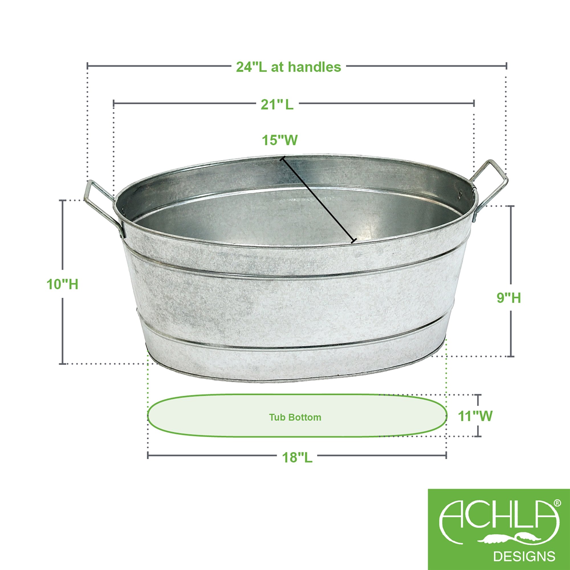 Our Achla Designs galvanized steel tubs have a classic design that makes them perfect for a variety of decorative and functional purposes. These are the same steel tubs found on farms across the country because of their versatility and durability. Reminiscent of dairy cows and general stores, these steel tubs can give even the most urban garden a rustic country charm. These tubs make great ice buckets, with two handles on the sides to carry your chilled drinks out into the yard for an outdoor party. Use them as planters for your favorite flowers, or a vegetable container garden. So handy, you can also use the tub for washing the dog, or for holding firewood during the winter.
