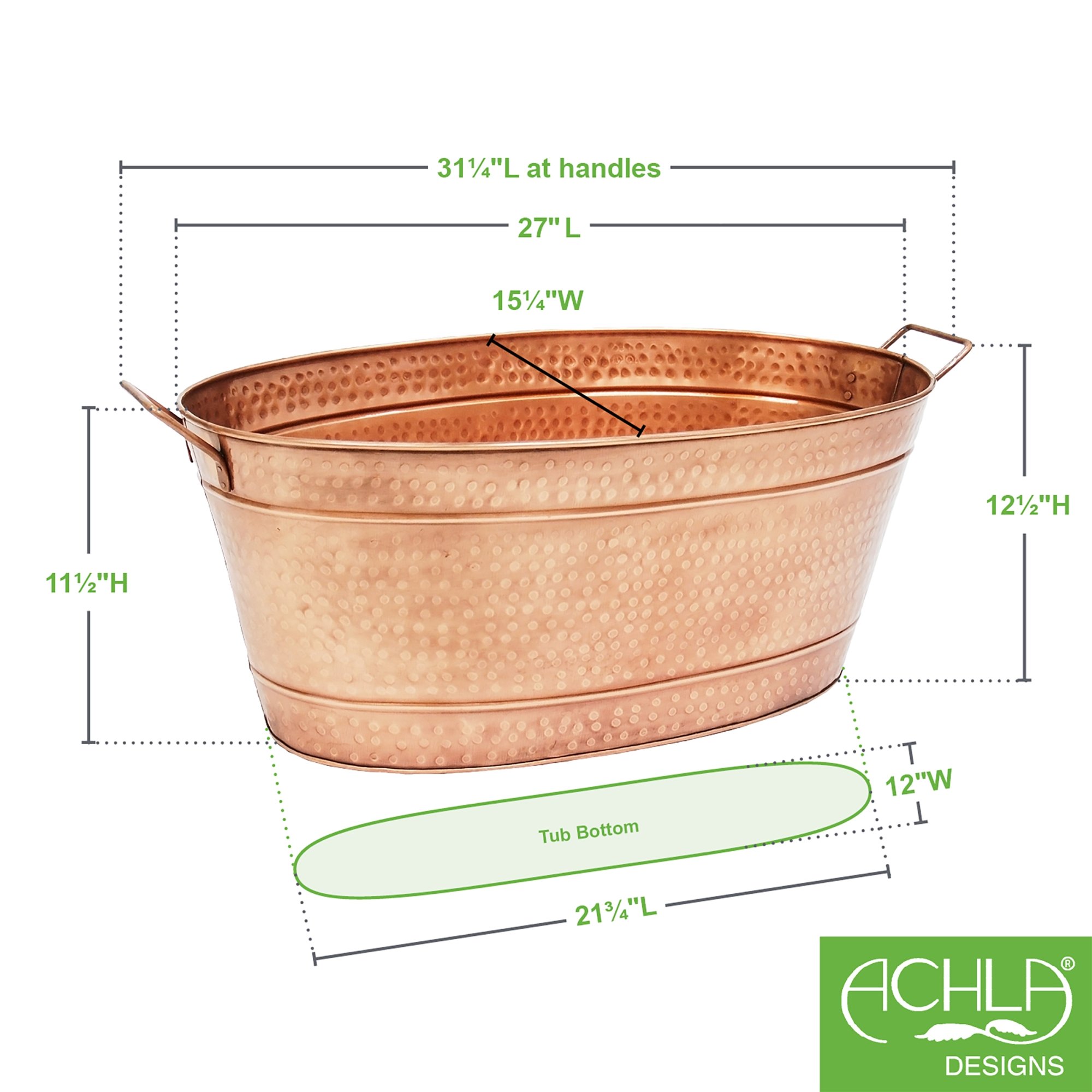 Our Achla Designs Copper plated galvanized steel tubs have a classic design with an upscale finish that makes them perfect for a variety of decorative and functional purposes. These are the same steel tubs found on farms across the country because of their versatility and durability. Reminiscent of dairy cows and general stores, these steel tubs can give even the most urban garden a rustic country charm. These tubs make great ice buckets, with two handles on the sides to carry your chilled drinks out into the yard for an outdoor party. Use them as planters for your favorite flowers, or a vegetable container garden. So handy, you can also use the tub for washing the dog, or for holding firewood during the winter.