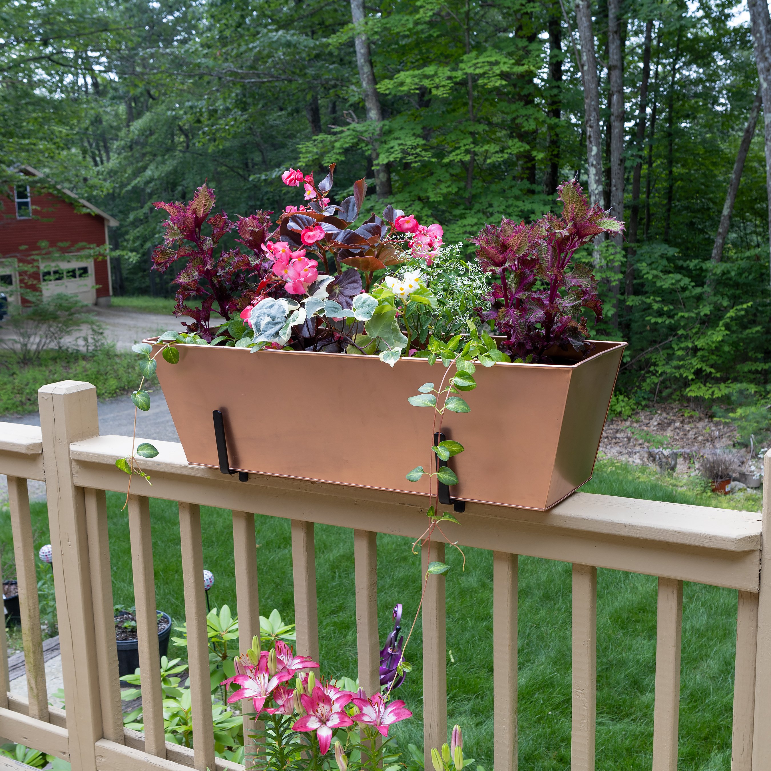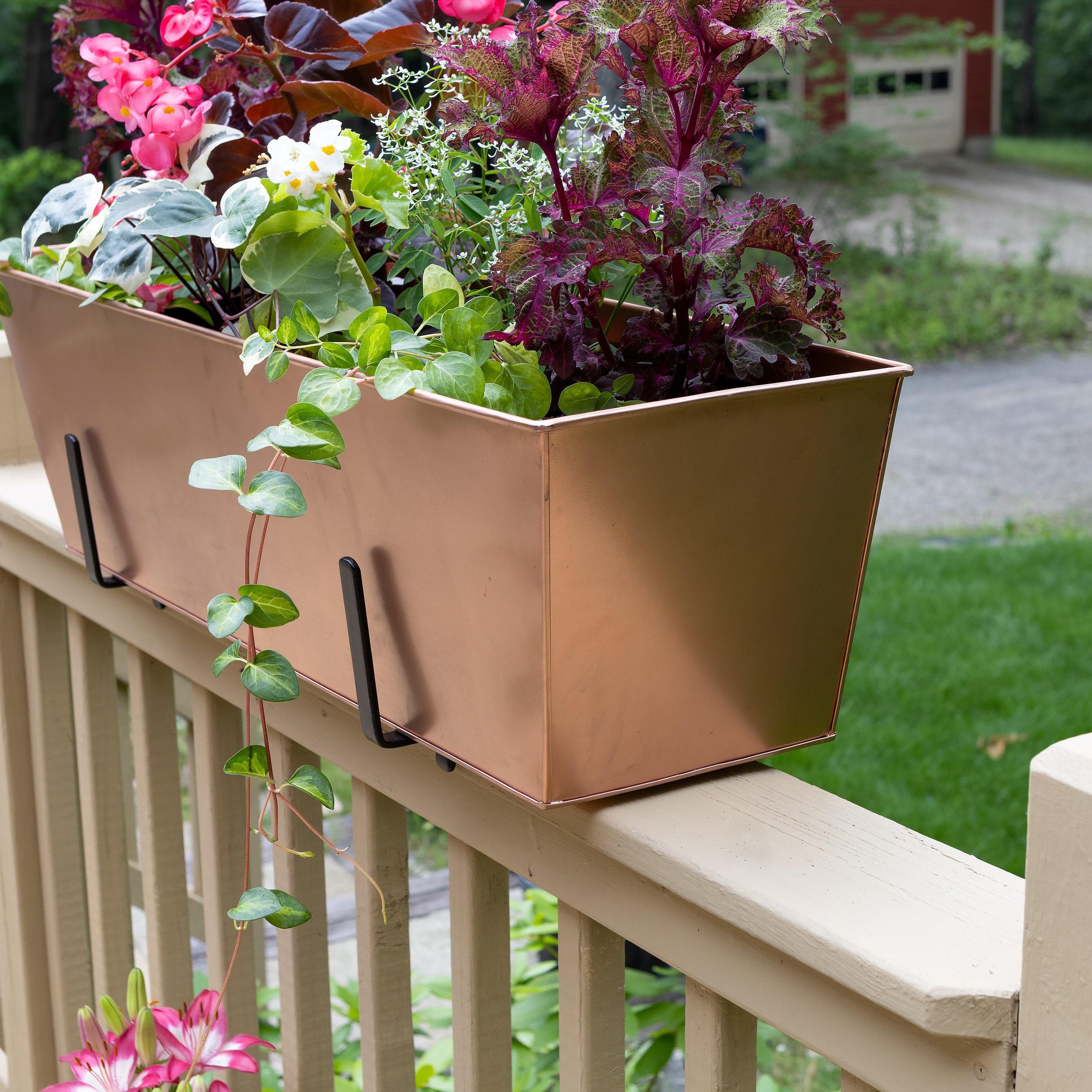 Available in two sizes, these rectangular flower boxes have a rolled edge and a simple classic style. Made from Galvanized Steel with Copper Plating, these planting containers will add curb appeal. Use them to create a lush container garden or urban balcony oasis. Plain Copper Flower Boxes will develop warm natural patina over time that is a perfect complement to green foliage. Smallest pairs with Posy Flower Box Bracket (VFB-02), Twist Flower Box Bracket (B-06), Handrail Bracket (BGK-13/14) Wall-Mounted Bracket (SFB-02) or Clamp-On Bracket (SFB-02C and Large pairs with Scrolls Bracket (B-32), Wall-Mounted Bracket (SFB-03) or Clamp-On Bracket (SFB-03C)