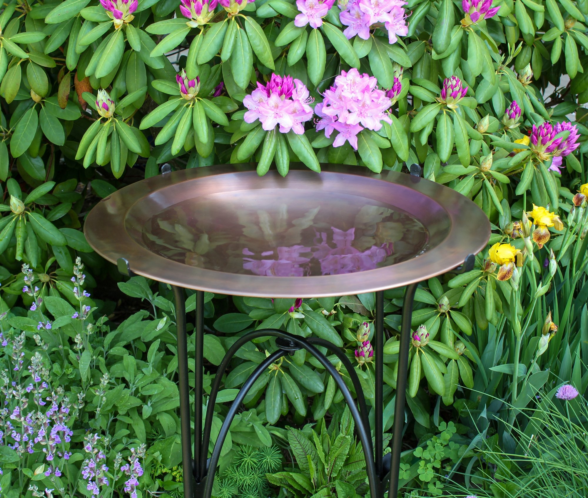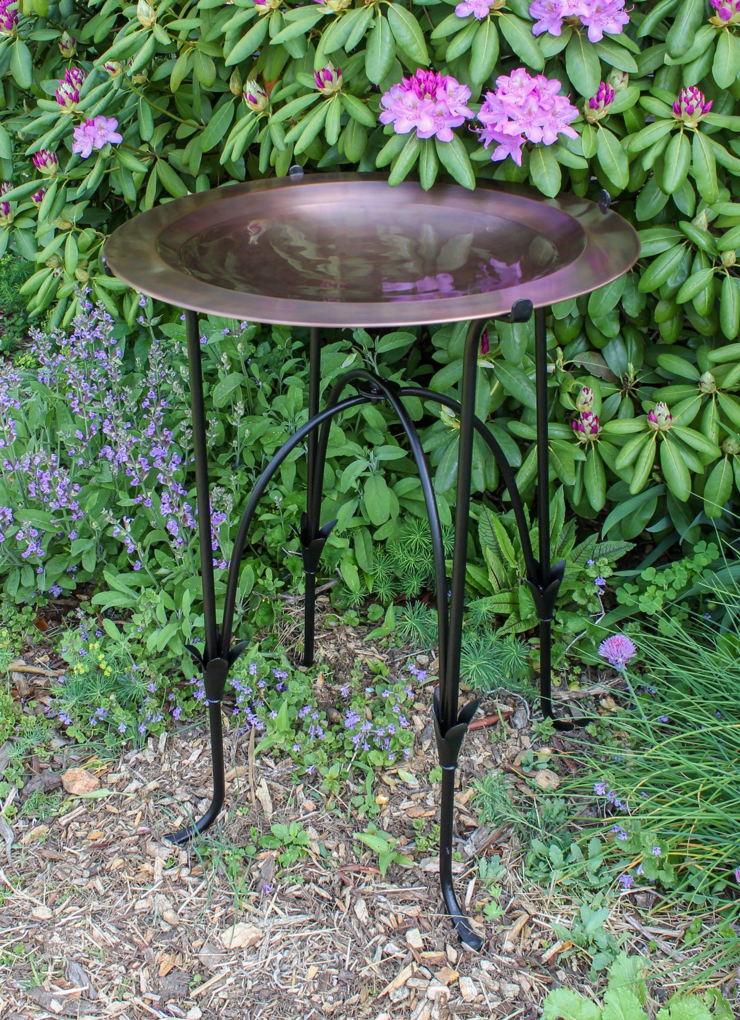 Our largest birdbath, the Phoebe Birdbath is a simple shallow bowl with a wide perching rim, made of brass with satin Antique Copper plated finish. The birdbath bowl fits atop a botanically-inspired wrought iron stand that is suitable for placement in garden beds or on hardscaped areas. The 24" Classic Copper Birdbath is a lovely statement piece for any planted area and a bird-friendly feature for the garden habitat.