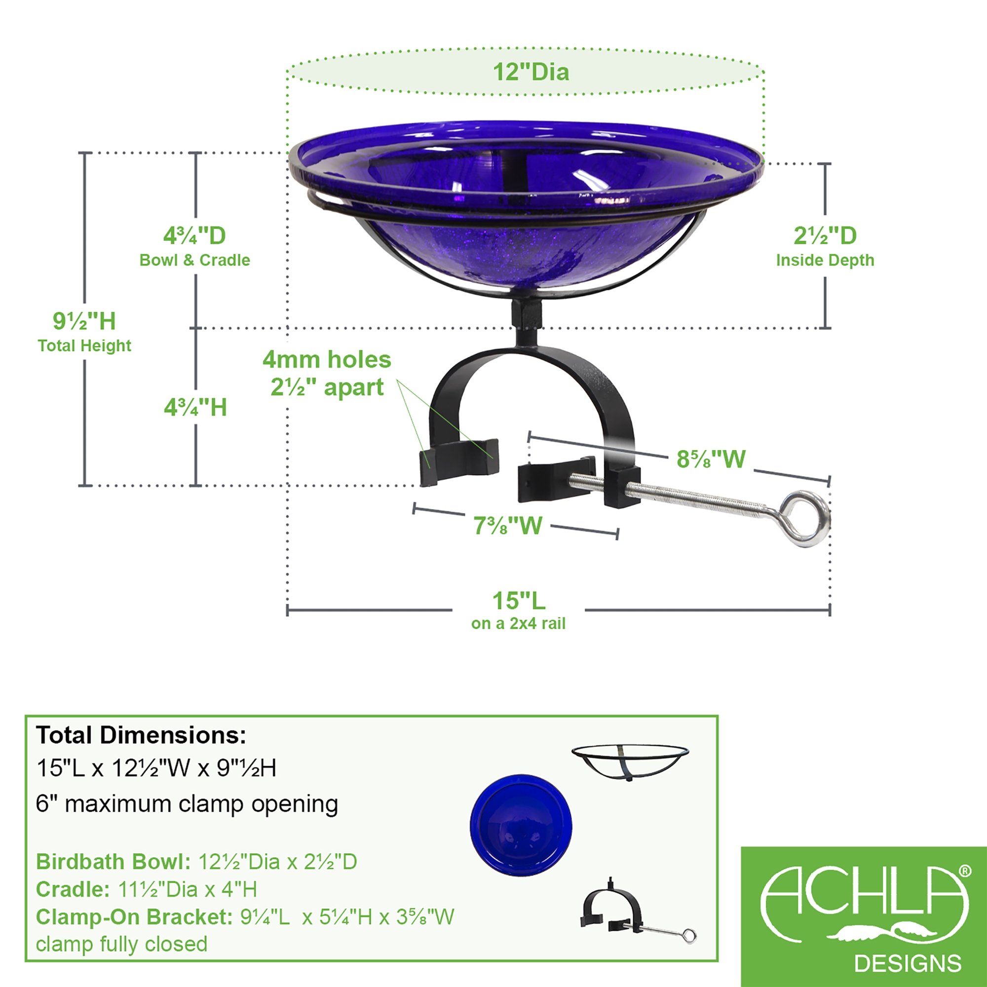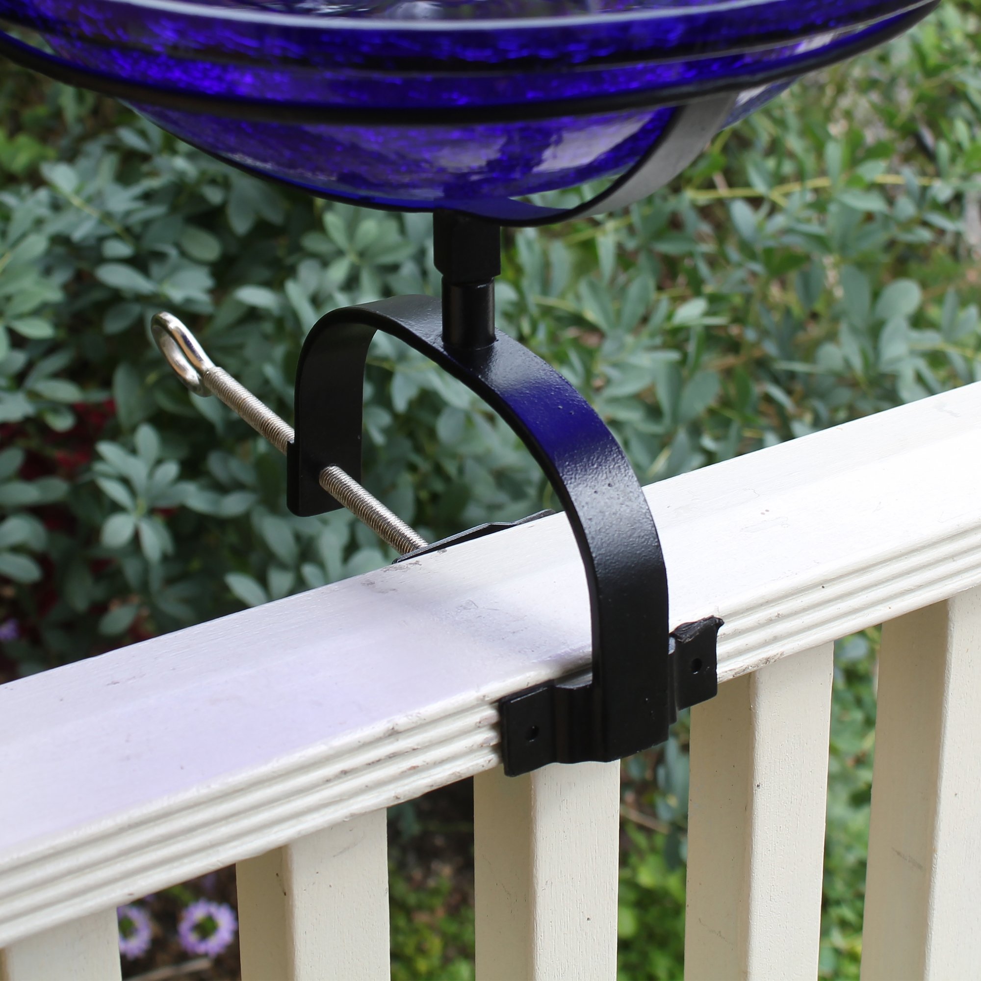 This brilliant Cobalt Blue Crackle Glass Birdbath will add a pop of color and support your local wildlife, even if you don't have a garden. The hand-blown glass bowl is held safely in a metal cradle that has a threaded base. The cradle base then attaches to the Over Railing Bracket. Ideal for porches, balconies or deck rails, the wrought iron bracket has C-type clamp that holds the bracket to the railing without need for drilling or permanent mounting.