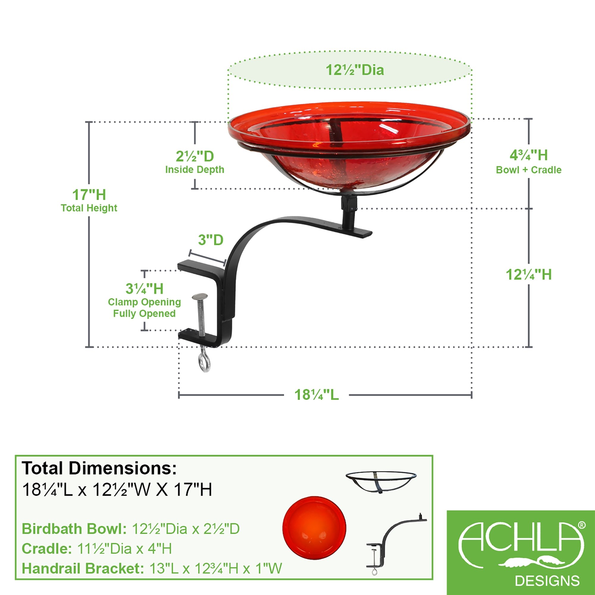 This brilliant Rail-Mounted tomato Red Crackle Glass Birdbath will add a pop of color and support your local wildlife, even if you don't have a garden. The hand-blown glass bowl is held safely in a metal cradle that has a threaded base. The cradle base then attaches to the handrail bracket. Ideal for porches, balconies or deck rails, the wrought iron bracket has C-type clamp that holds the bracket to the railing without need for drilling or permanent mounting.