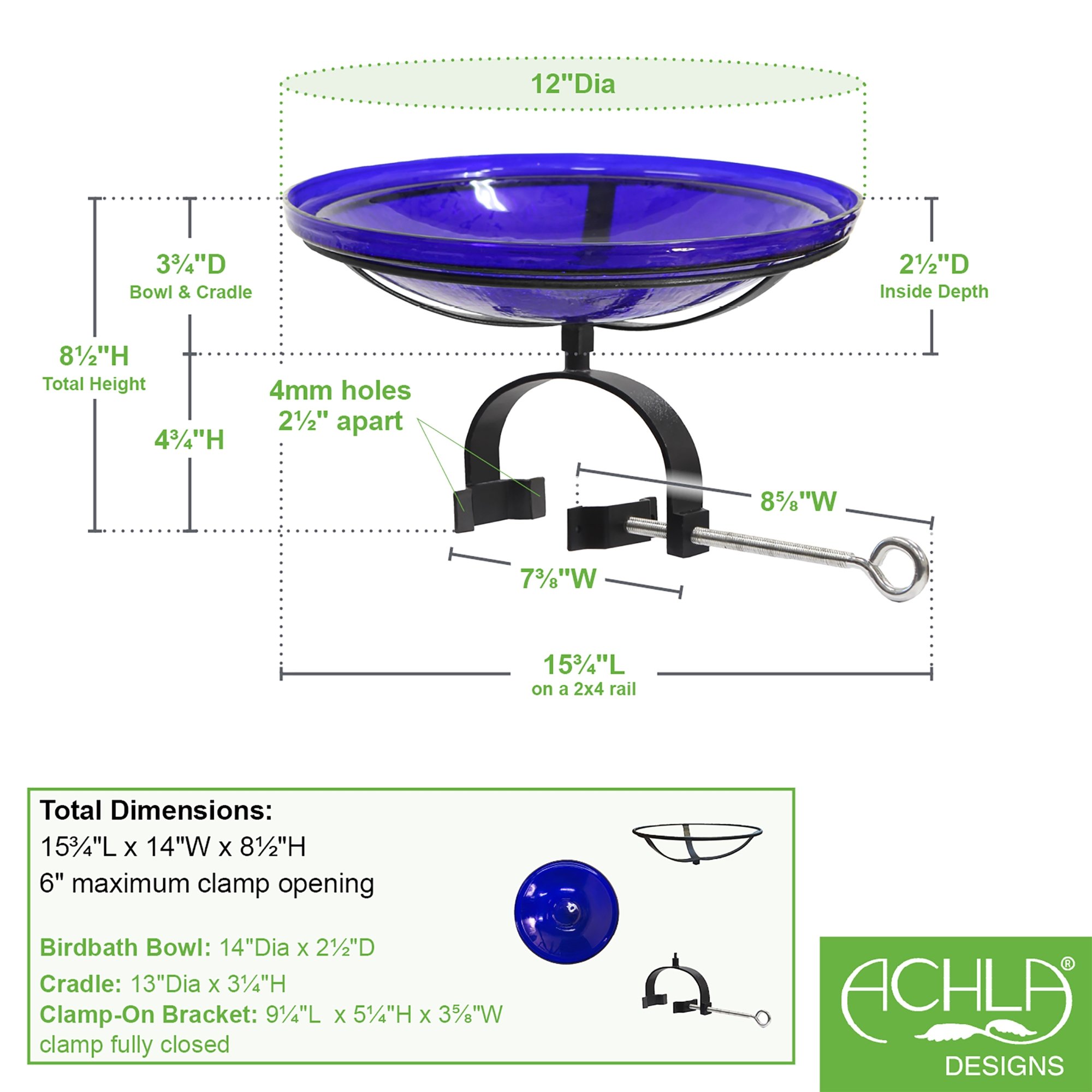 This brilliant Cobalt Blue Crackle Glass Birdbath will add a pop of color and support your local wildlife, even if you don't have a garden. The hand-blown glass bowl is held safely in a metal cradle that has a threaded base. The cradle base then attaches to the Over Railing Bracket. Ideal for porches, balconies or deck rails, the wrought iron bracket has C-type clamp that holds the bracket to the railing without need for drilling or permanent mounting.